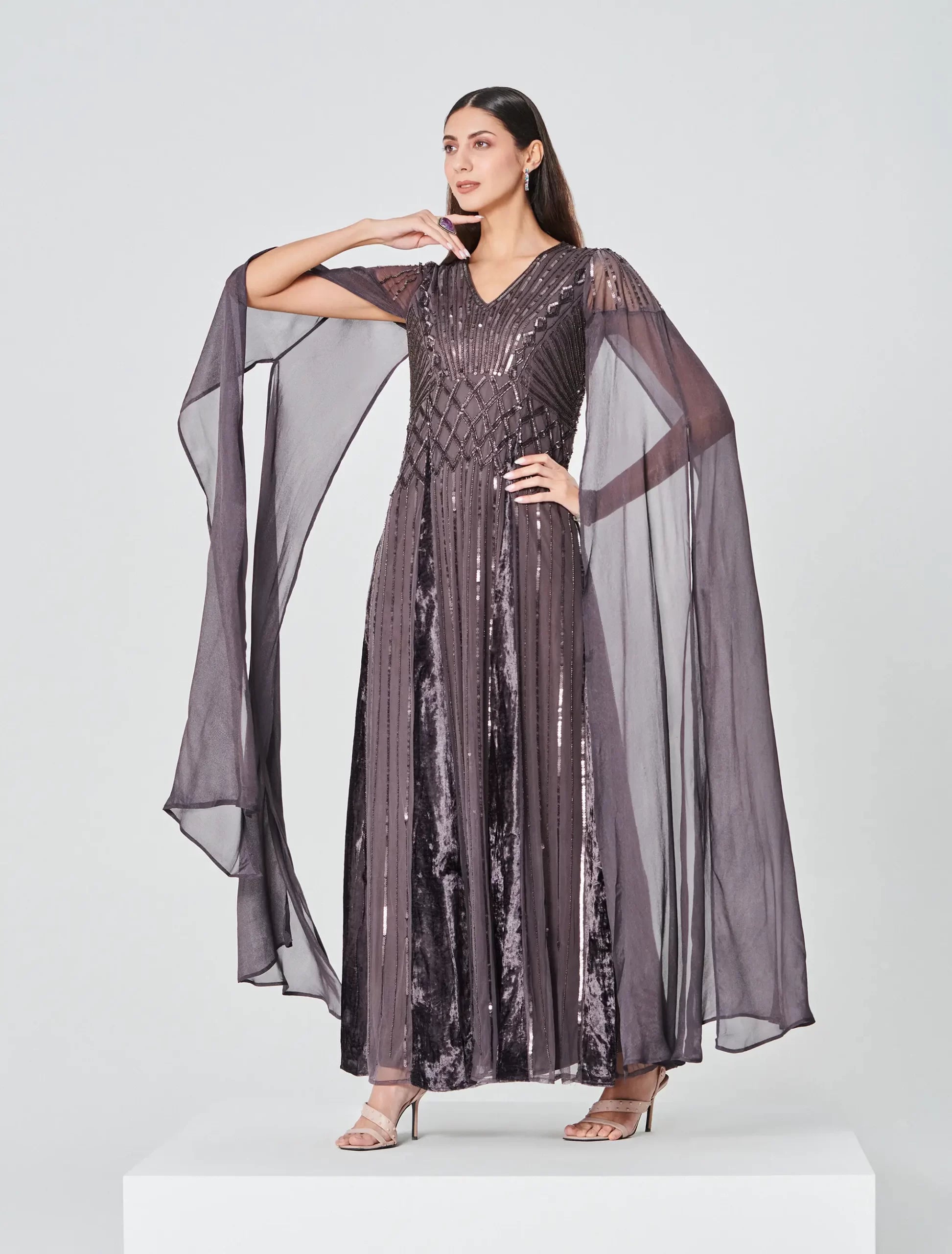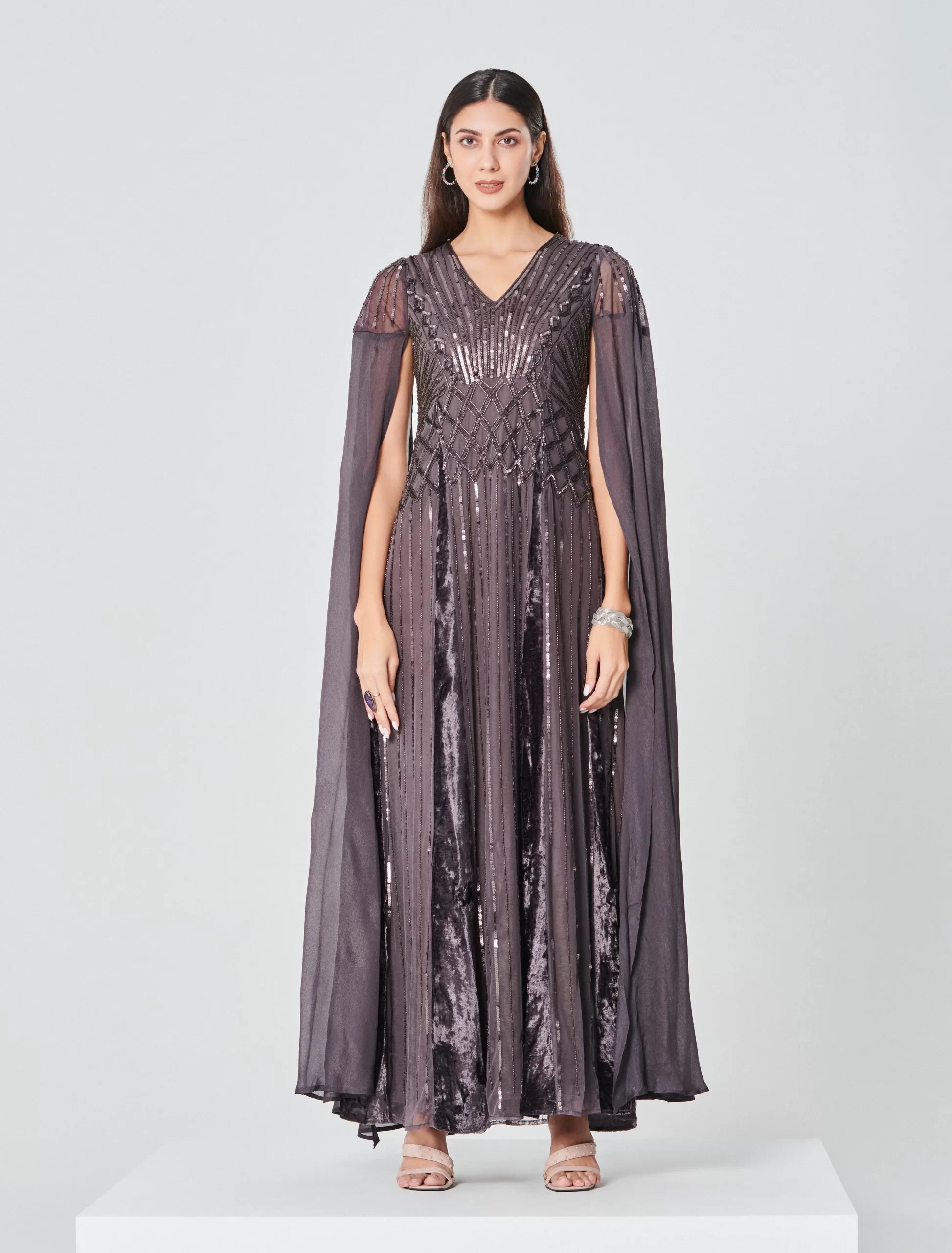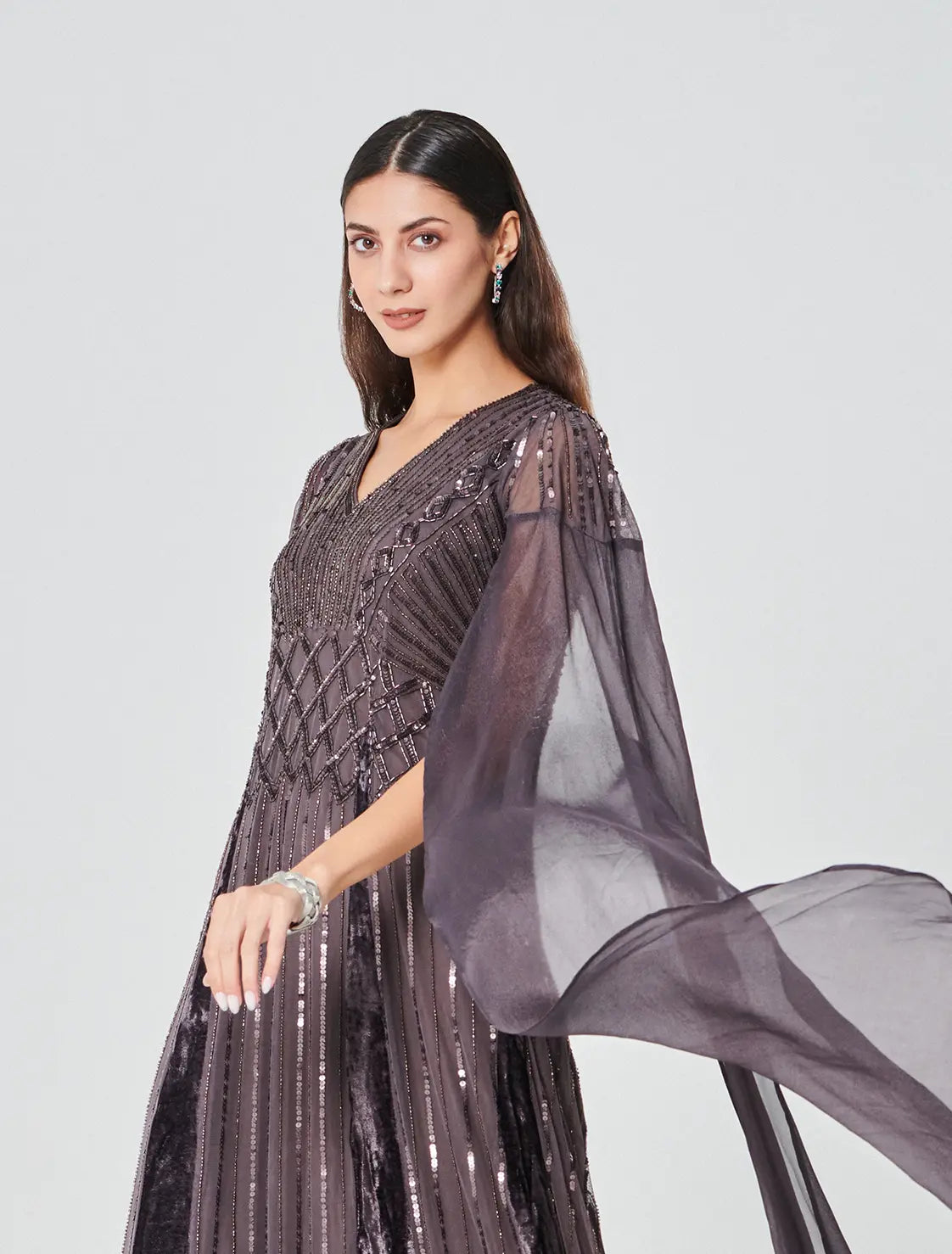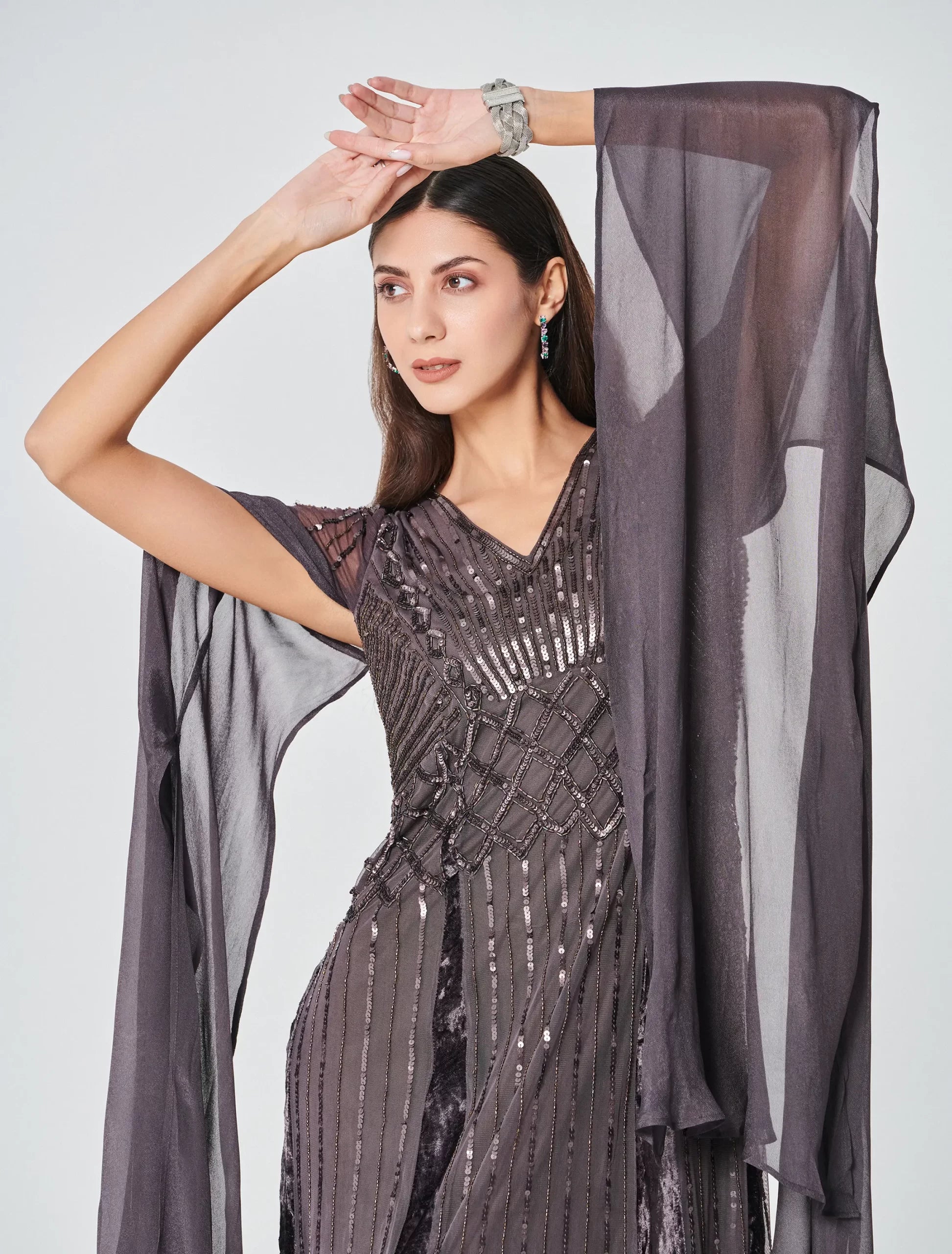 Step into royalty with Shalky’s “Salma” dark gray dress, designed to make you shine at your special occasions. This luxurious dress is crafted from gray georgette fabric with velvet and chiffon details, adorned with shimmering geometric embroidery. Measuring 60 inches in length, the dress features a V-neckline and elegant chiffon cape sleeves, adding a touch of magic and sophistication to your look.