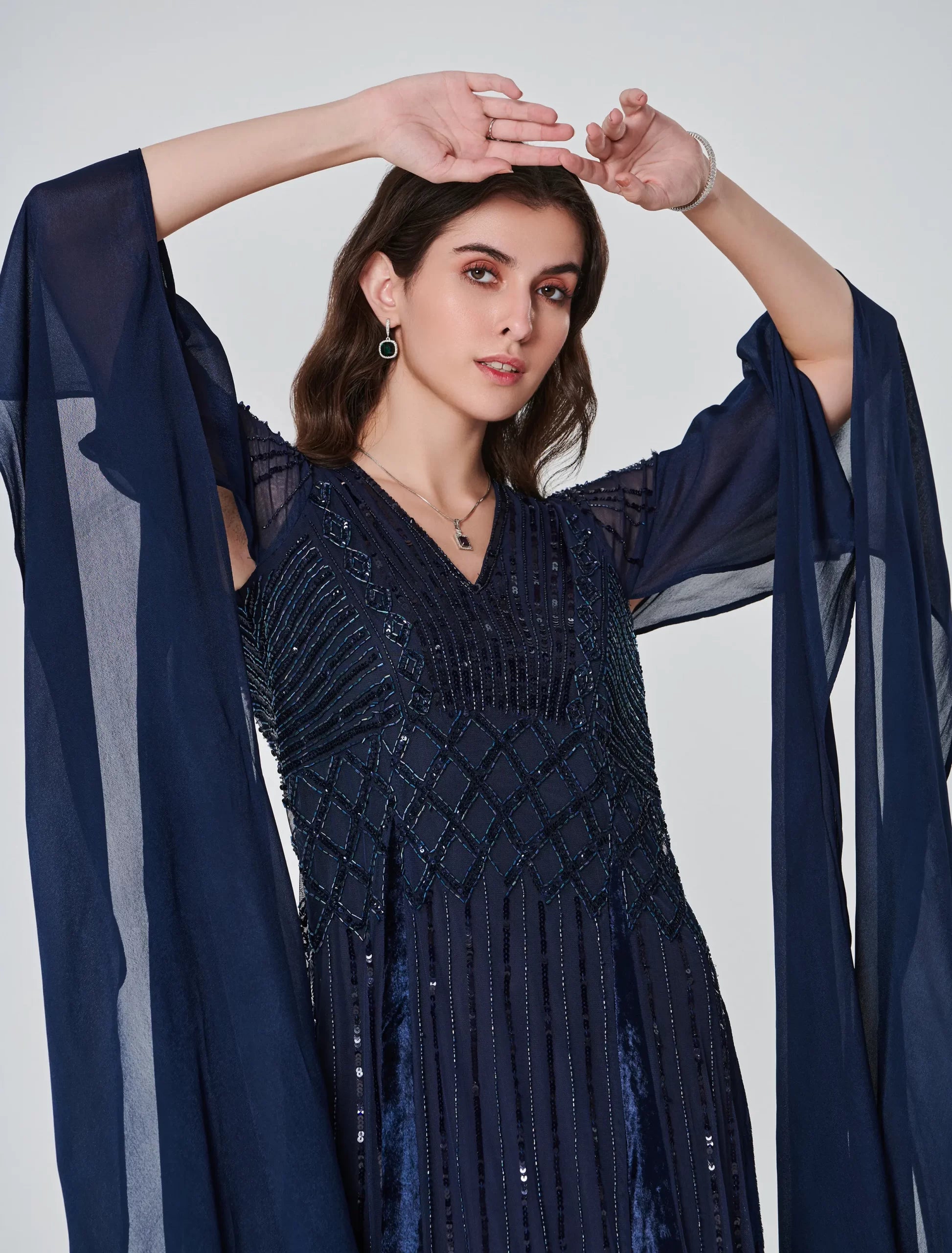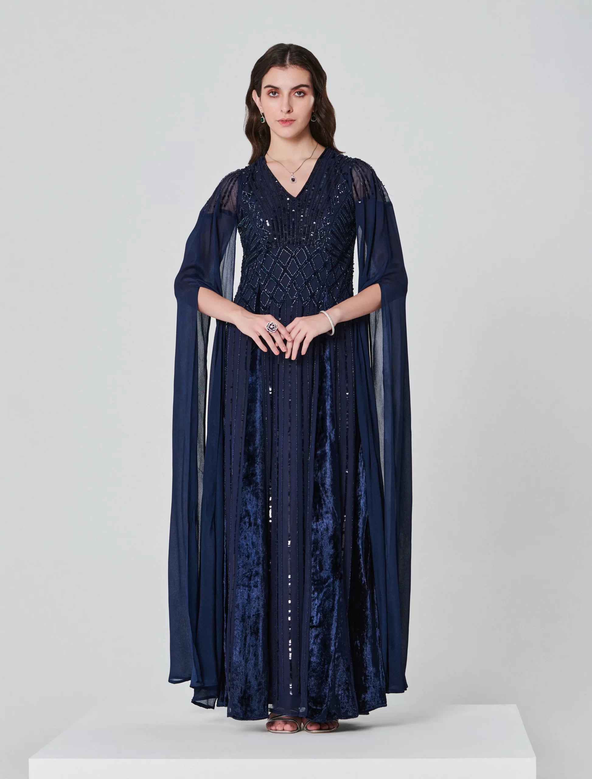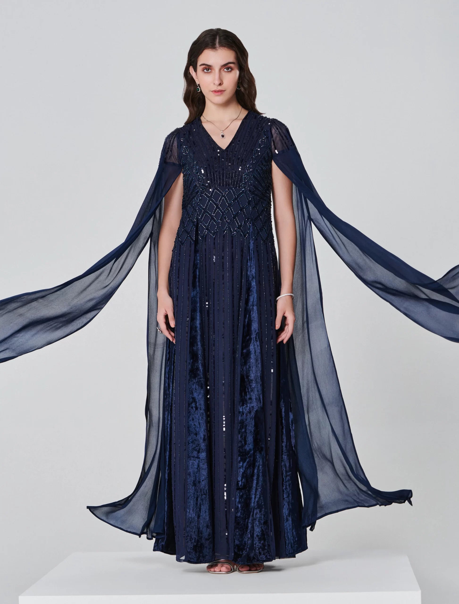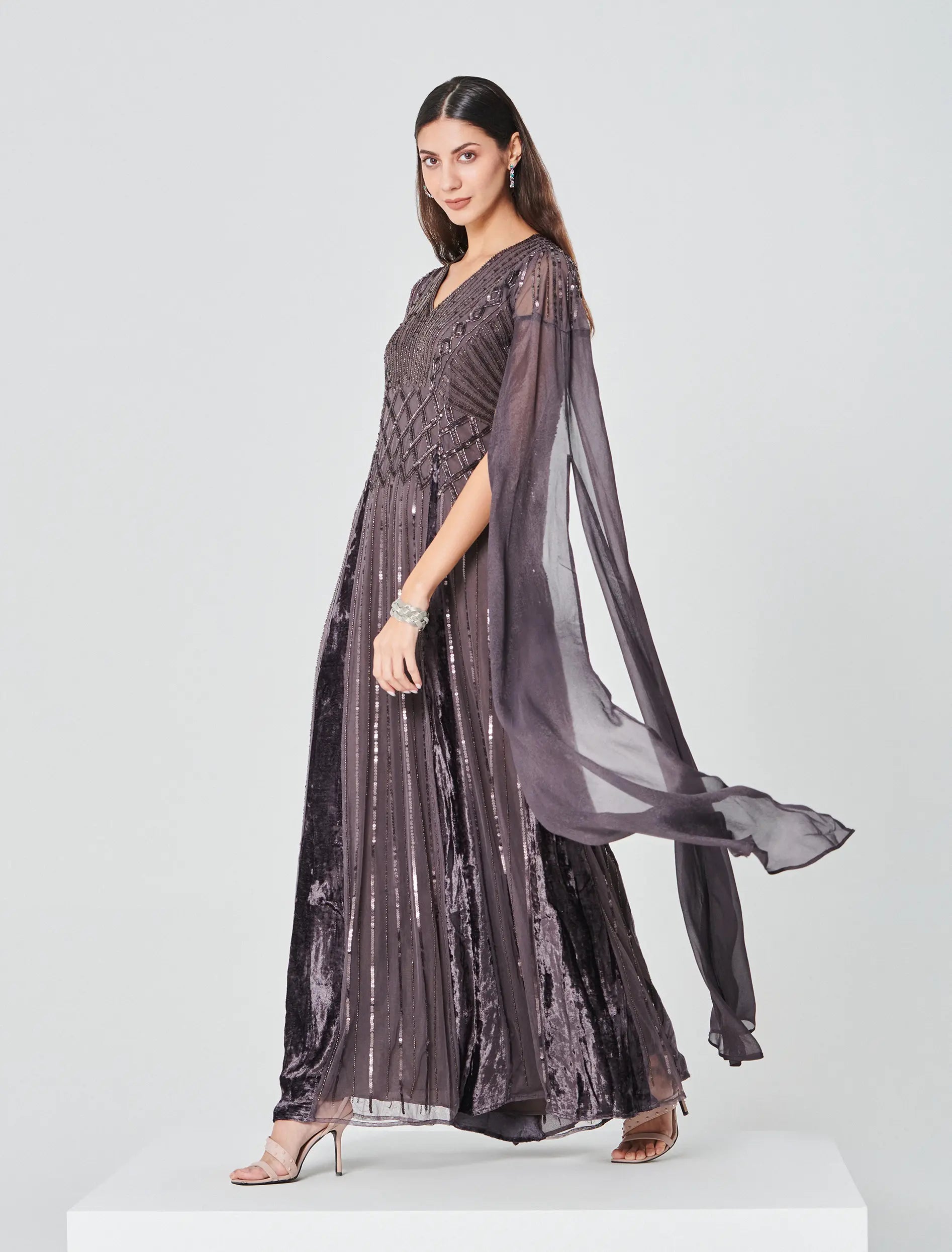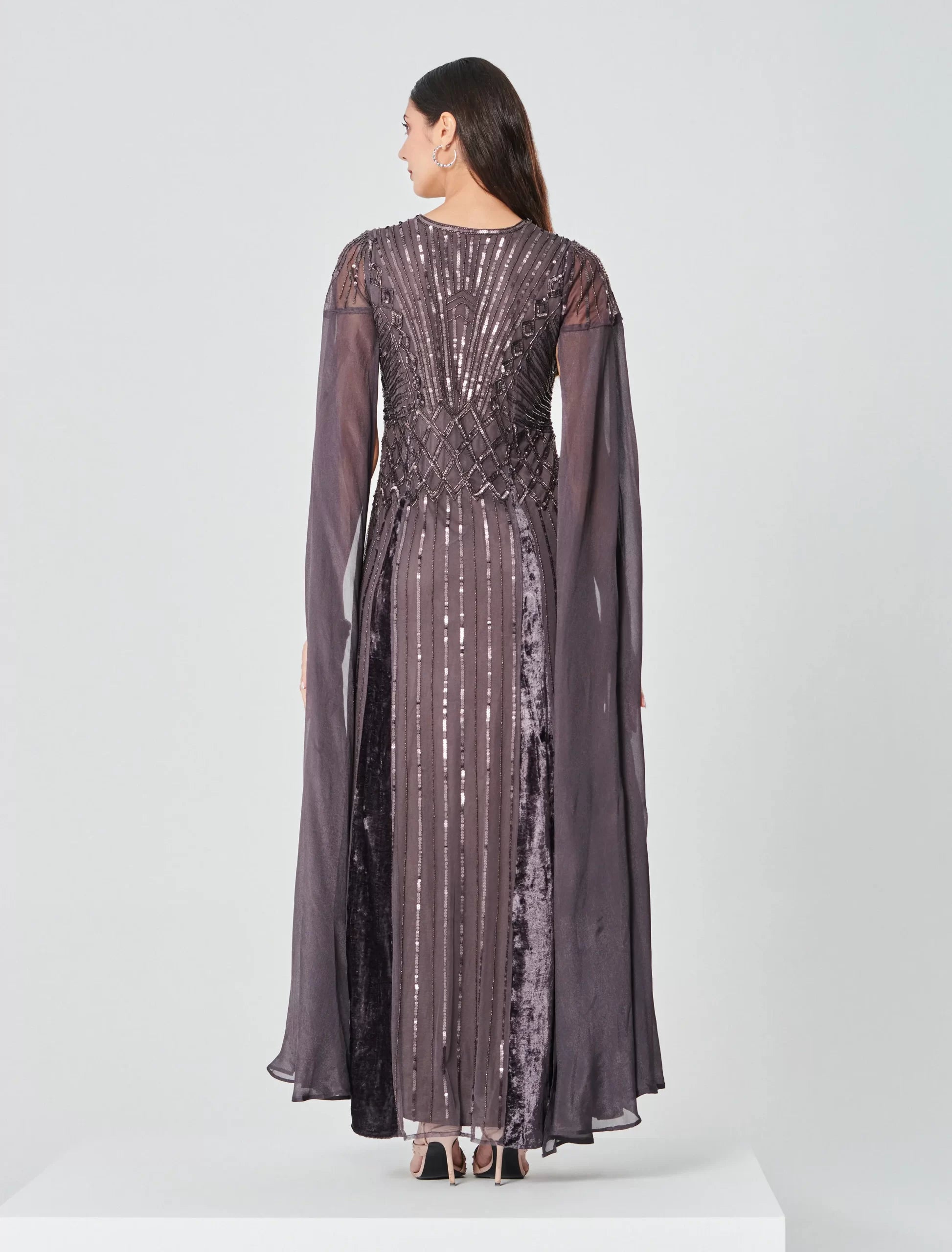 Step into royalty with Shalky’s “Salma” dark gray dress, designed to make you shine at your special occasions. This luxurious dress is crafted from gray georgette fabric with velvet and chiffon details, adorned with shimmering geometric embroidery. Measuring 60 inches in length, the dress features a V-neckline and elegant chiffon cape sleeves, adding a touch of magic and sophistication to your look.