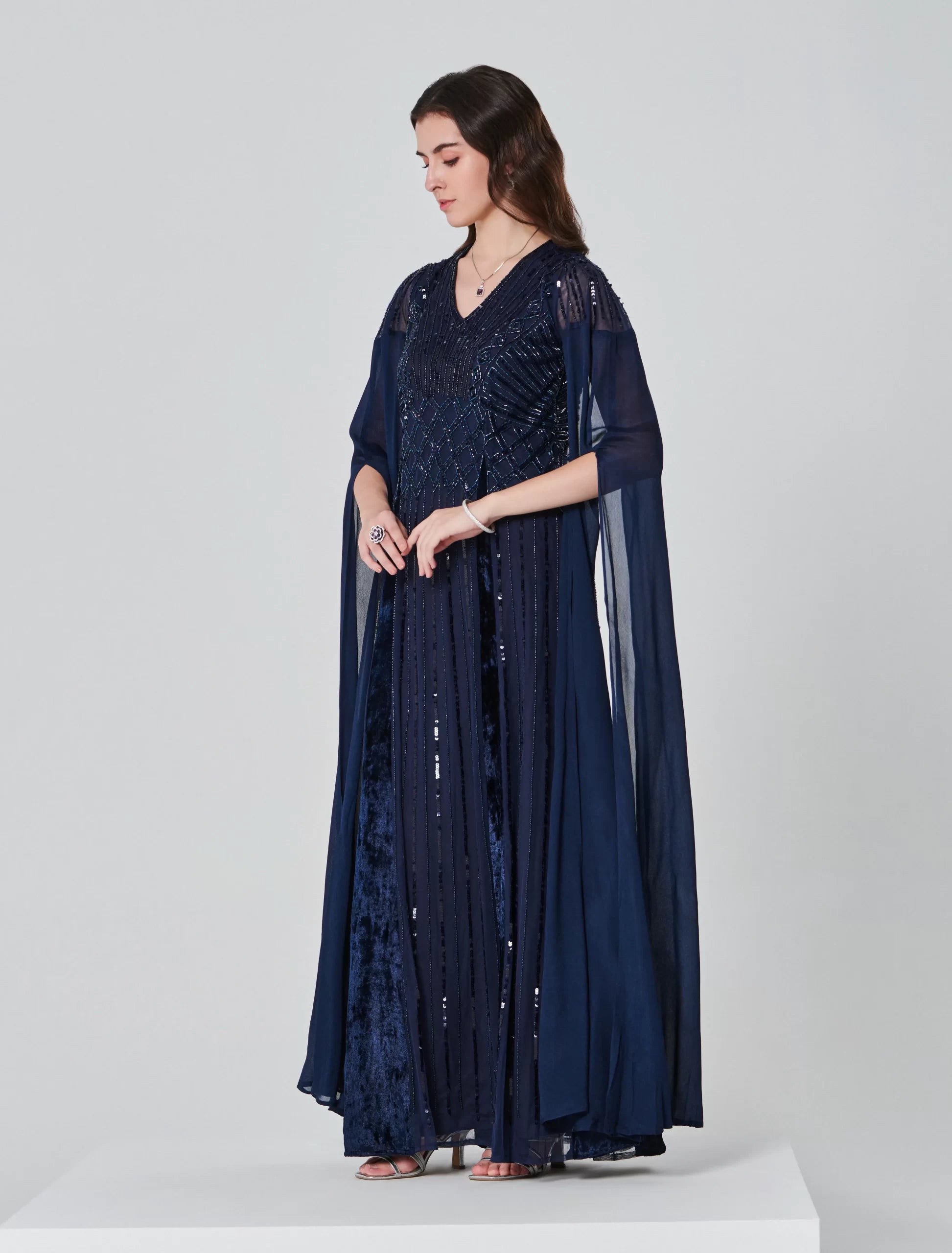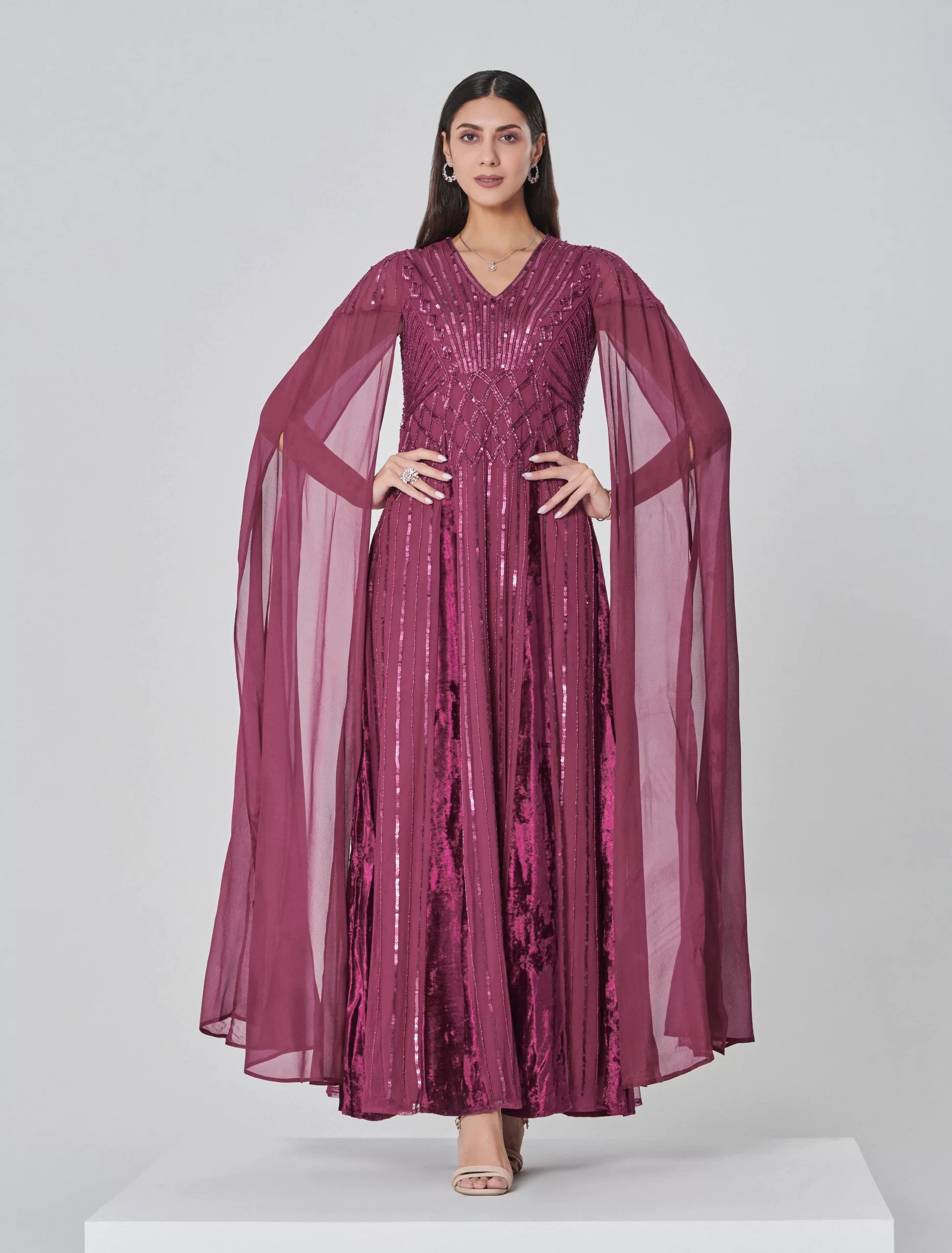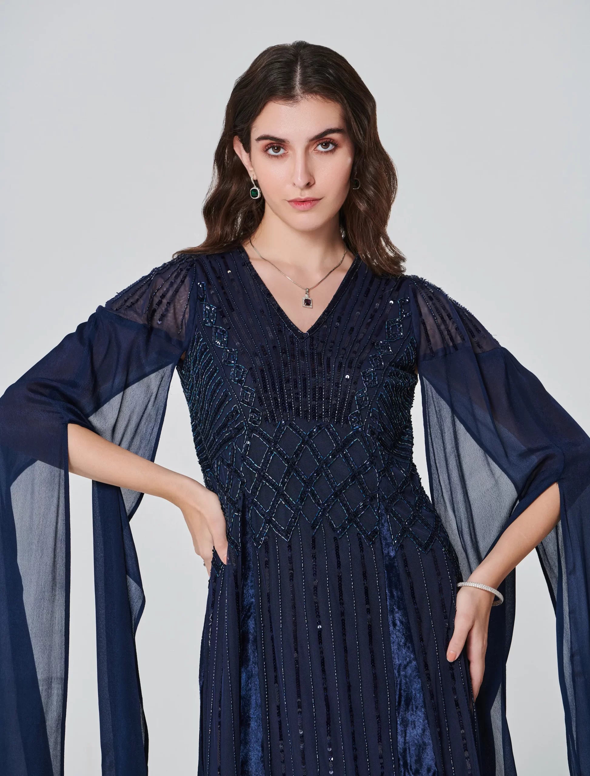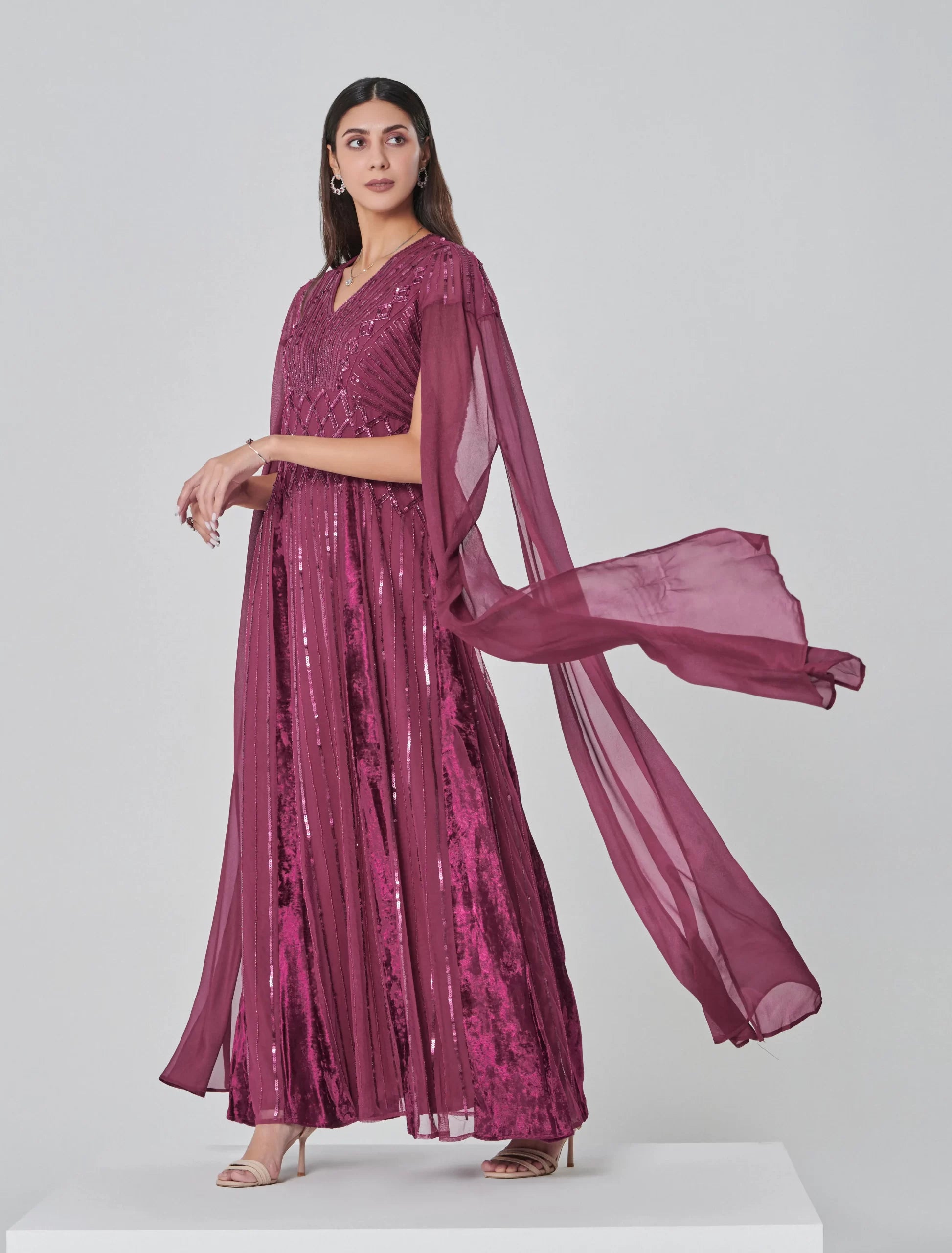 Step into royalty with Shalky’s “Salma” dark gray dress, designed to make you shine at your special occasions. This luxurious dress is crafted from gray georgette fabric with velvet and chiffon details, adorned with shimmering geometric embroidery. Measuring 60 inches in length, the dress features a V-neckline and elegant chiffon cape sleeves, adding a touch of magic and sophistication to your look.