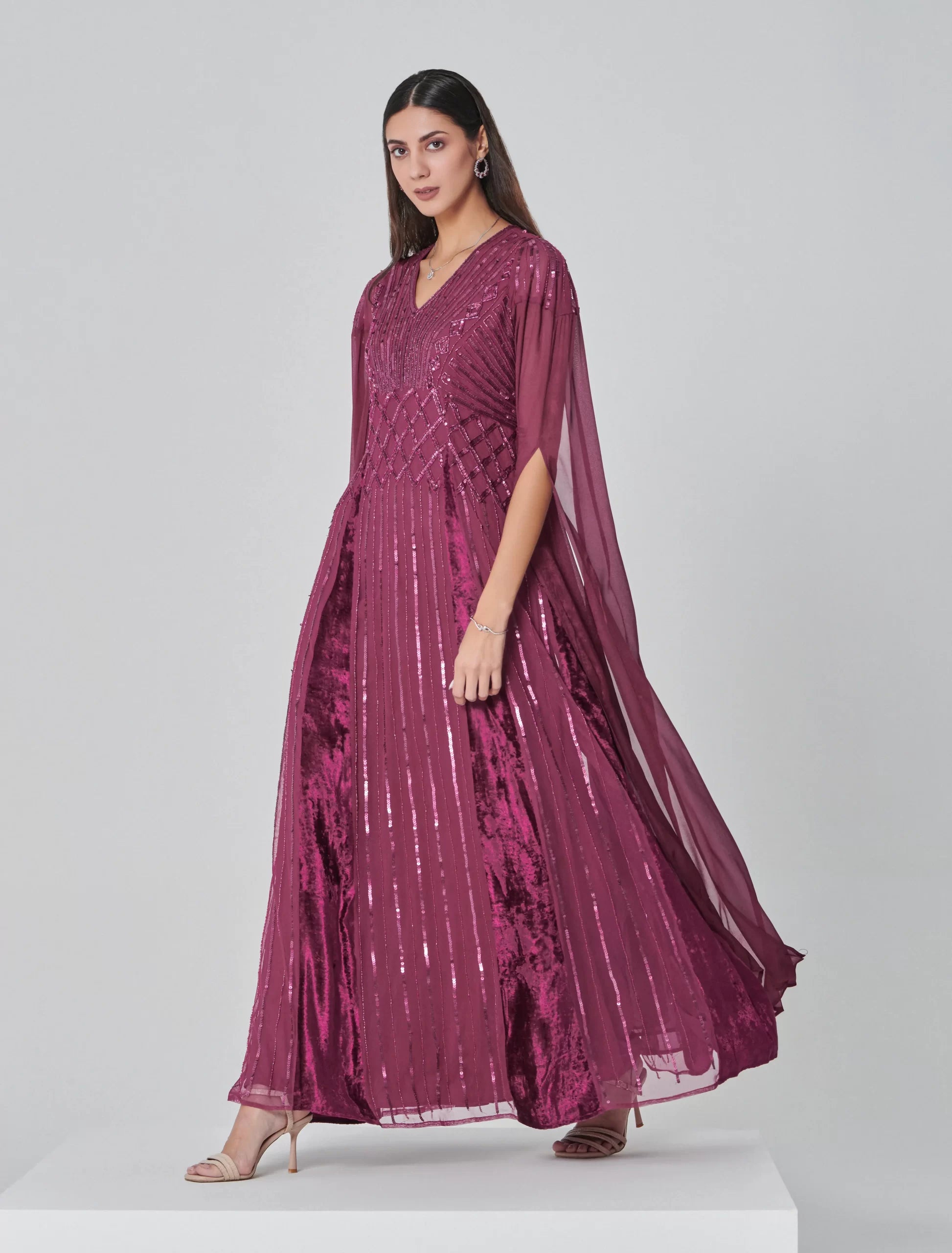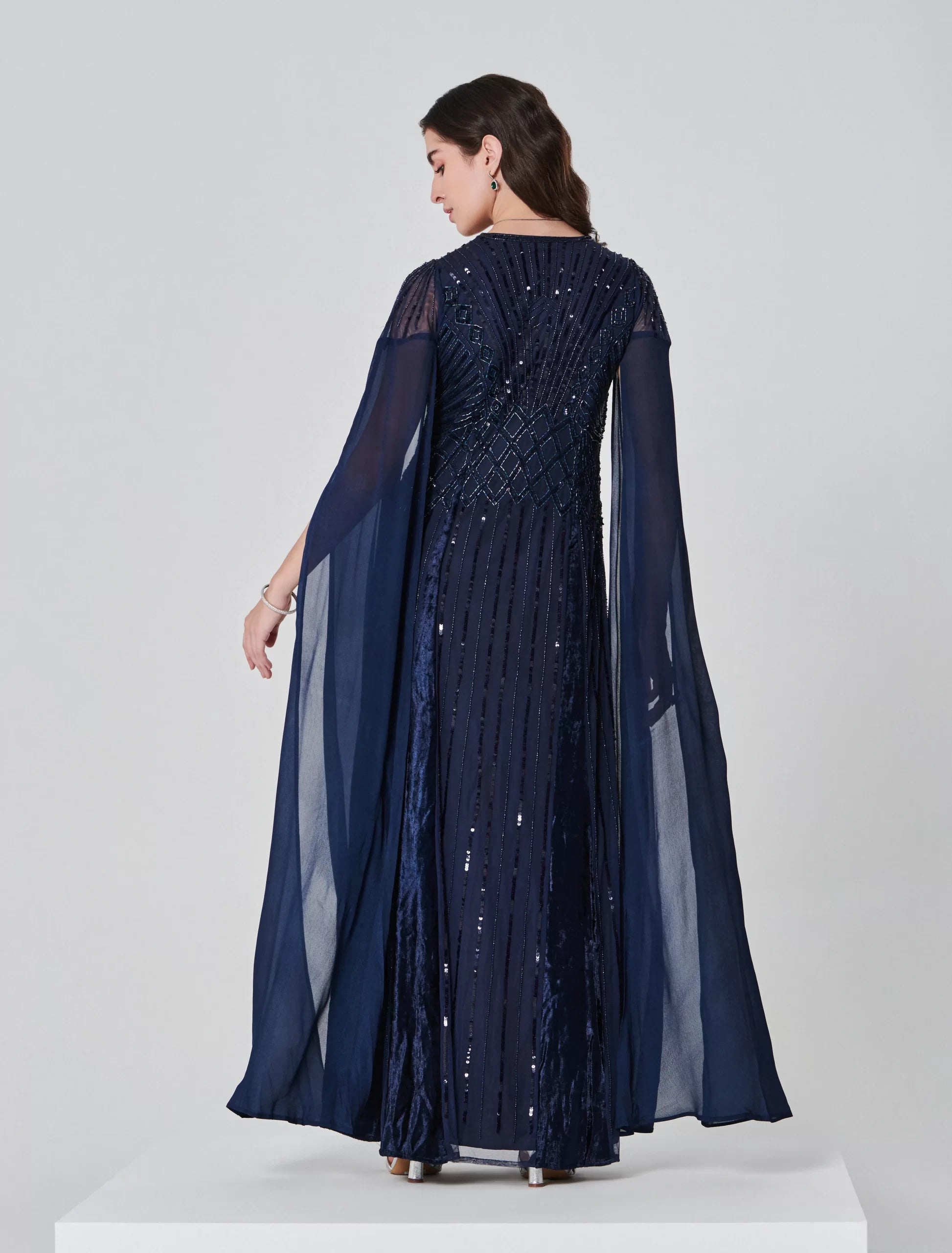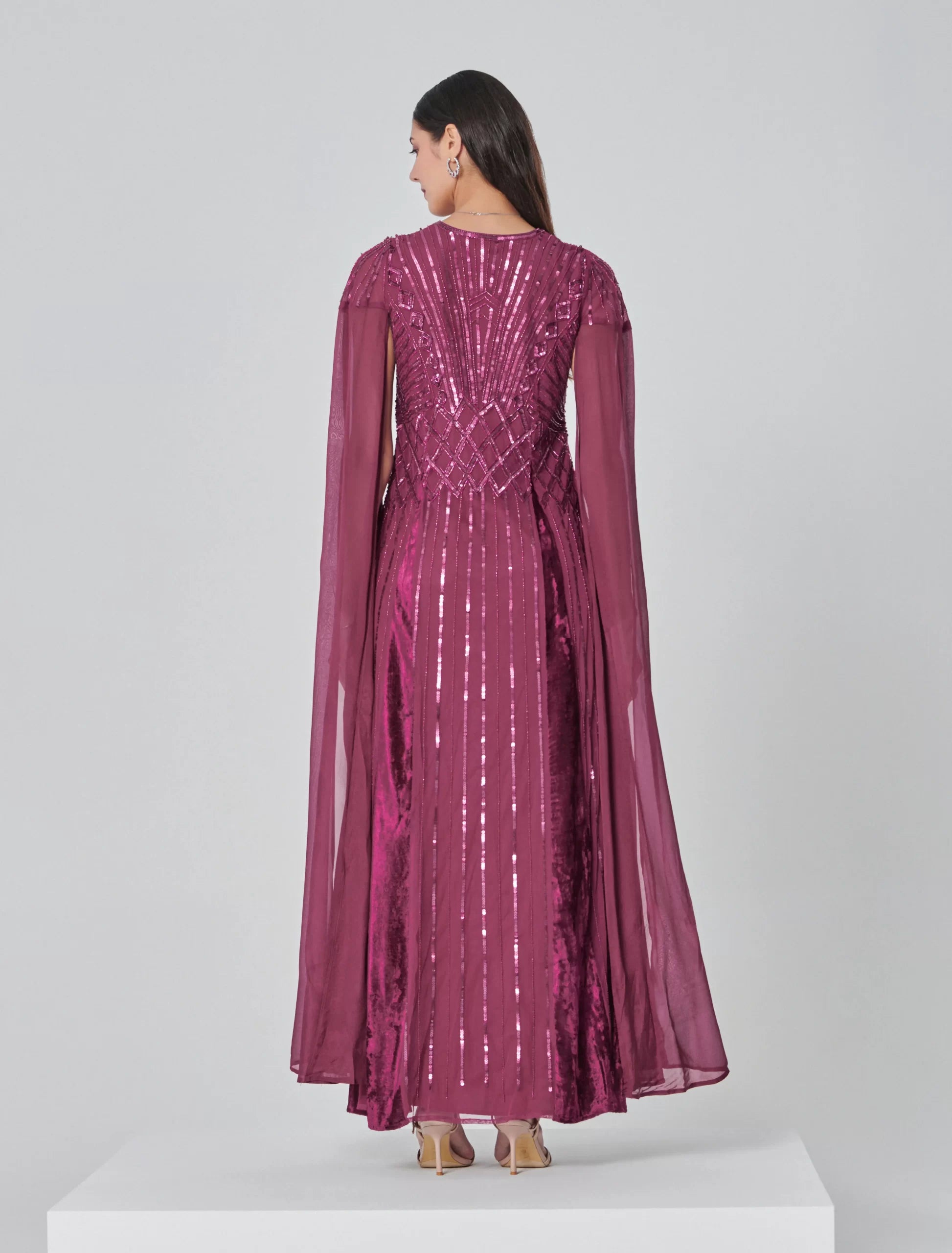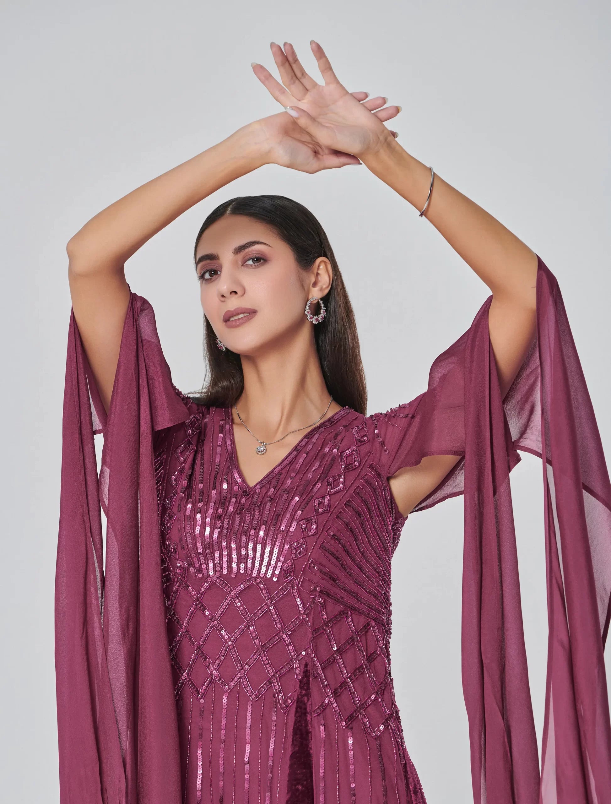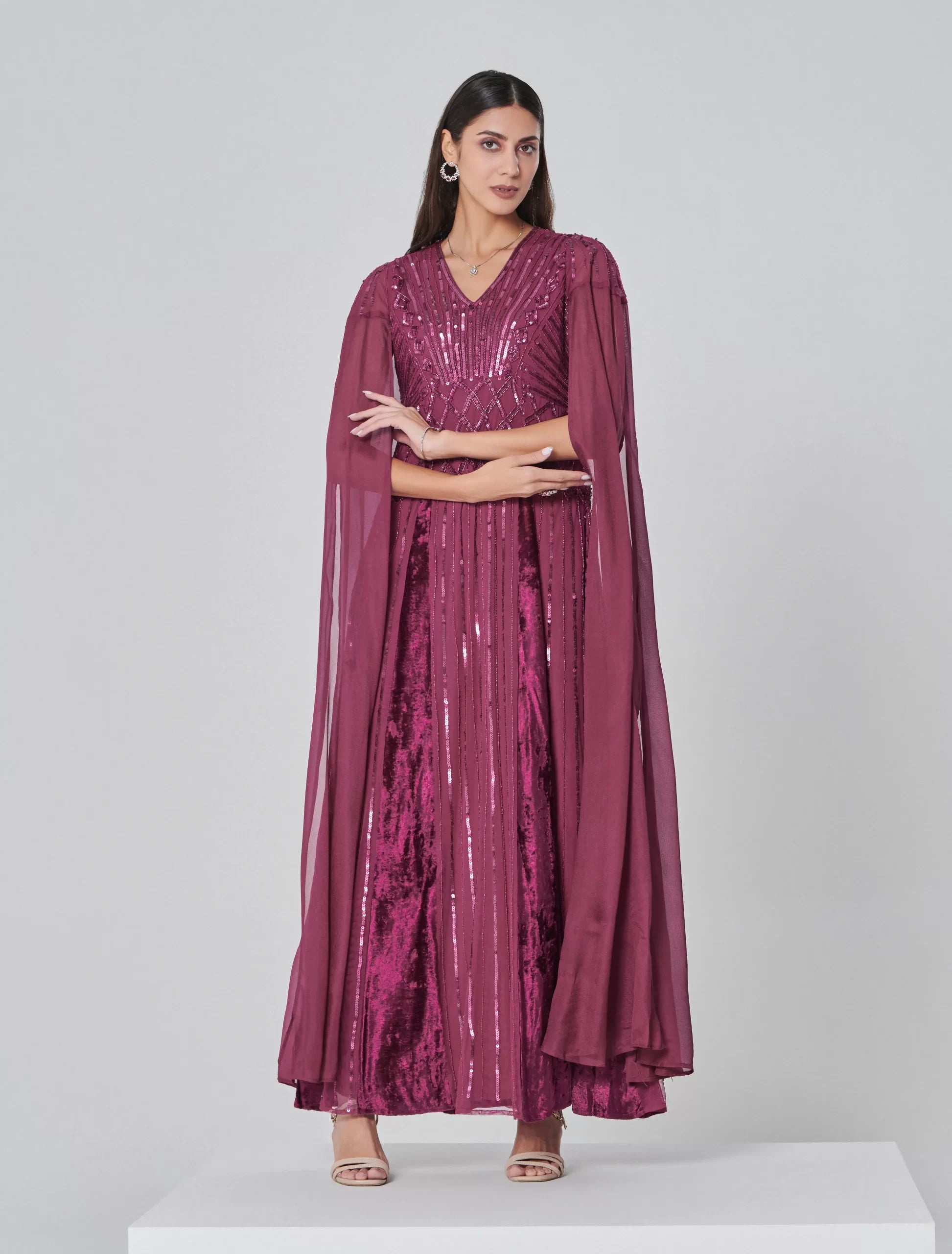Step into royalty with Shalky’s “Salma” dark gray dress, designed to make you shine at your special occasions. This luxurious dress is crafted from gray georgette fabric with velvet and chiffon details, adorned with shimmering geometric embroidery. Measuring 60 inches in length, the dress features a V-neckline and elegant chiffon cape sleeves, adding a touch of magic and sophistication to your look.