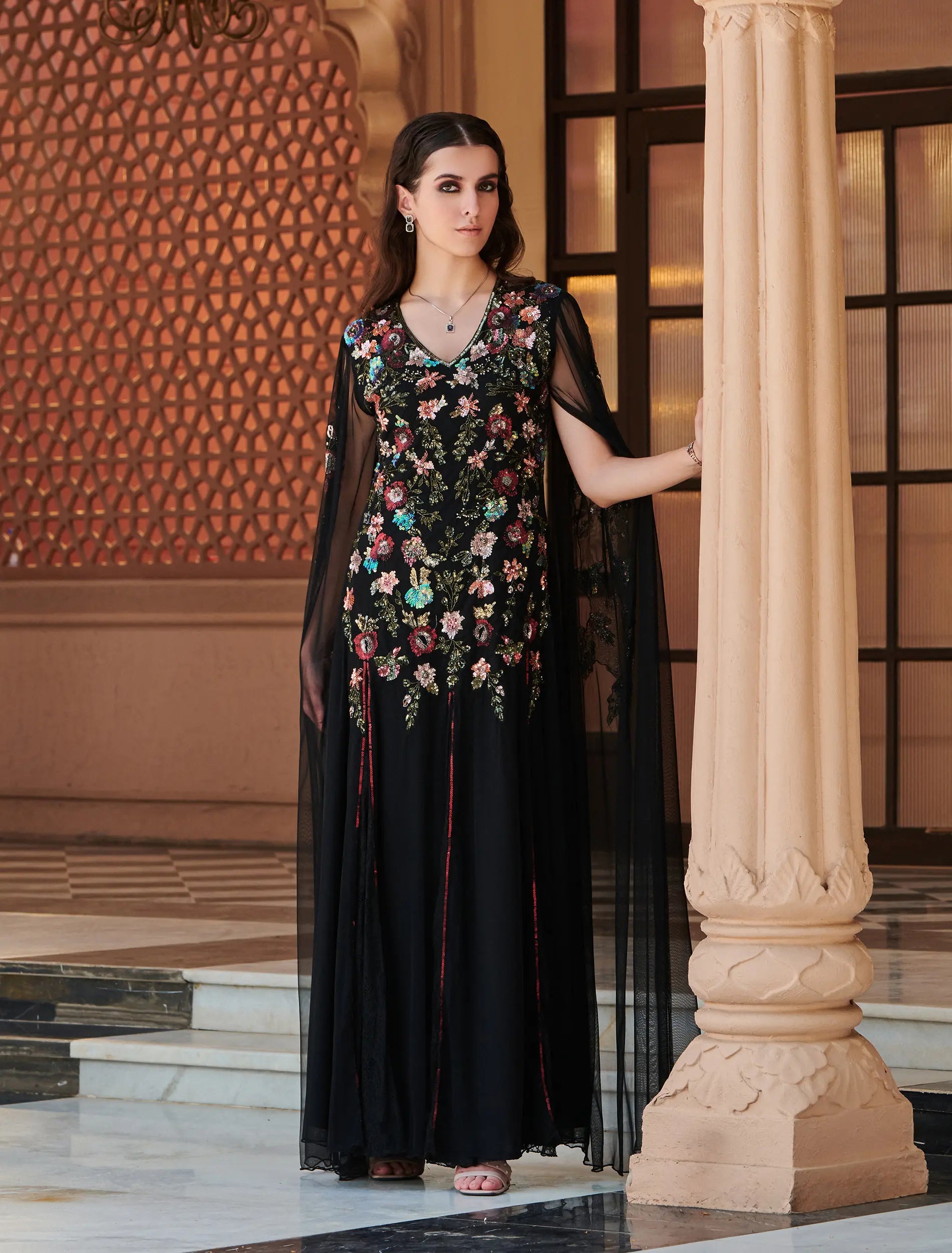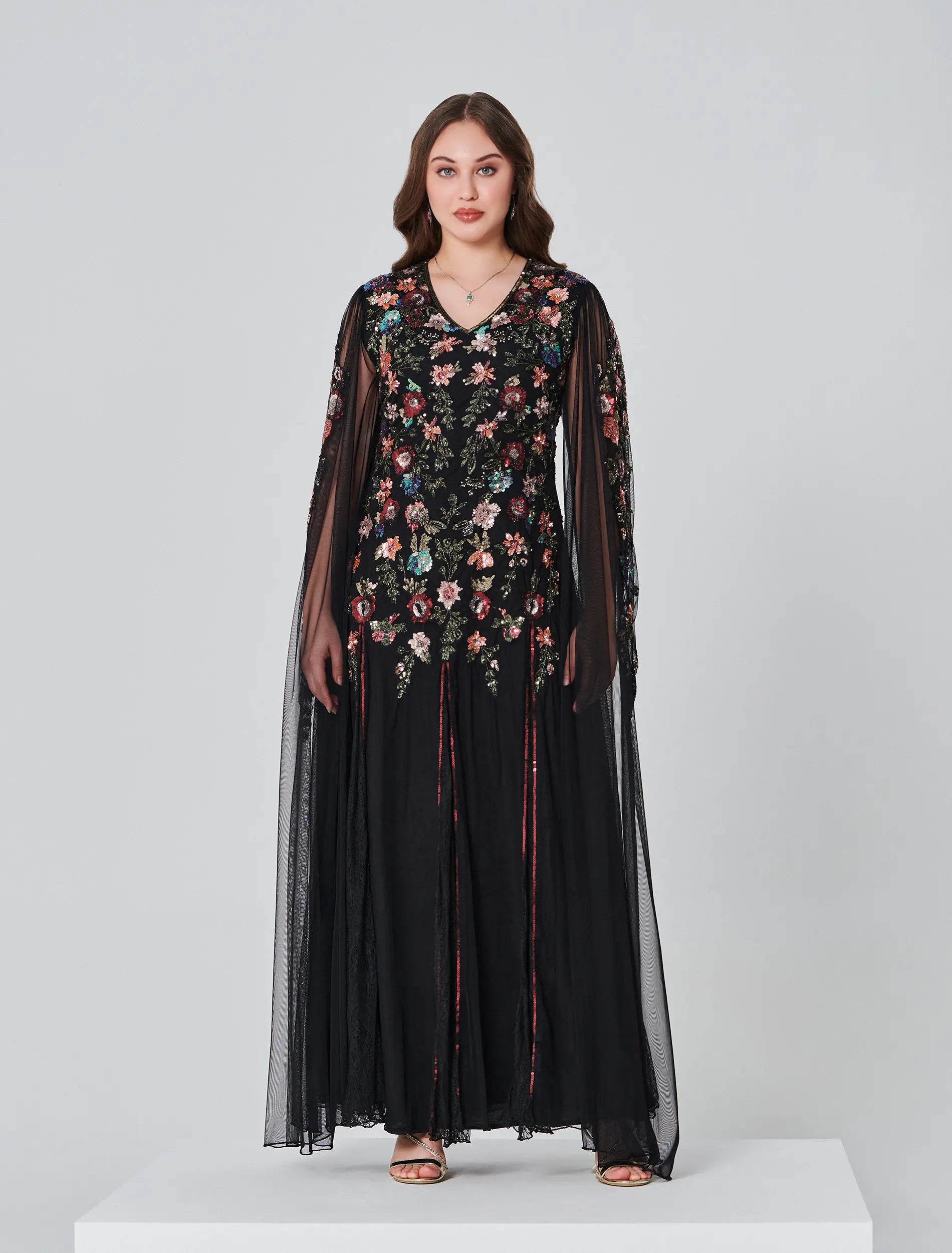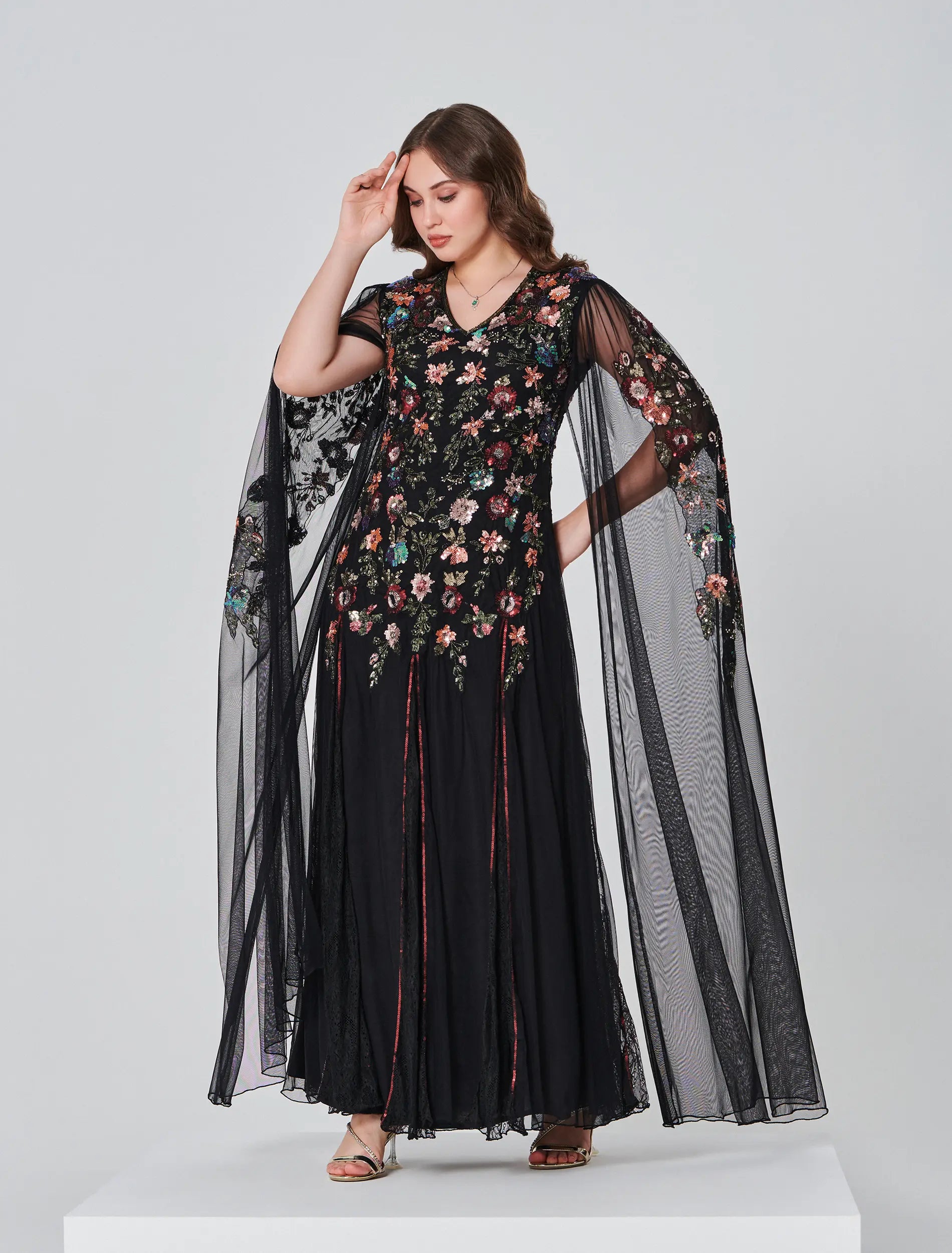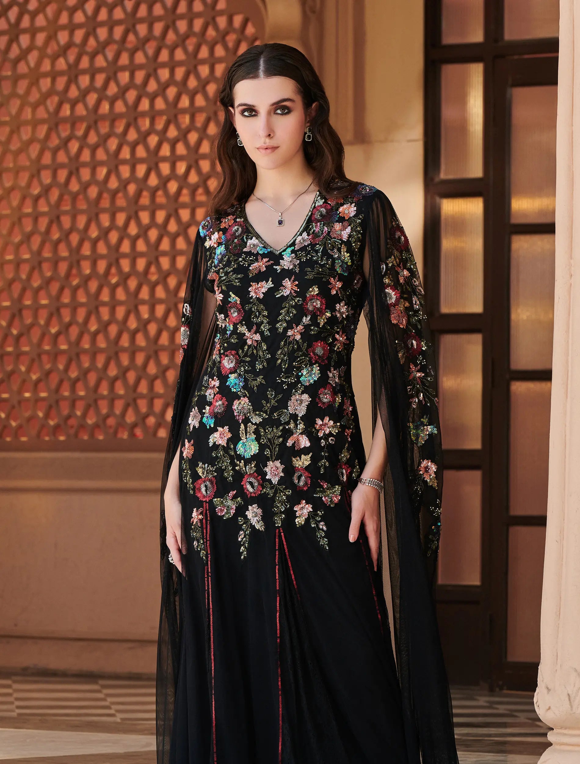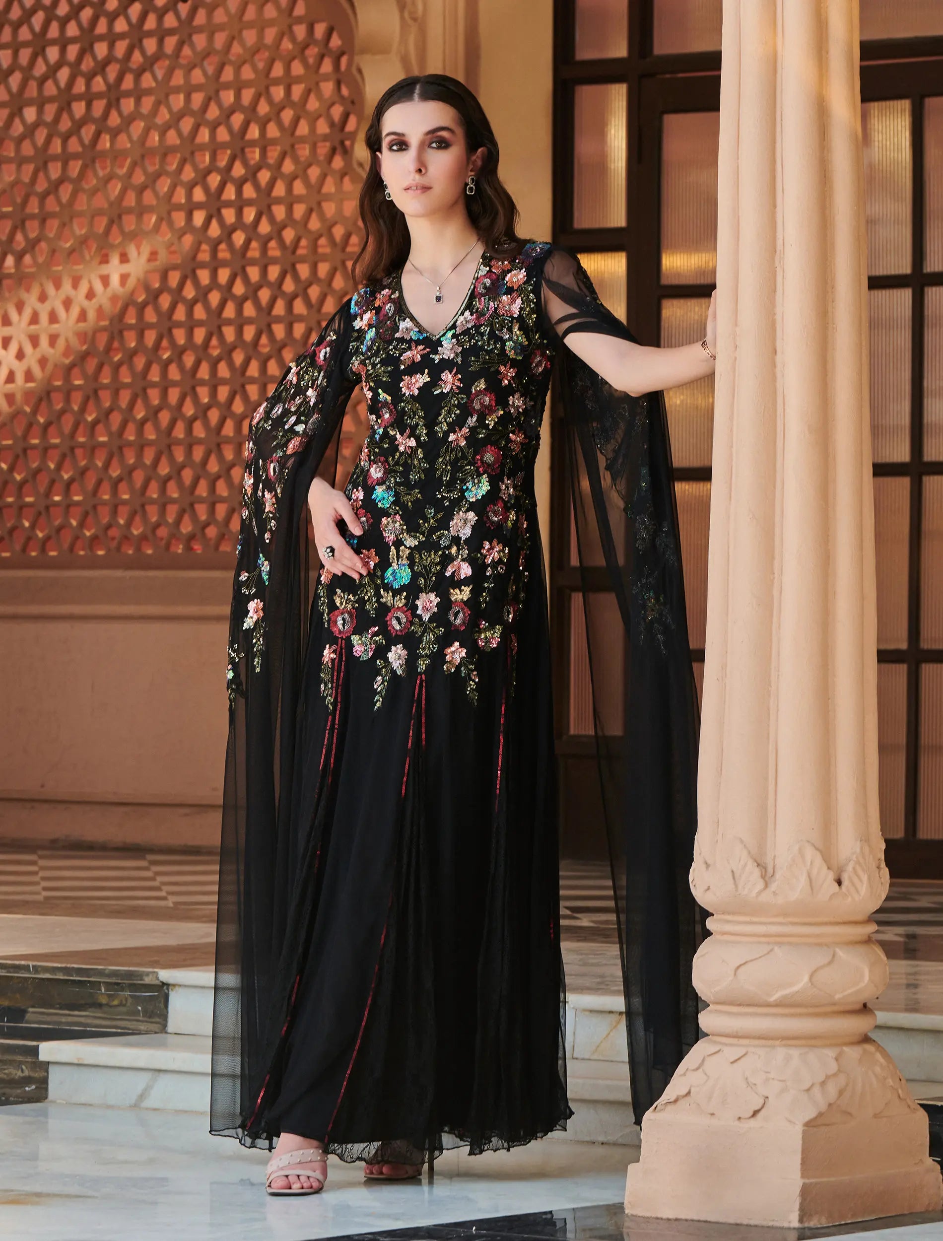 Shalky's long soft black engagement dress 'Salsabil', featuring a stunning design that suits all tastes and mirrors luxury and beauty with every single detail. It includes details, making it the ideal choice for special occasions, such as engagements and evening parties. It is recommended to dry clean to maintain the fabric's quality and its elegant details.