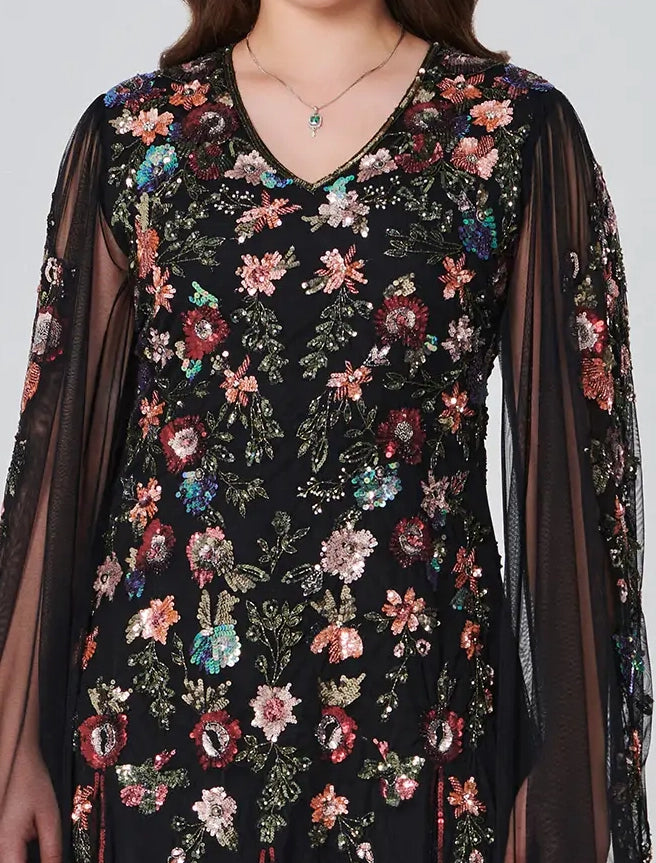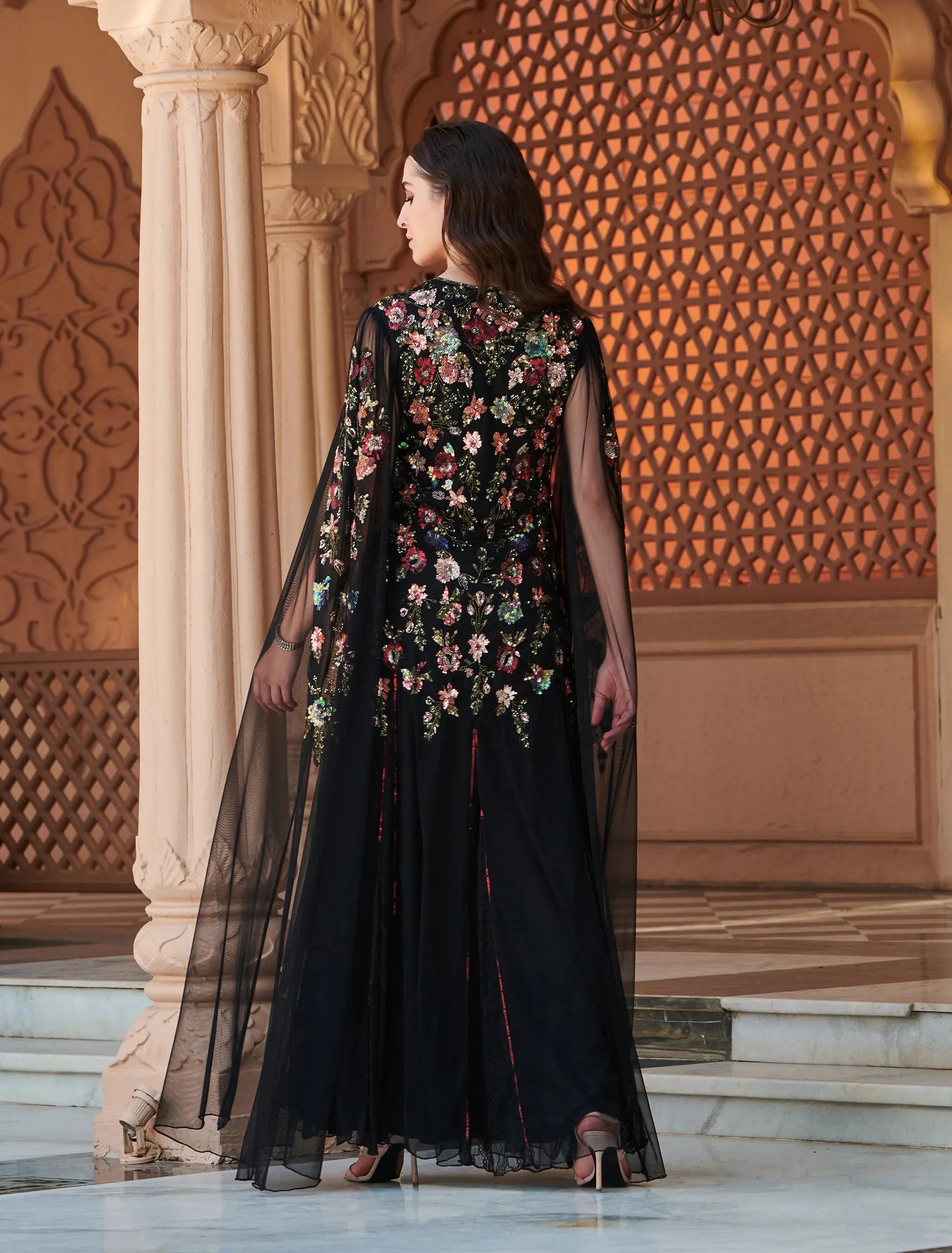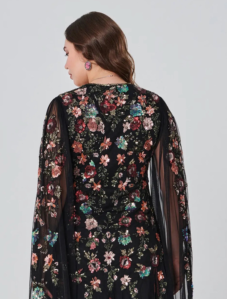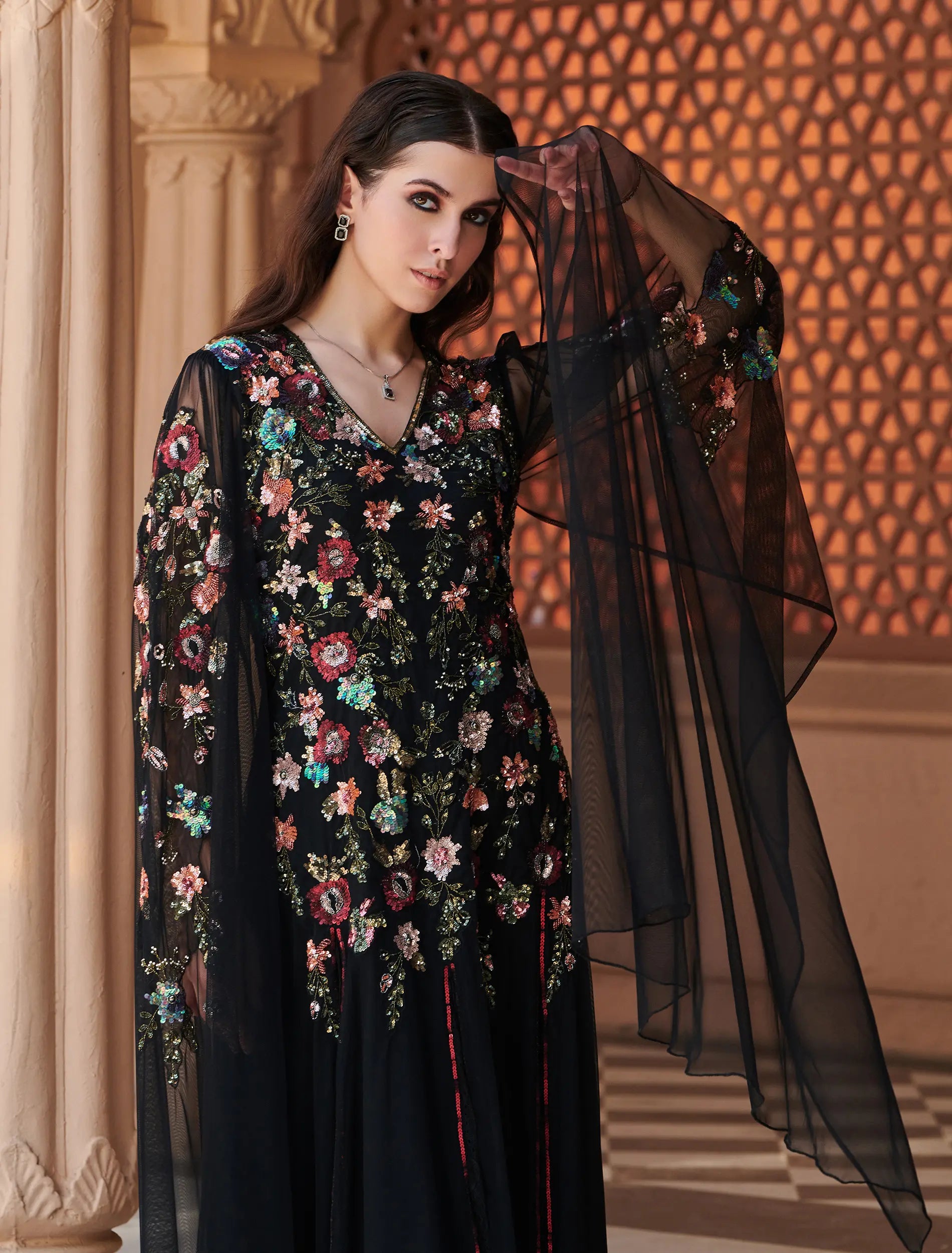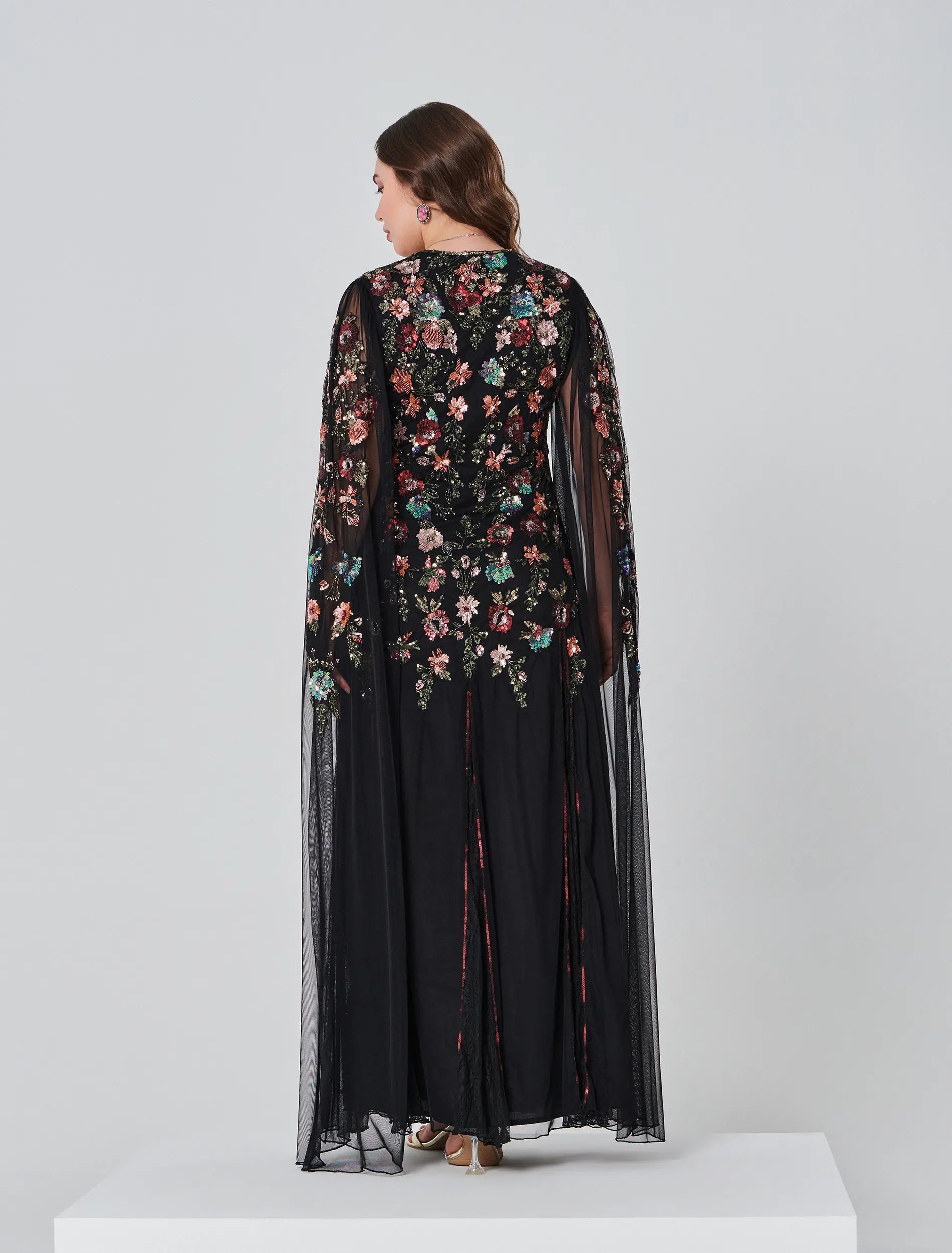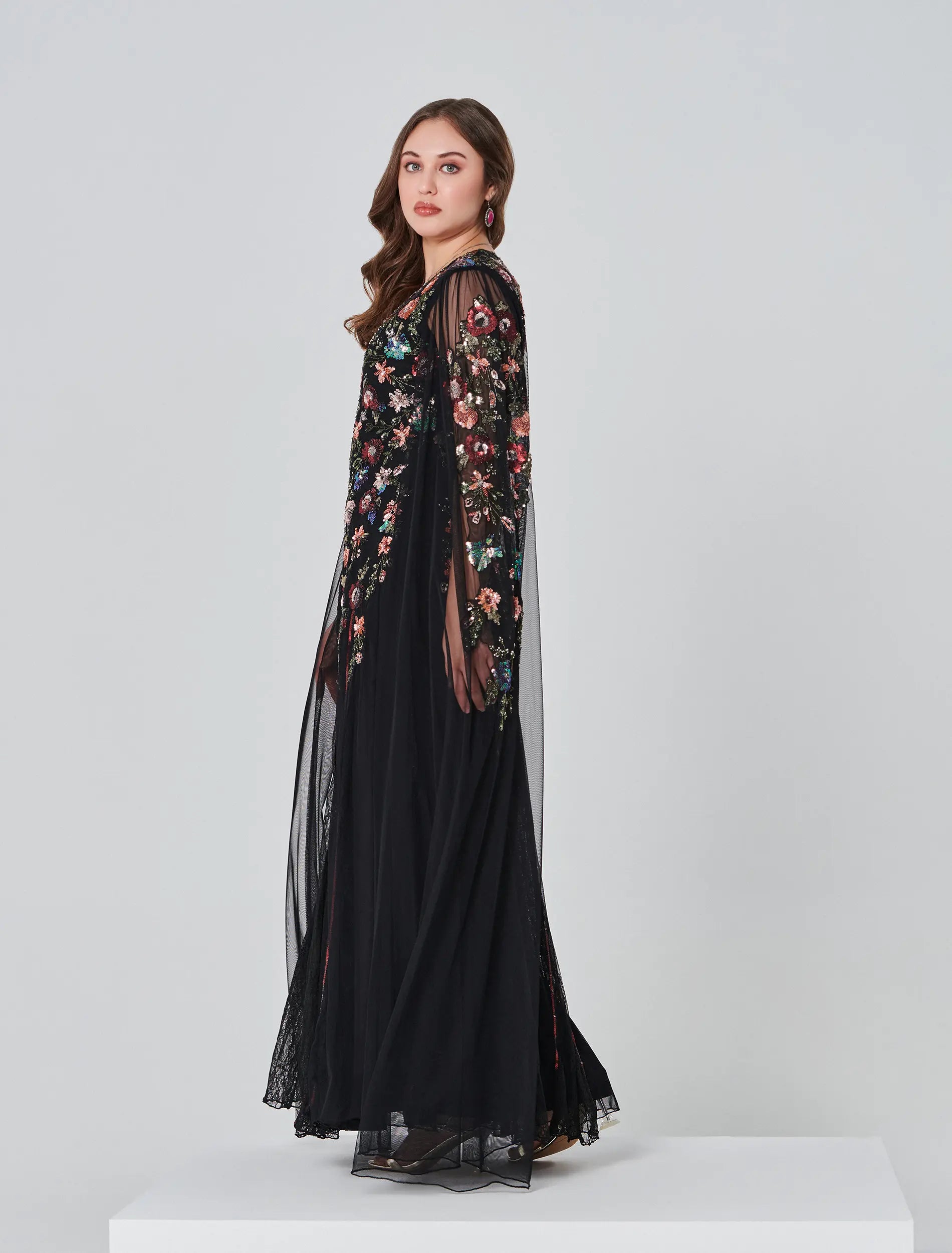 Shalky's long soft black engagement dress 'Salsabil', featuring a stunning design that suits all tastes and mirrors luxury and beauty with every single detail. It includes details, making it the ideal choice for special occasions, such as engagements and evening parties. It is recommended to dry clean to maintain the fabric's quality and its elegant details.