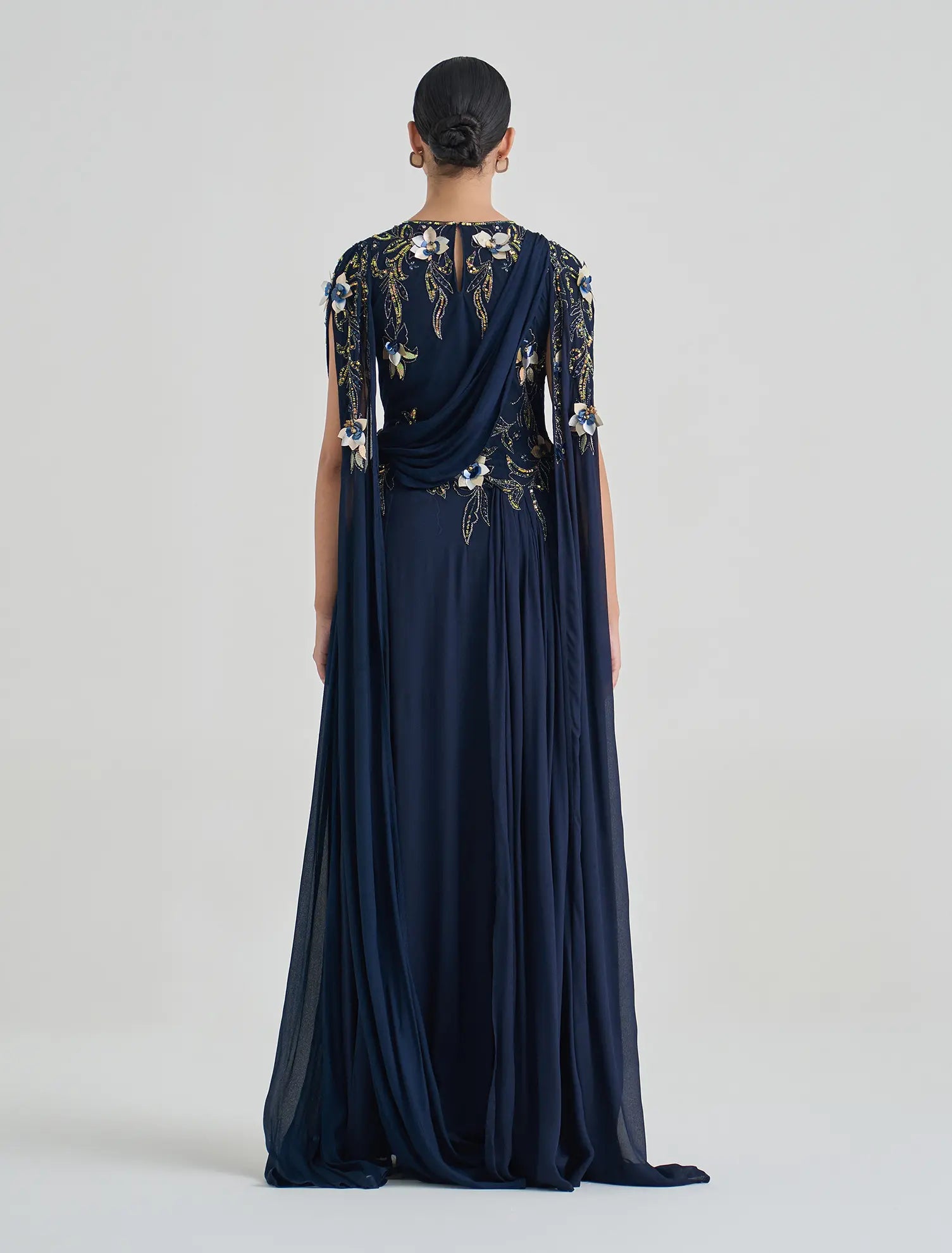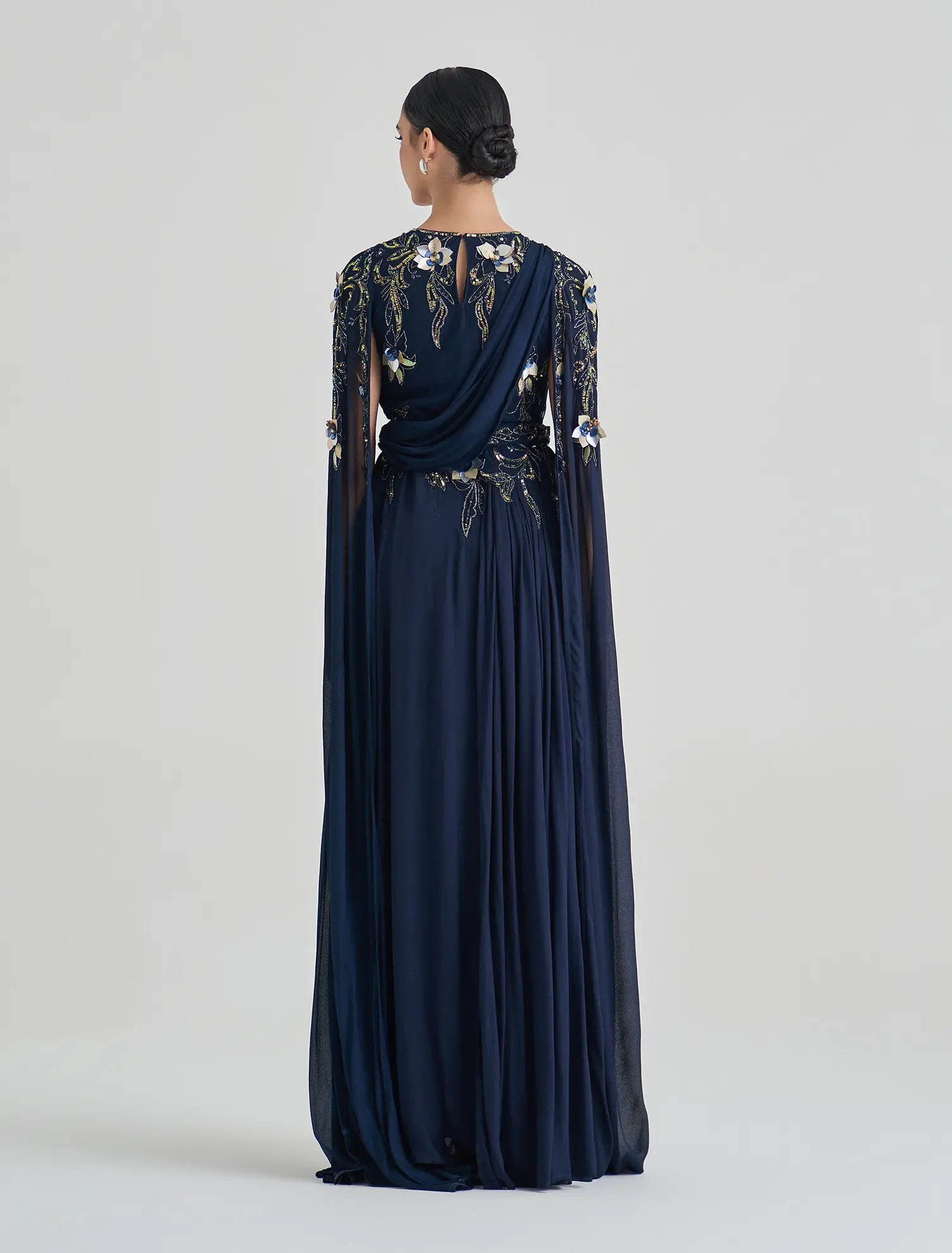 - Sleeves: Open cape sleeves with elegant hand embroidery