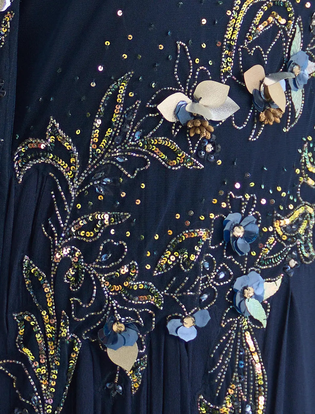 - Embroidery: The navy blue embroidered dress features 3D floral embellishments