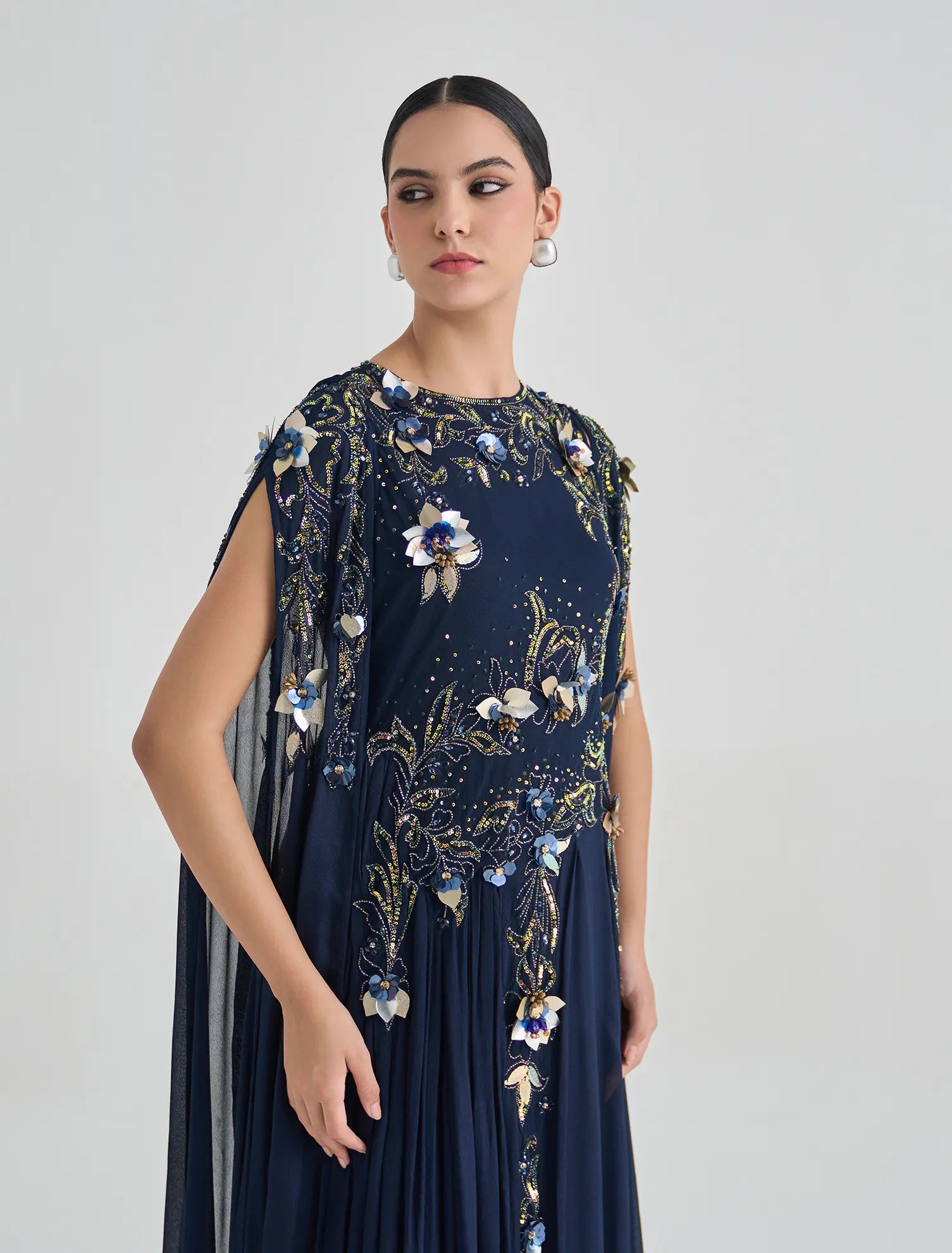 Slhalky navy blue evening gown features full-length and floral hand embroidery, offering a royal look. This elegant long evening dress with a 60-inch length showcases an elegant flowing design. The luxurious hand-embroidered navy blue evening dress features 3D flowers in white, gold, and purple. The closed round neckline is embellished with delicate embroidery, while the open cape sleeves flow to the ground, making it ideal for evening events, weddings, and engagements.