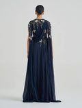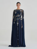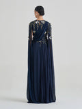 Navy Blue Evening Gown with Open Cape Sleeves