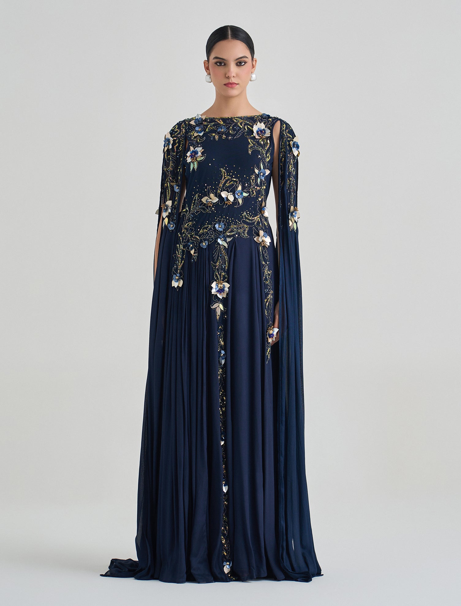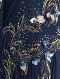 Make a lasting impression with this long navy blue hand-embroidered evening gown with floral embroidery for an eye-catching and regal look at every special occasion.