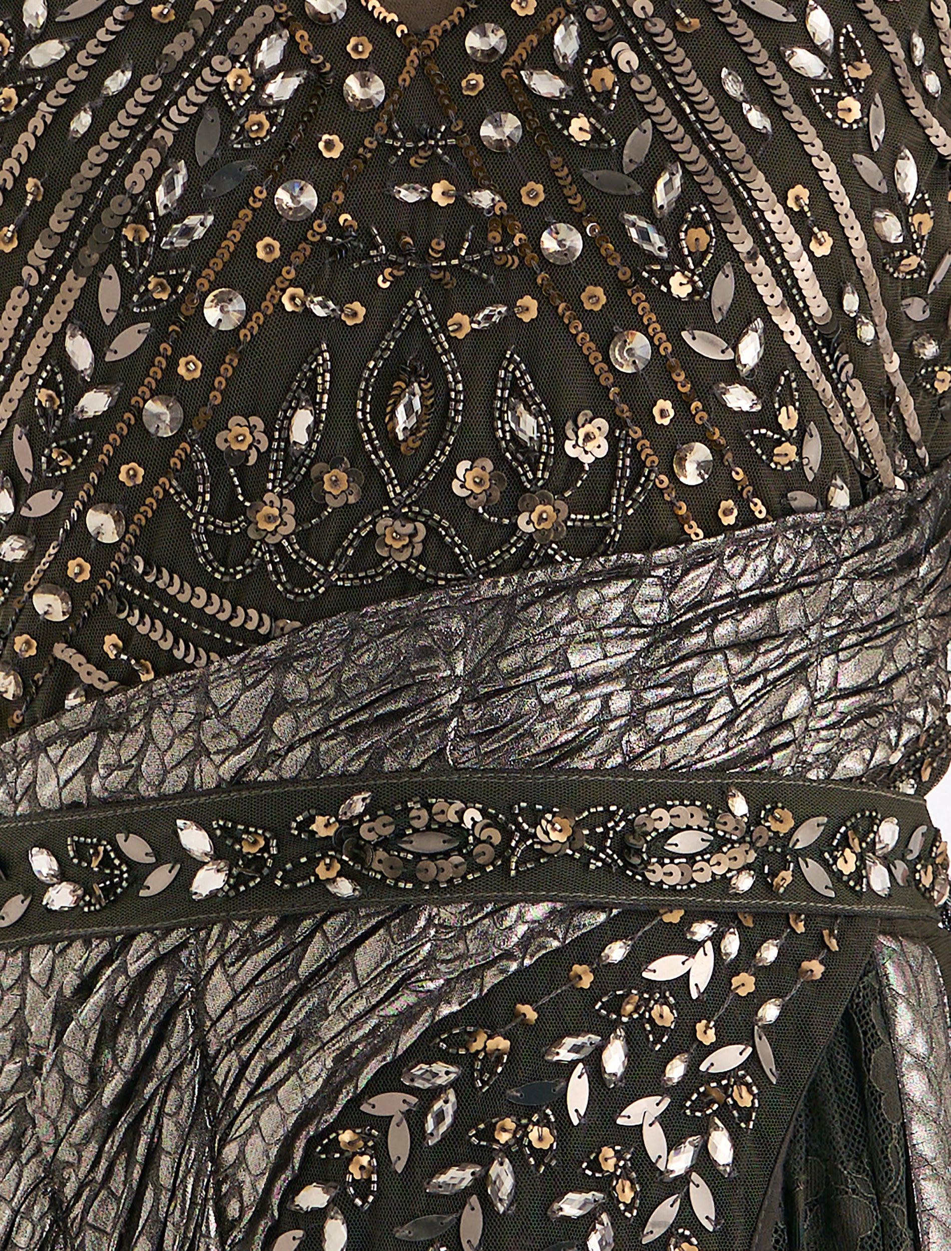 - Embroidery: Hand-embroidered with gold, silver, and bronze botanical and geometric patterns enhancing the maxi olive-green dress