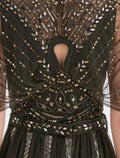 This olive-green evening dress blends simple design and luxurious evening style, featuring a high round chiffon neckline. This olive evening dress is designed with short chiffon sleeves and gold, silver, and bronze hand embroidery in botanical and geometric patterns all over the fabric for glowy evening wear. The front design of this shimmering olive evening dress features embroidery details flowing gracefully along the gown. The bodice showcases a V-neckline adorned with delicate chiffon accents, while the skirt features a wide, flowing silhouette enhanced by layered chiffon and refined lace details. Embrace elegance at evening occasions, weddings, and luxury events with this shimmering olive evening gown for a royal look.