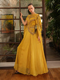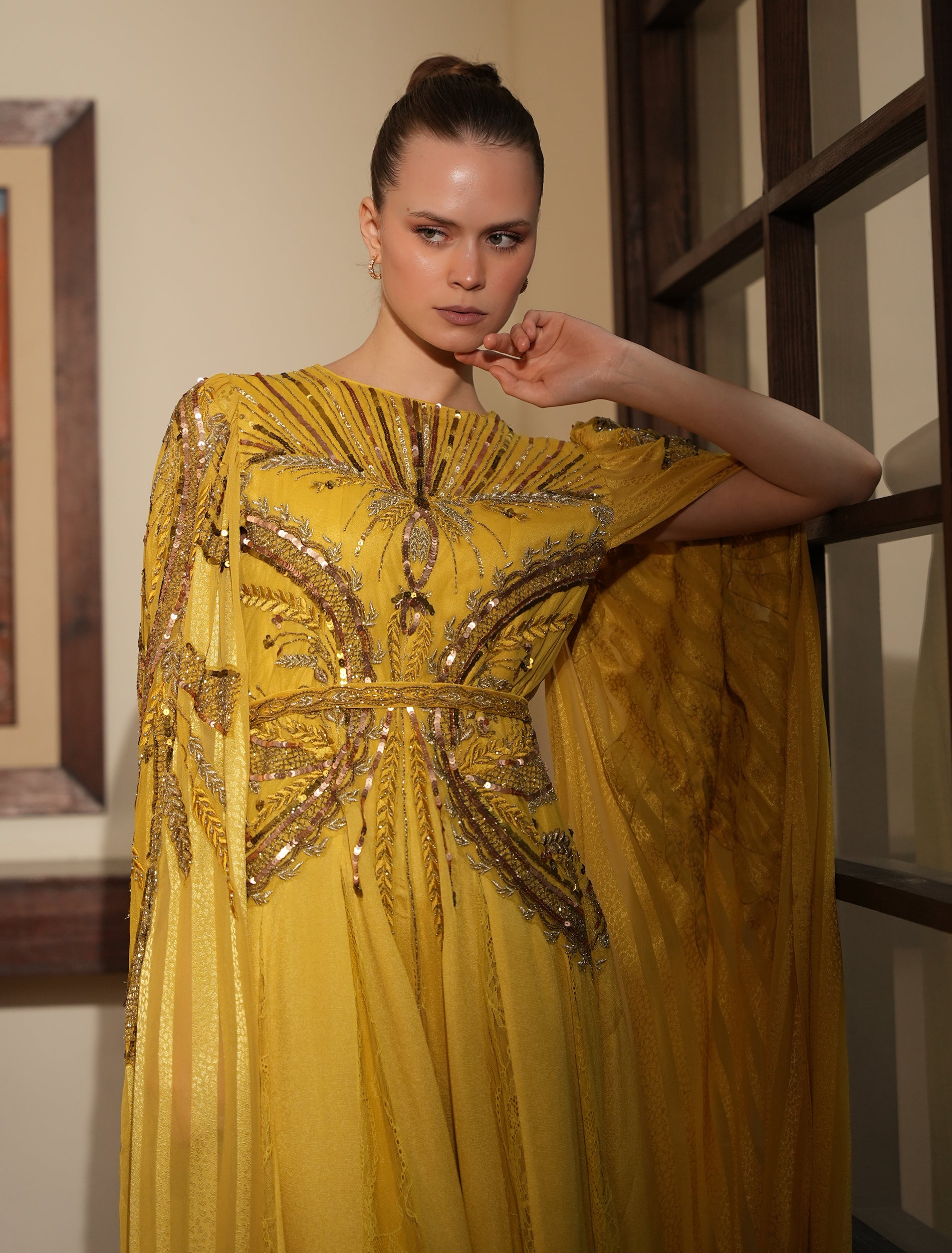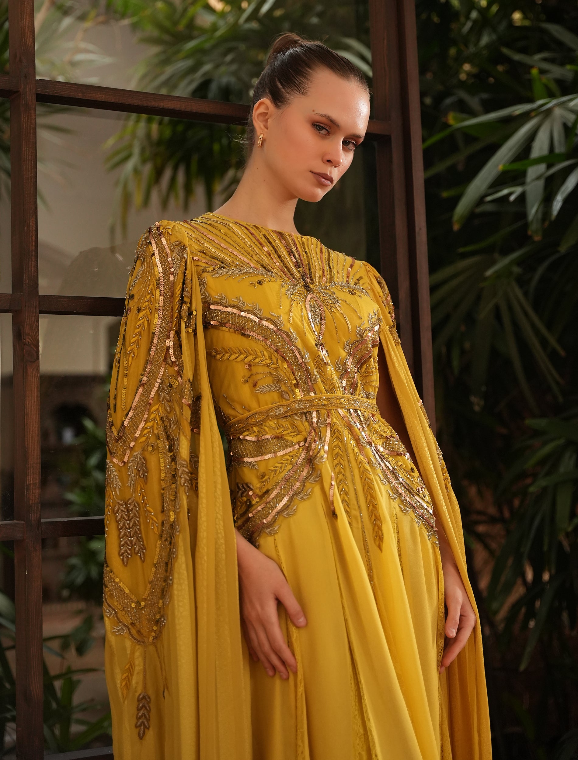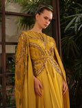 The neckline of the yellow dress features a round cut with intricate hand embroidery, while the long tulle sleeves drape in a refined cape-style for a captivating look.