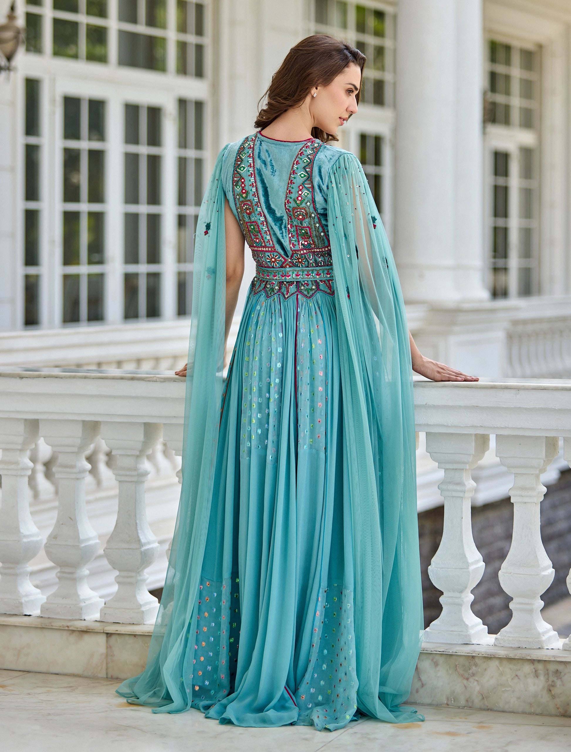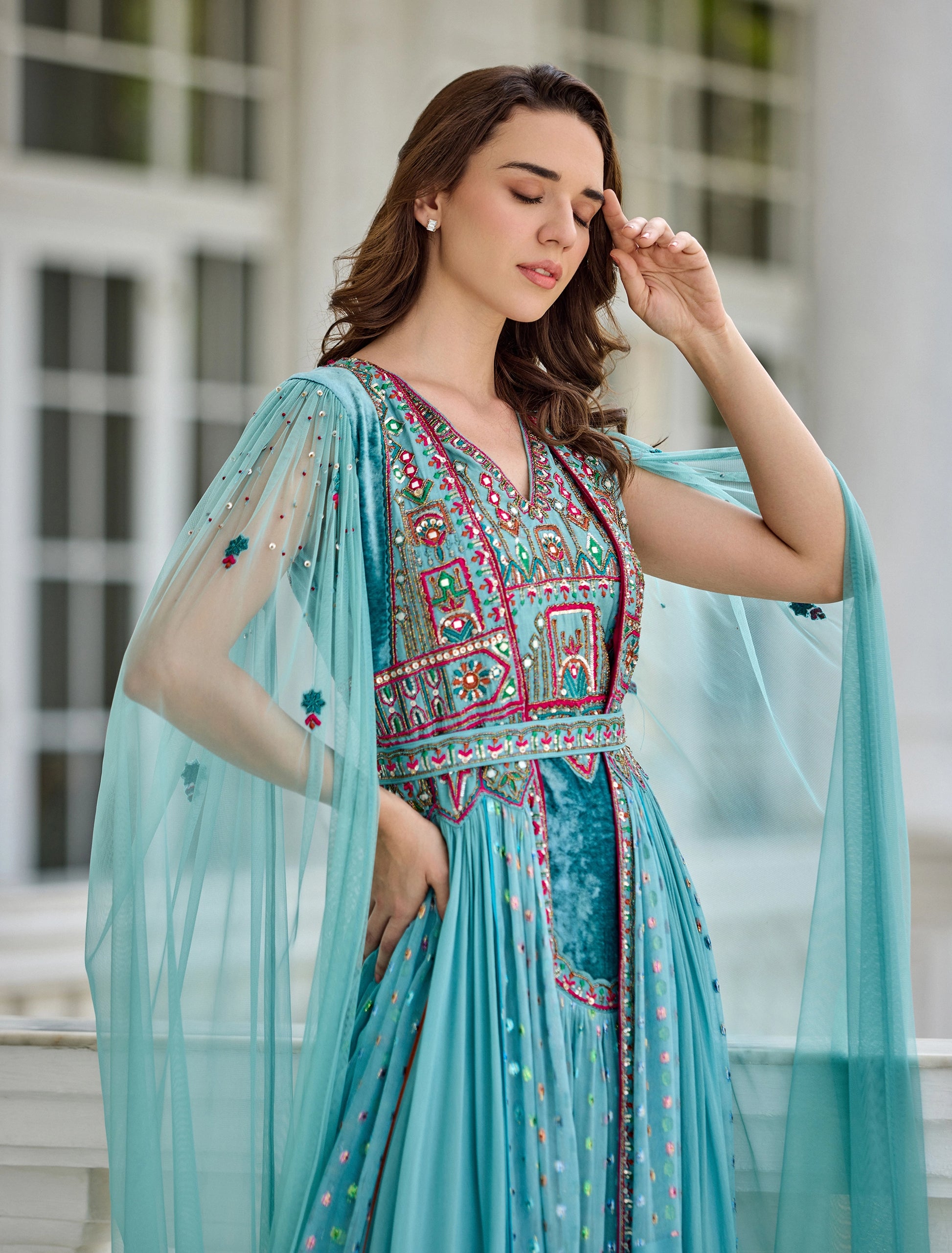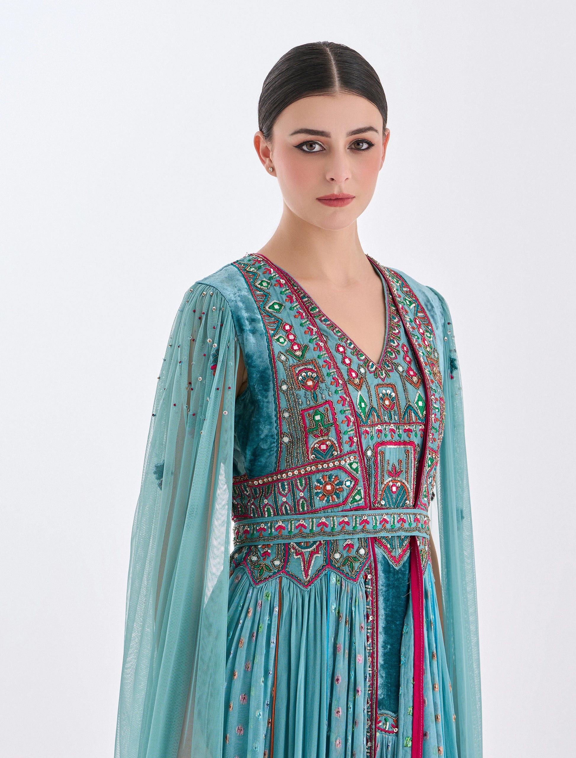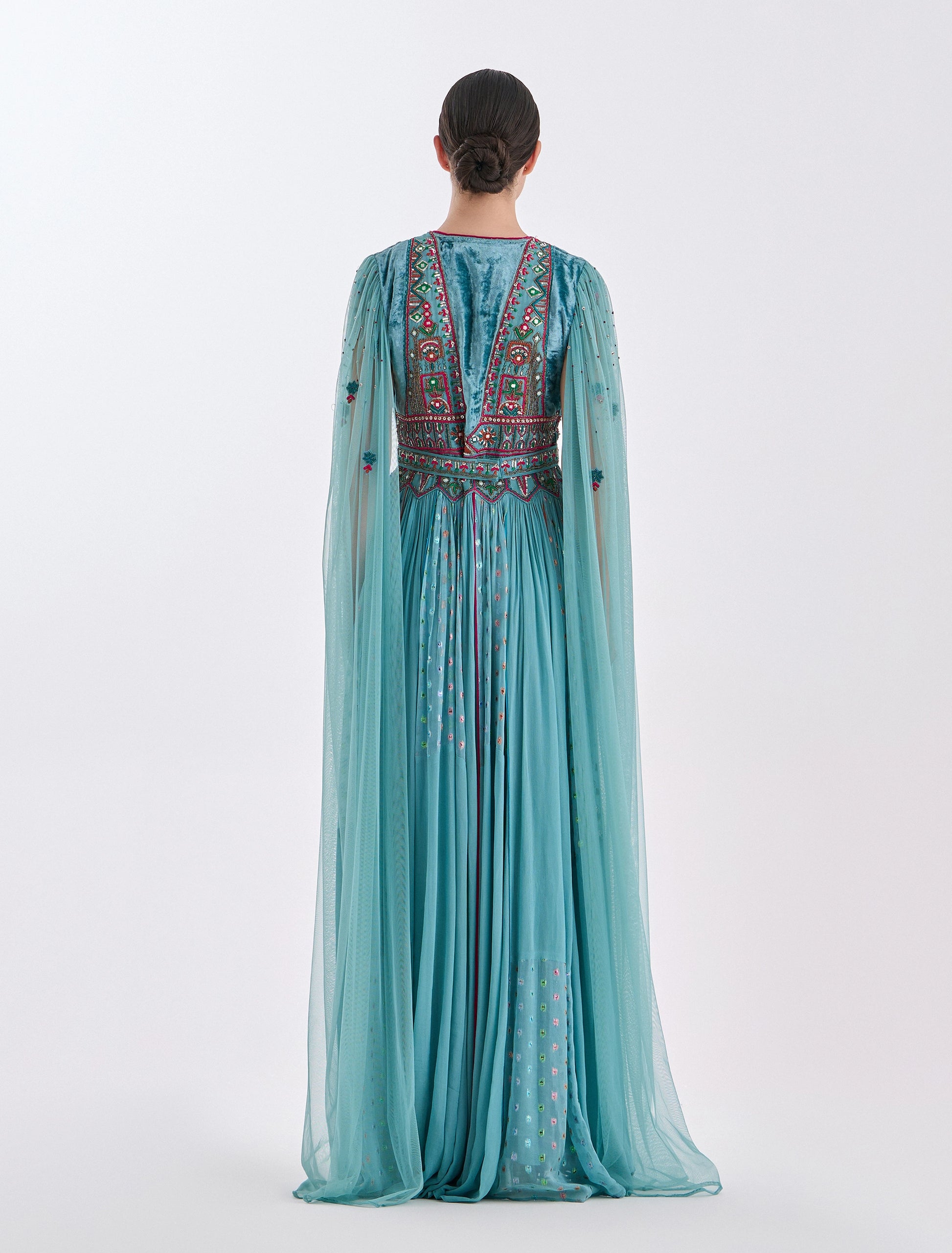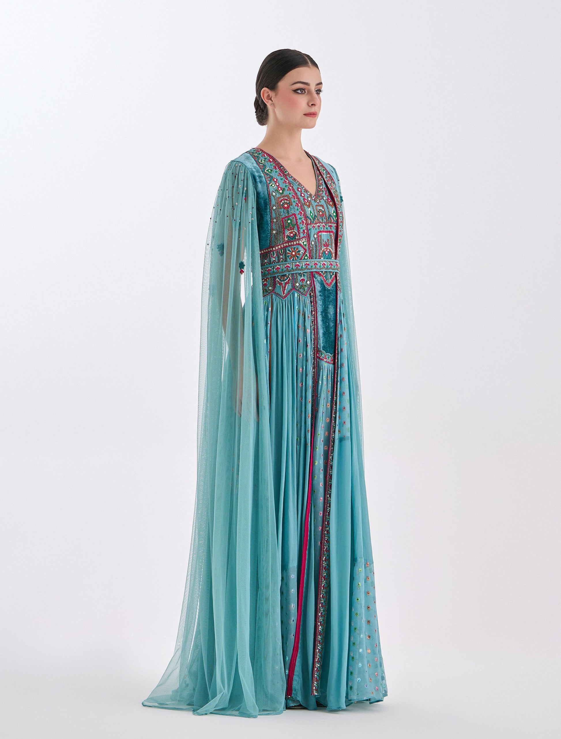 Long sheer turquoise tulle sleeves.