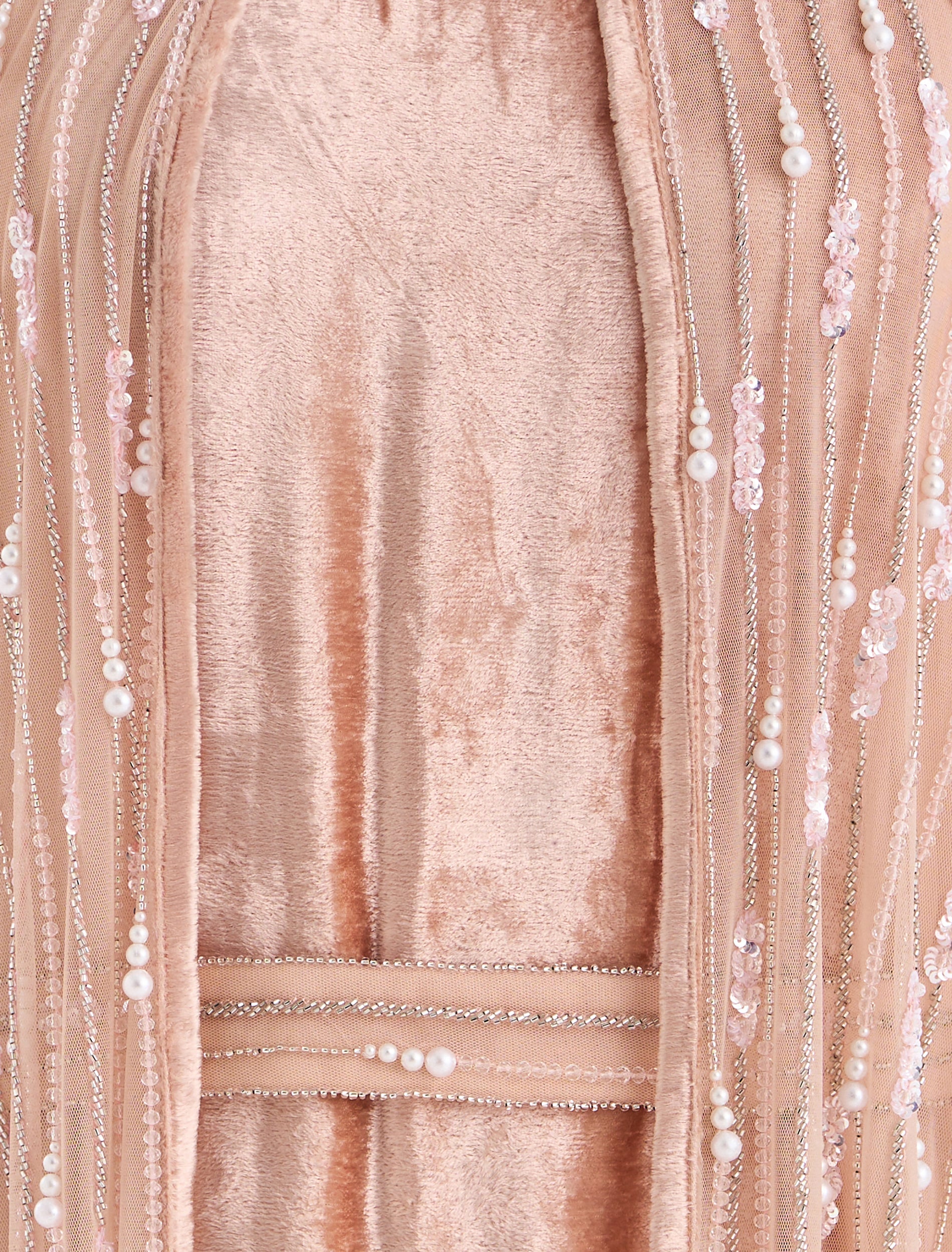 Shine in this velvet dress in nude pink with shimmering silver embroidery. Explore more of our evening dresses 2025 trends.