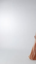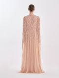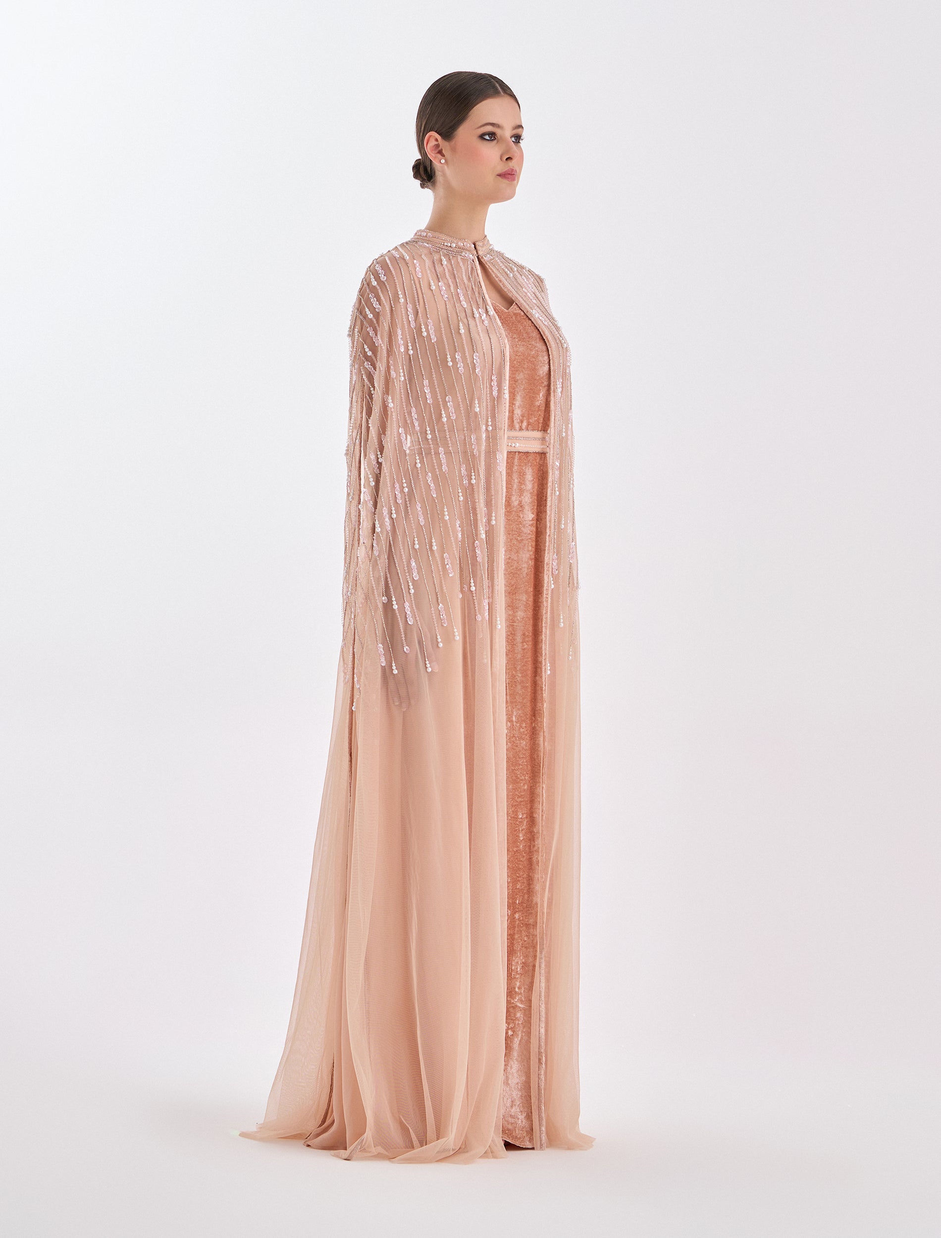 Embrace elegance in this velvet dress in a light pink color (nude) for a soft, modern look. Featuring a dress with cape from premium tulle, while the dress is made from velvet and a side layer of embroidered tulle with shimmering threads that brings royal allure. The 60-inch length of the pink dress offers flow and elegance. Shop for this dress with cape today, ideal for evenings and luxury events.