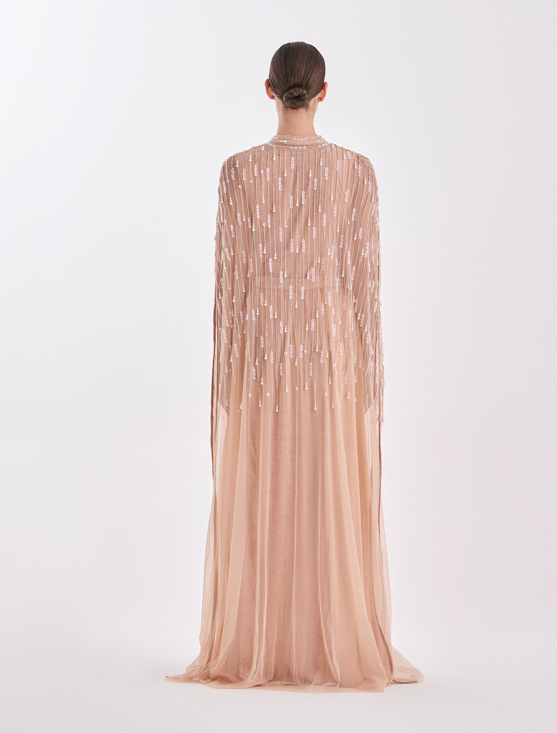 - Sleeves: A Long dress with cape from sheer tulle