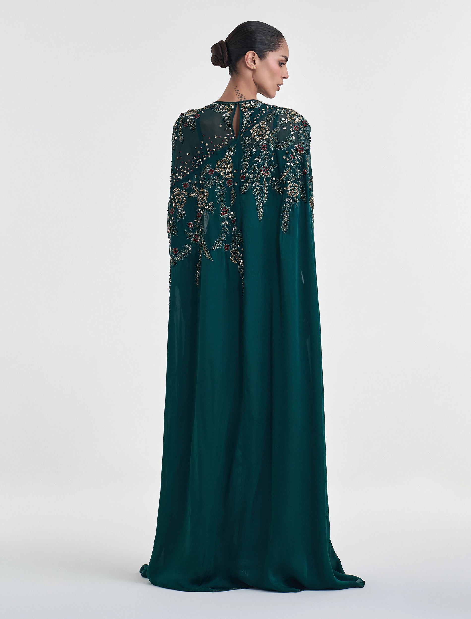 يعكس هذا فستان سهرة أخضر فاخر طويل سحر الطبيعة في تصميم يجمع بين الرقي والأنوثة. فستان سهرة مع كاب طويل مطرز متصل بالأكتاف ليمر فوق منطقة الصدر بشكل مائل وجزئي ثم يغطي الظهر والذراعين بوقار، مع تطريزات خيوط يدوية دقيقة.