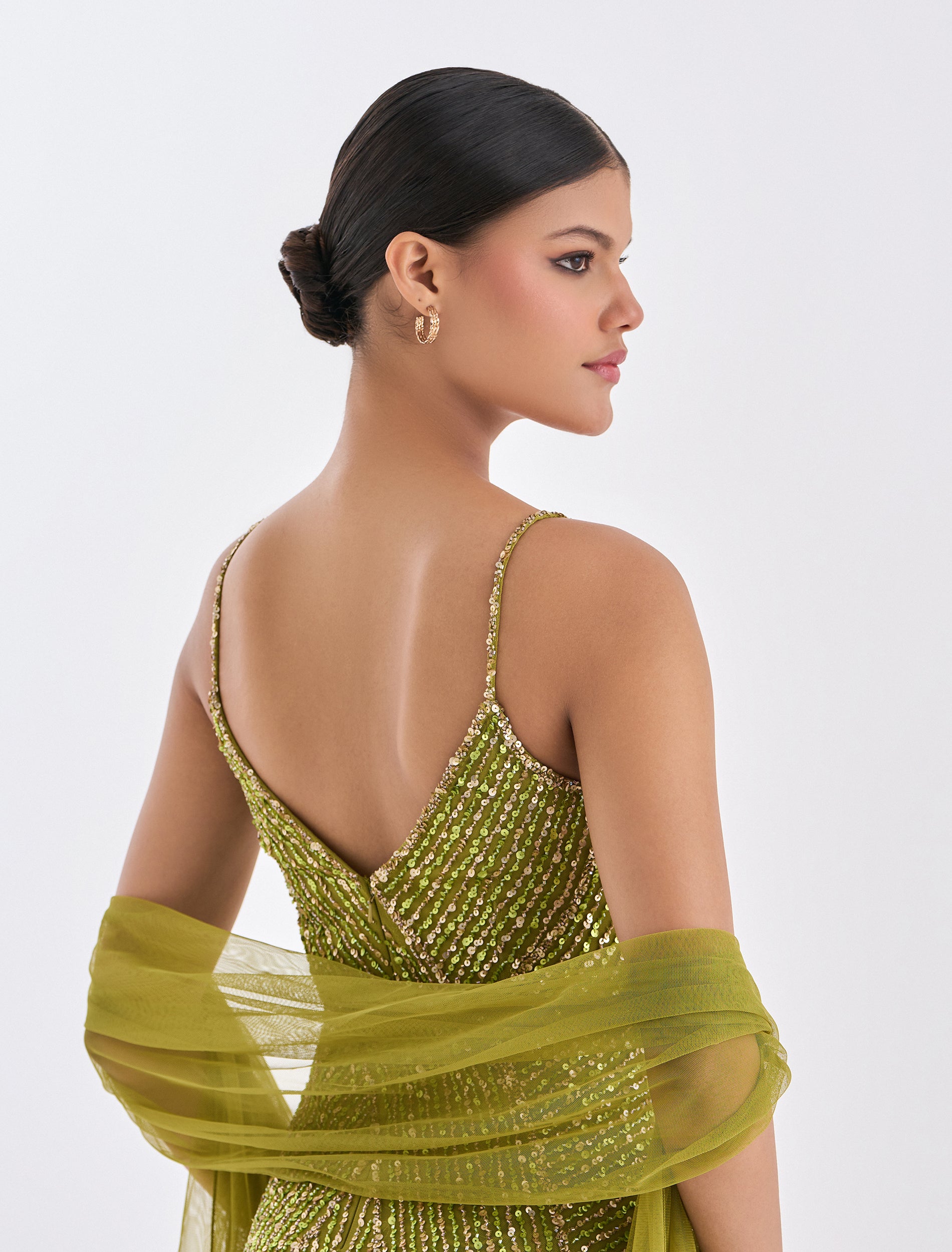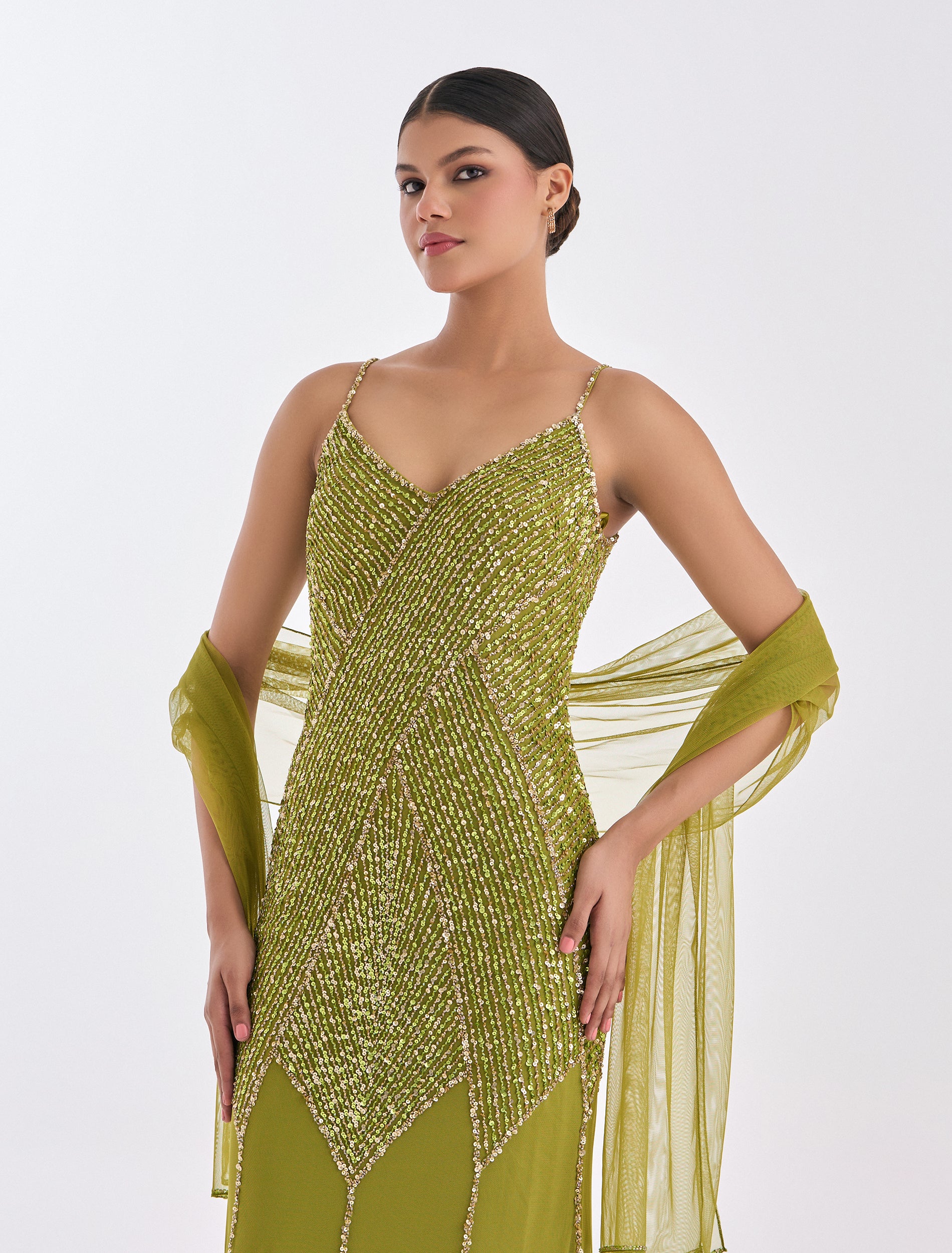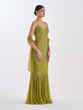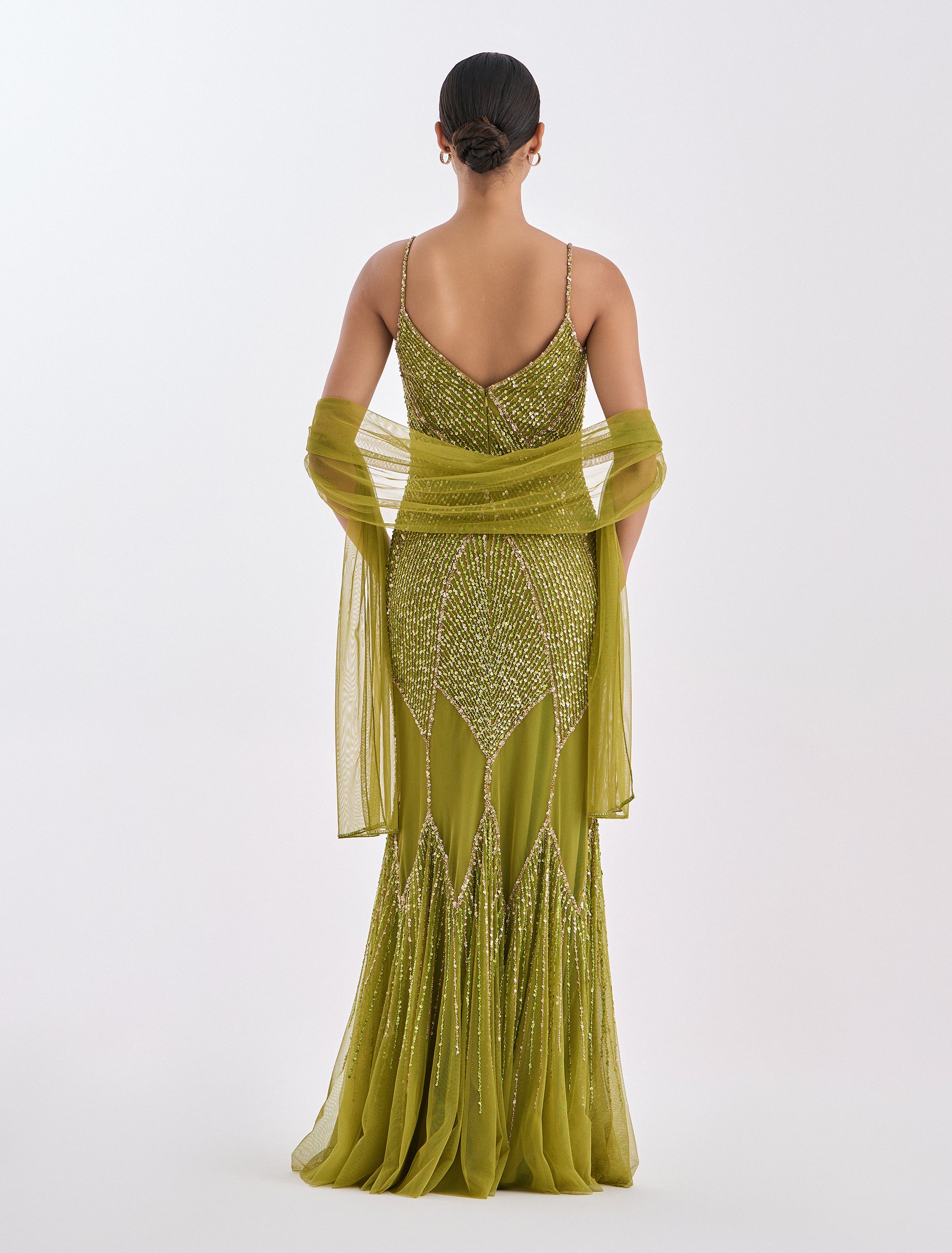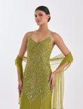 فستان سهرة مطرّز بالخرز مع شال تول مطرز يدوي