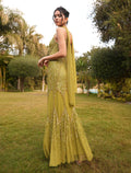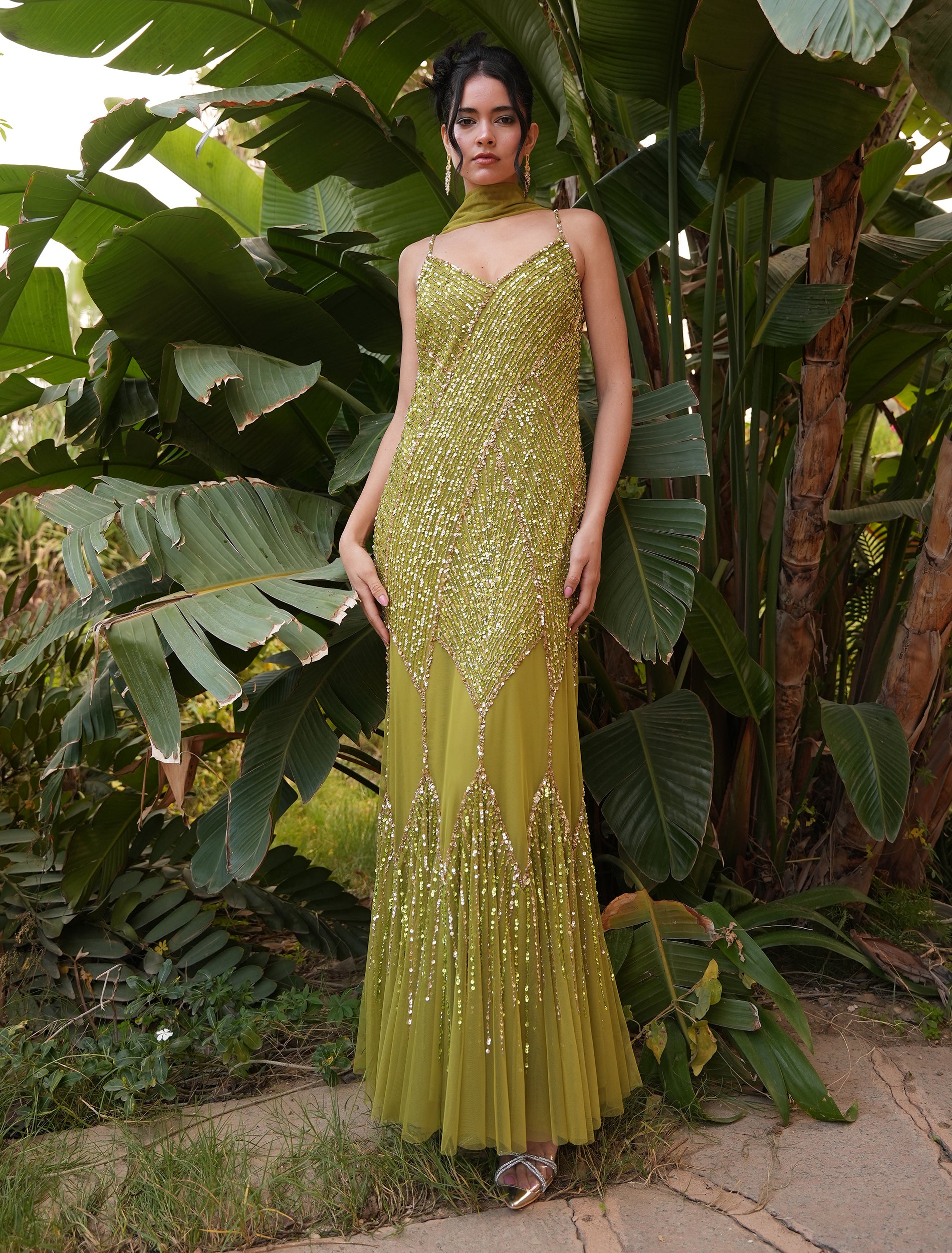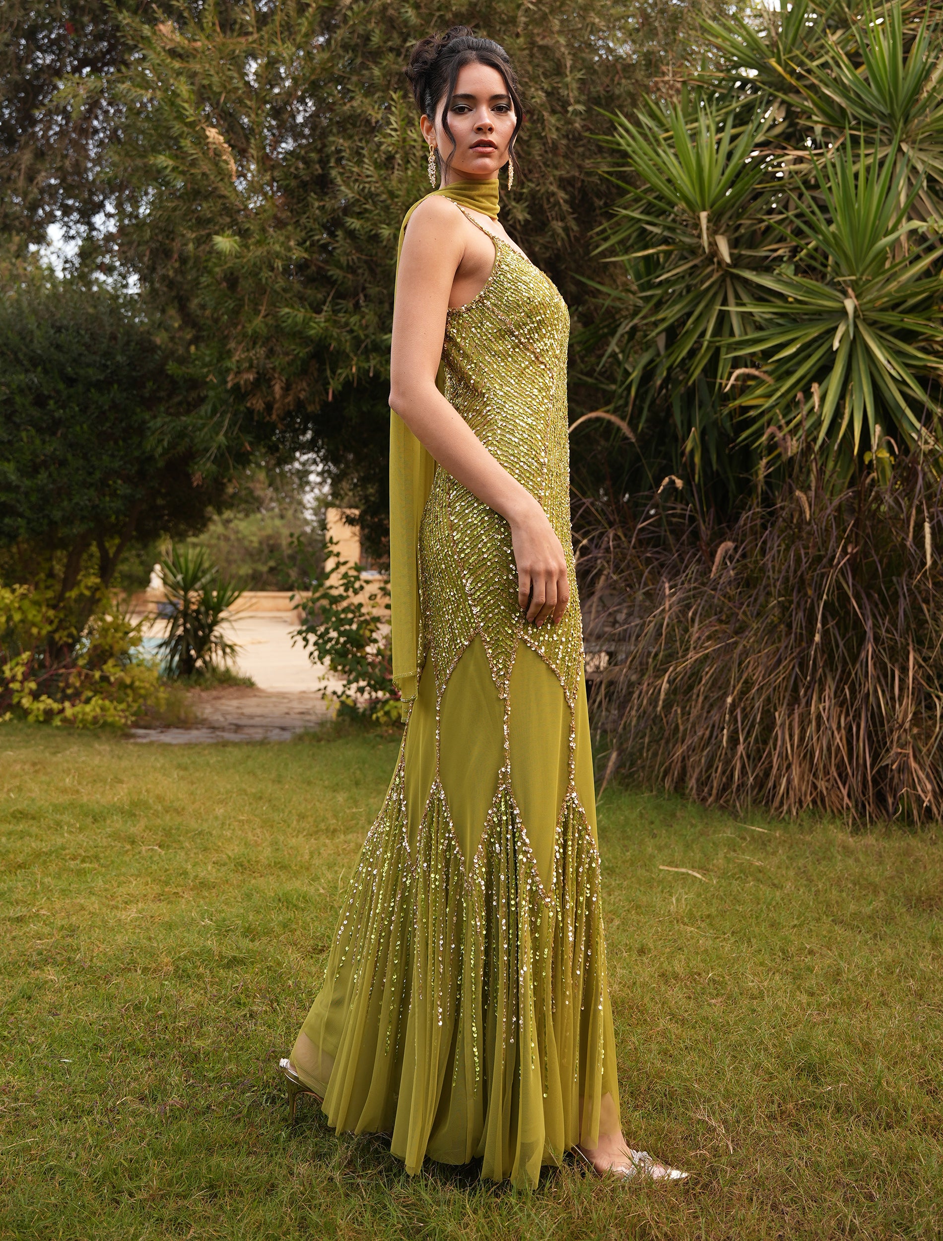 اطلبي فستان اخضر ليموني رائع من ماركة شالكي جزء من المجموعة الجديدة. فستان بحمالات رفيعة مع شال بسيط مع لمسات جمالية ساحرة.