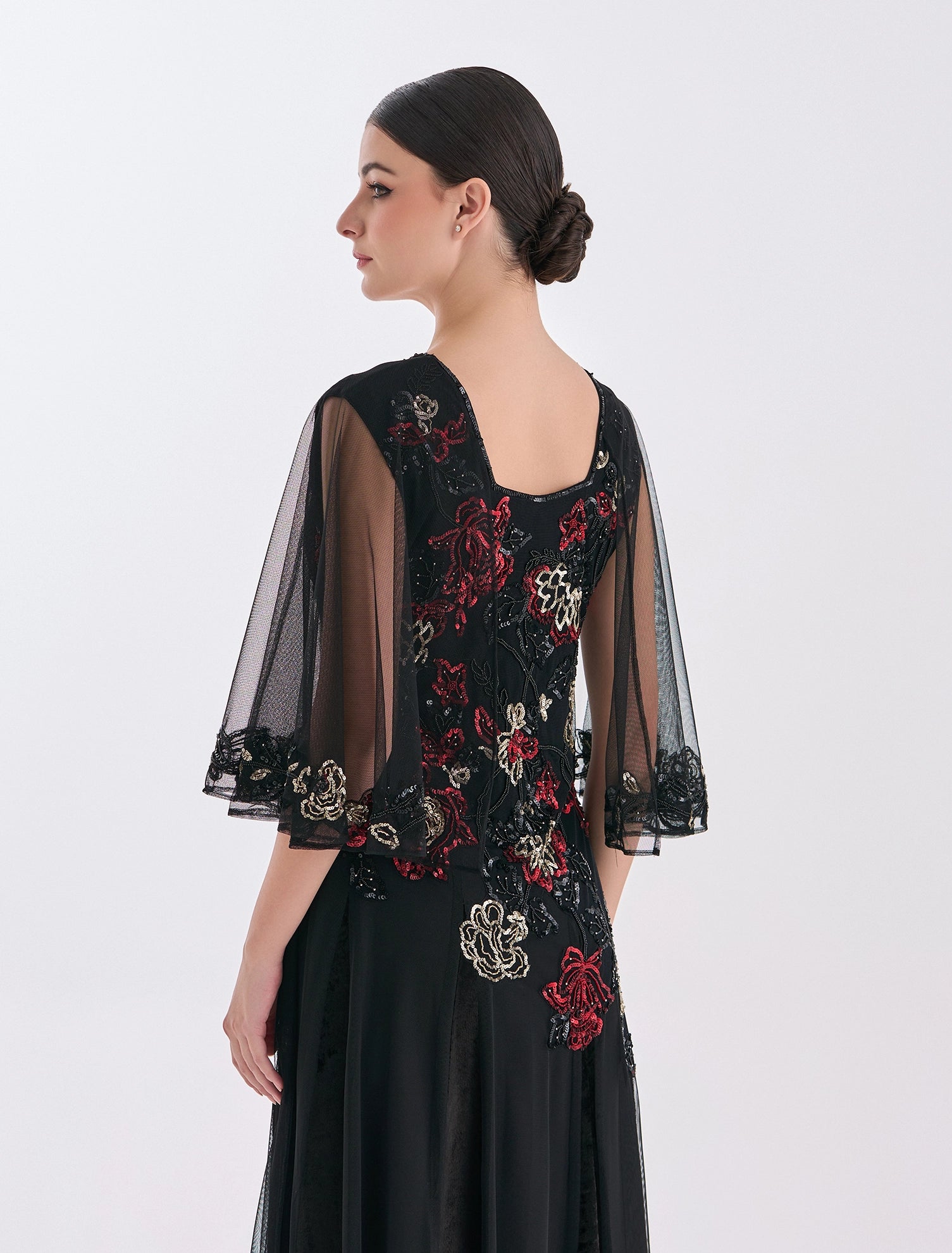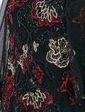 تميّزي بفستان سهرة أسود طويل بأكمام متوسطة الطول من شالكي بتصميم يجمع بين الرقي والأنوثة. يزدان الفستان بتطريزات يدوية لامعة باللون الذهبي، الأحمر والأسود الناعم. أما الأكمام فتأتي متوسطة الطول فضفاضة من التول الناعم لتضفي حركة وأناقة لتصميم الفستان.