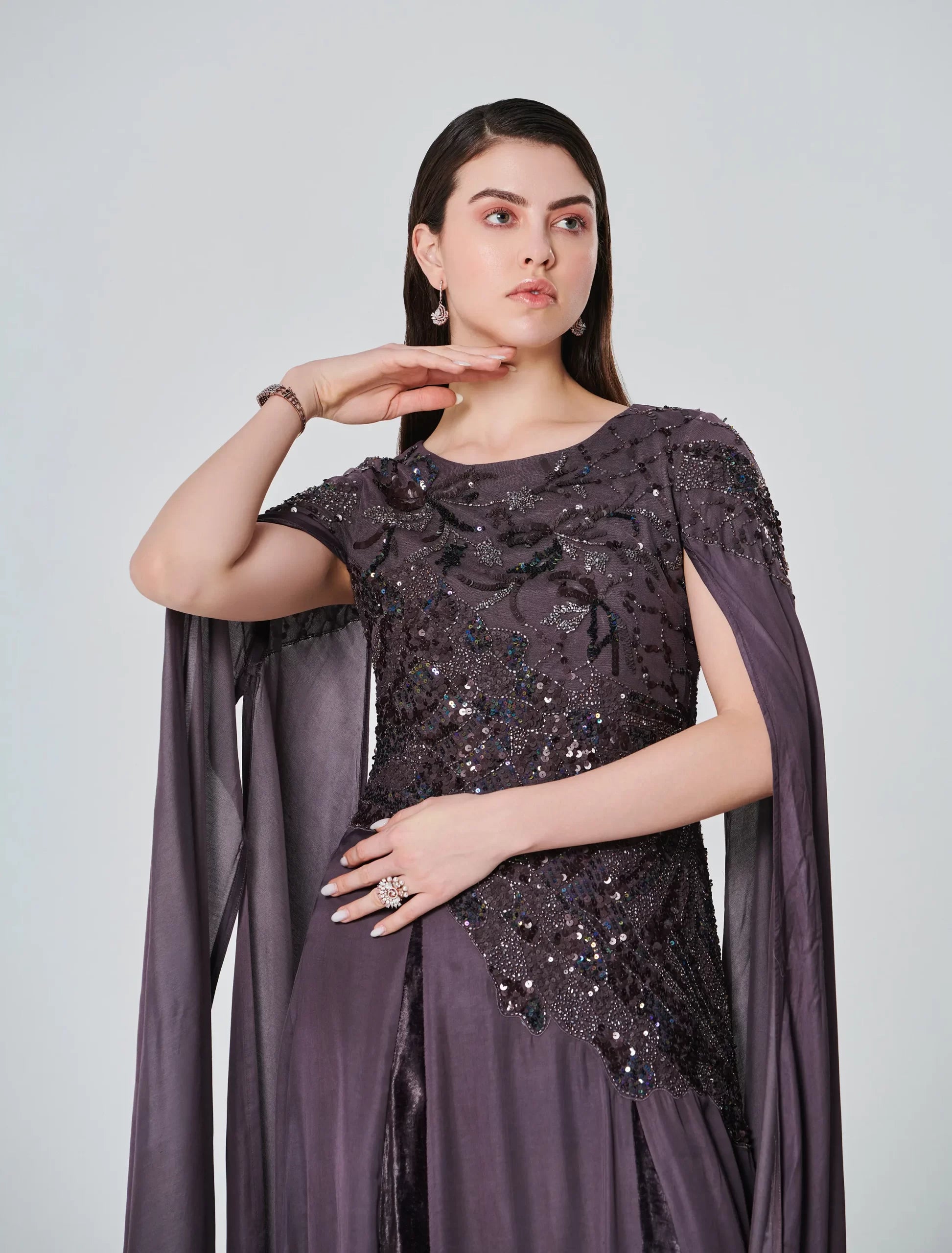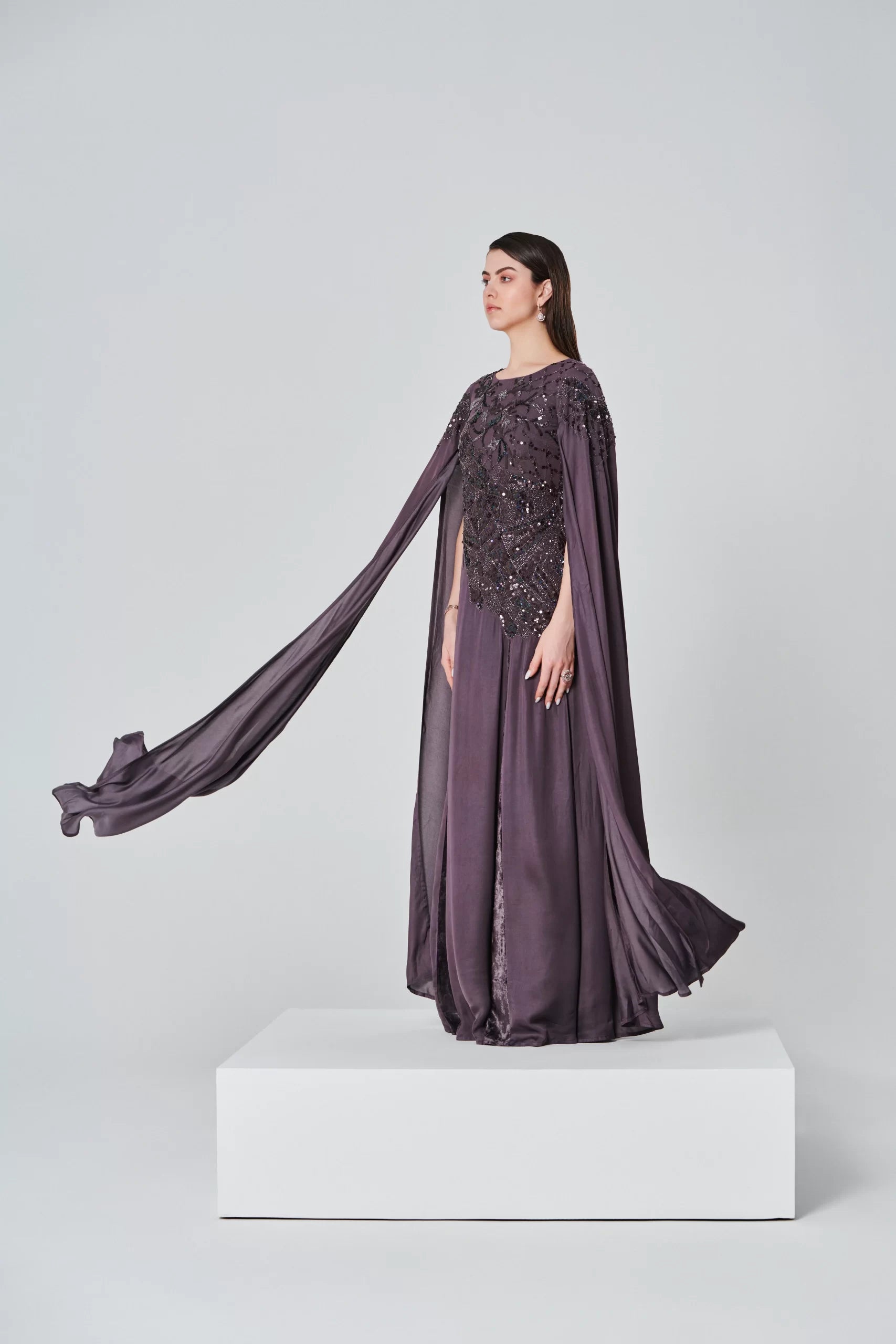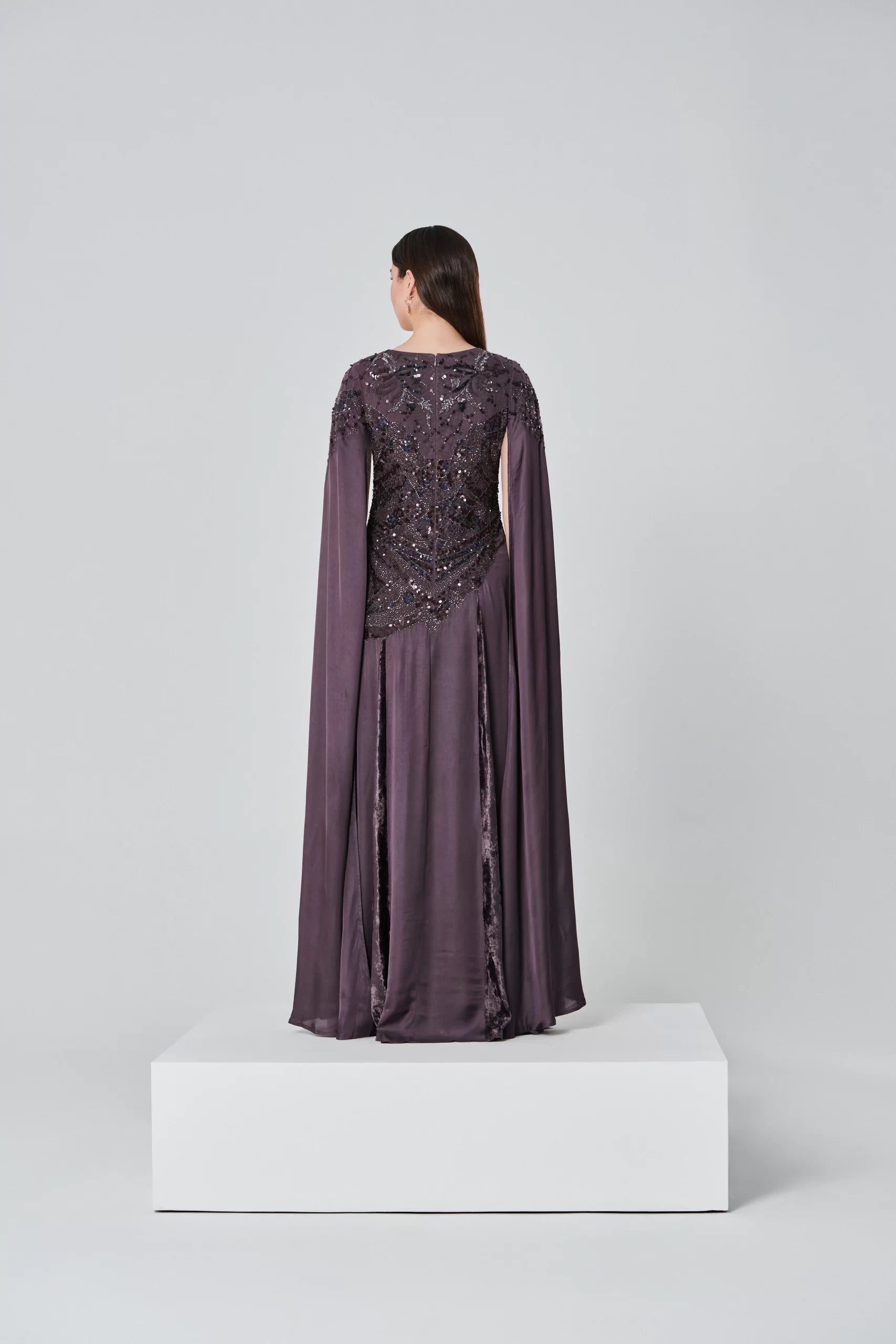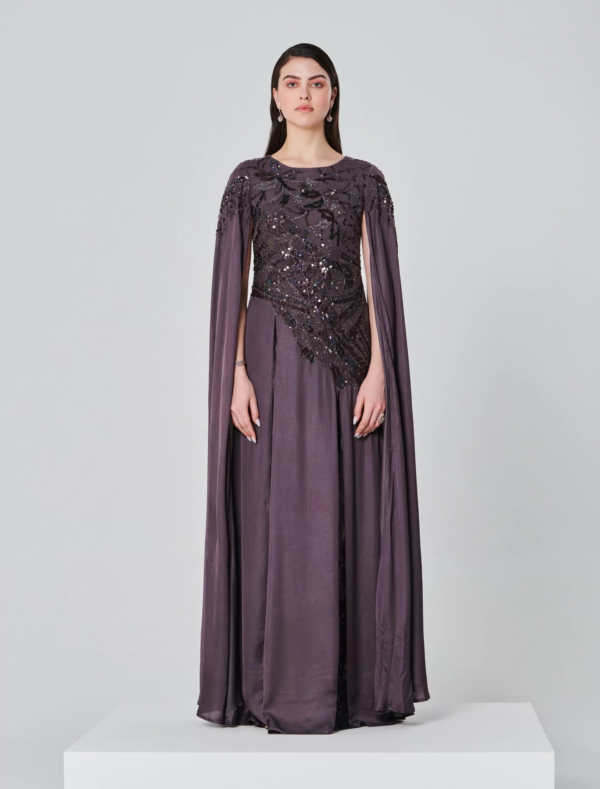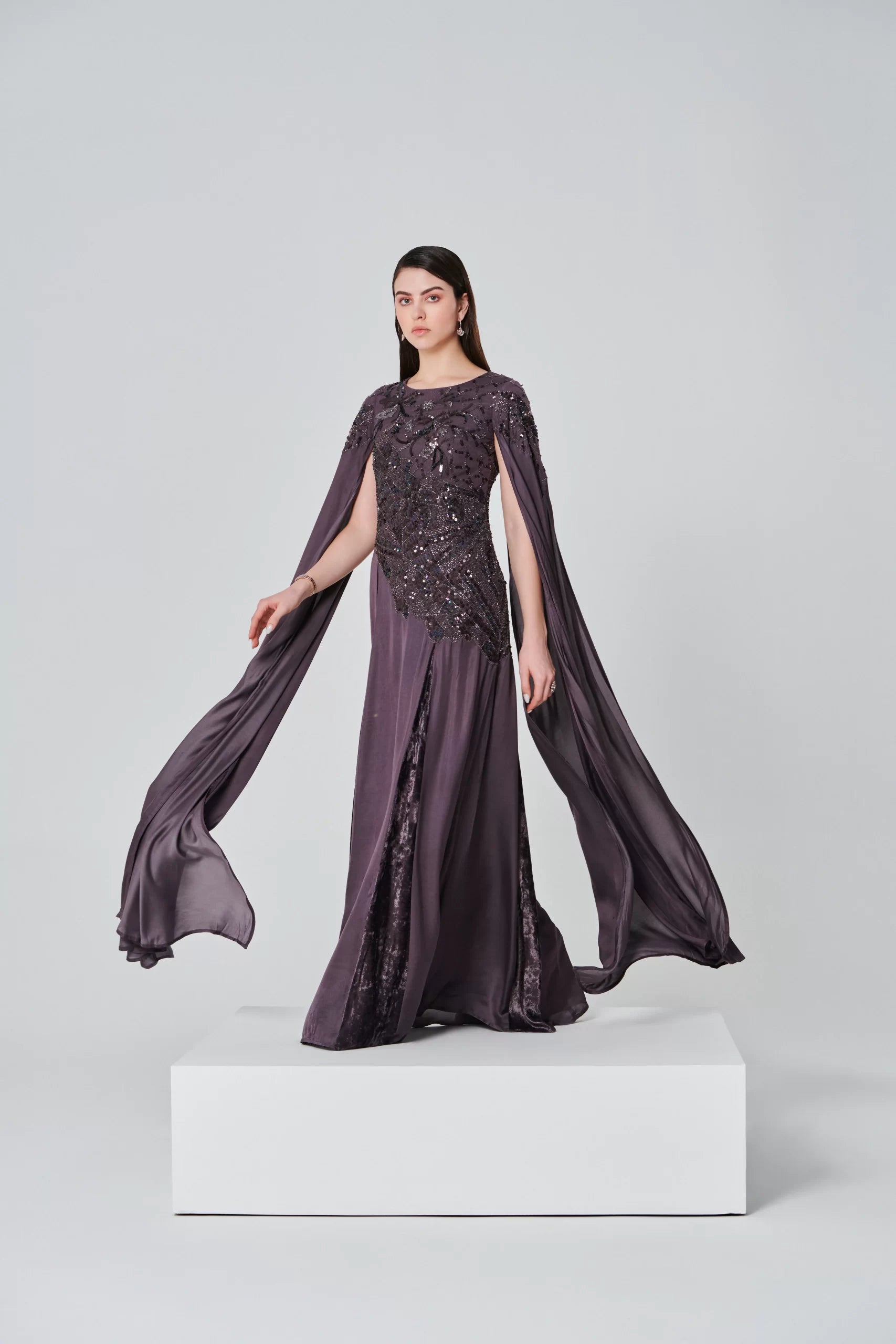 فستان باذنجاني سهرة بأكمام كيب شيفون أنيقة
