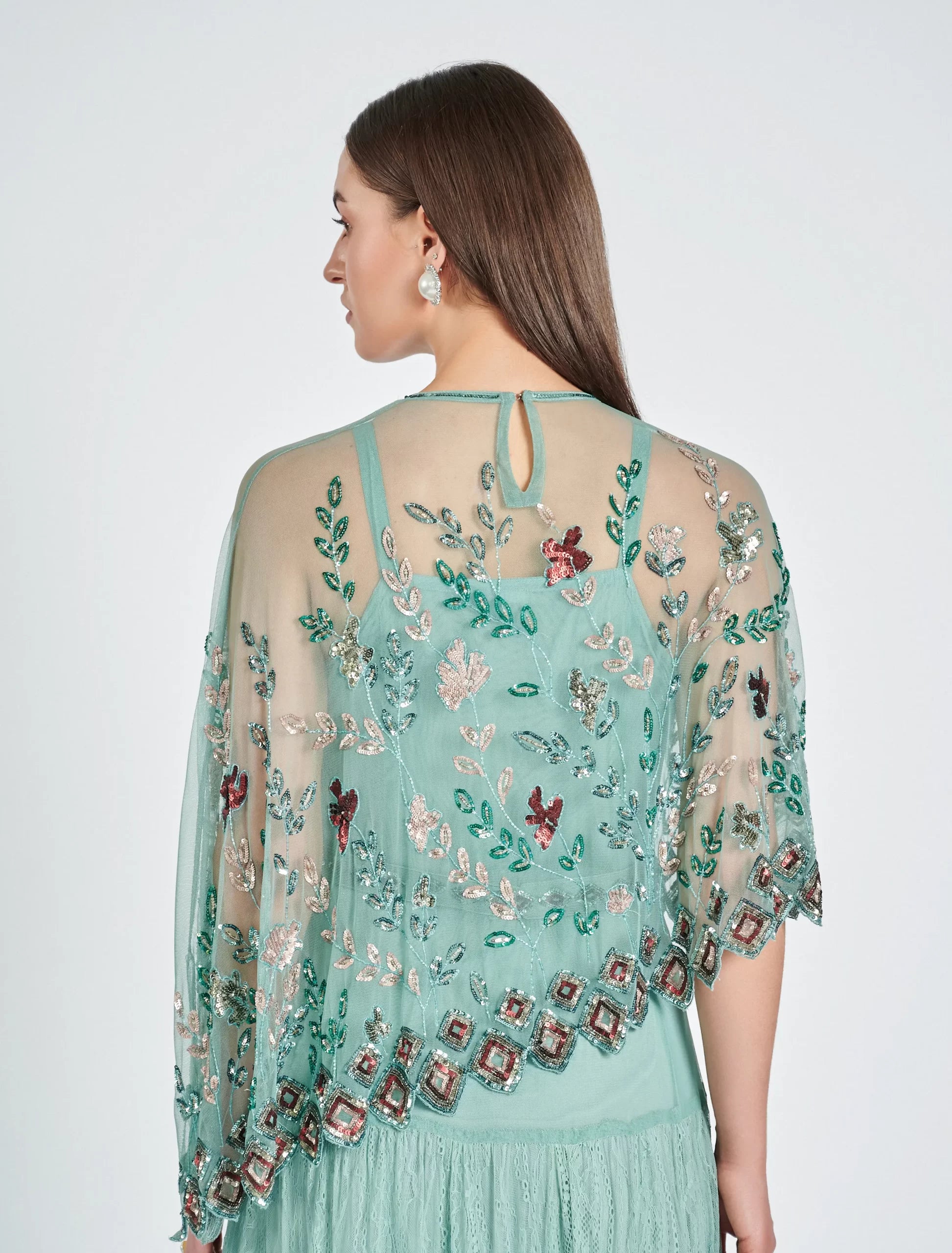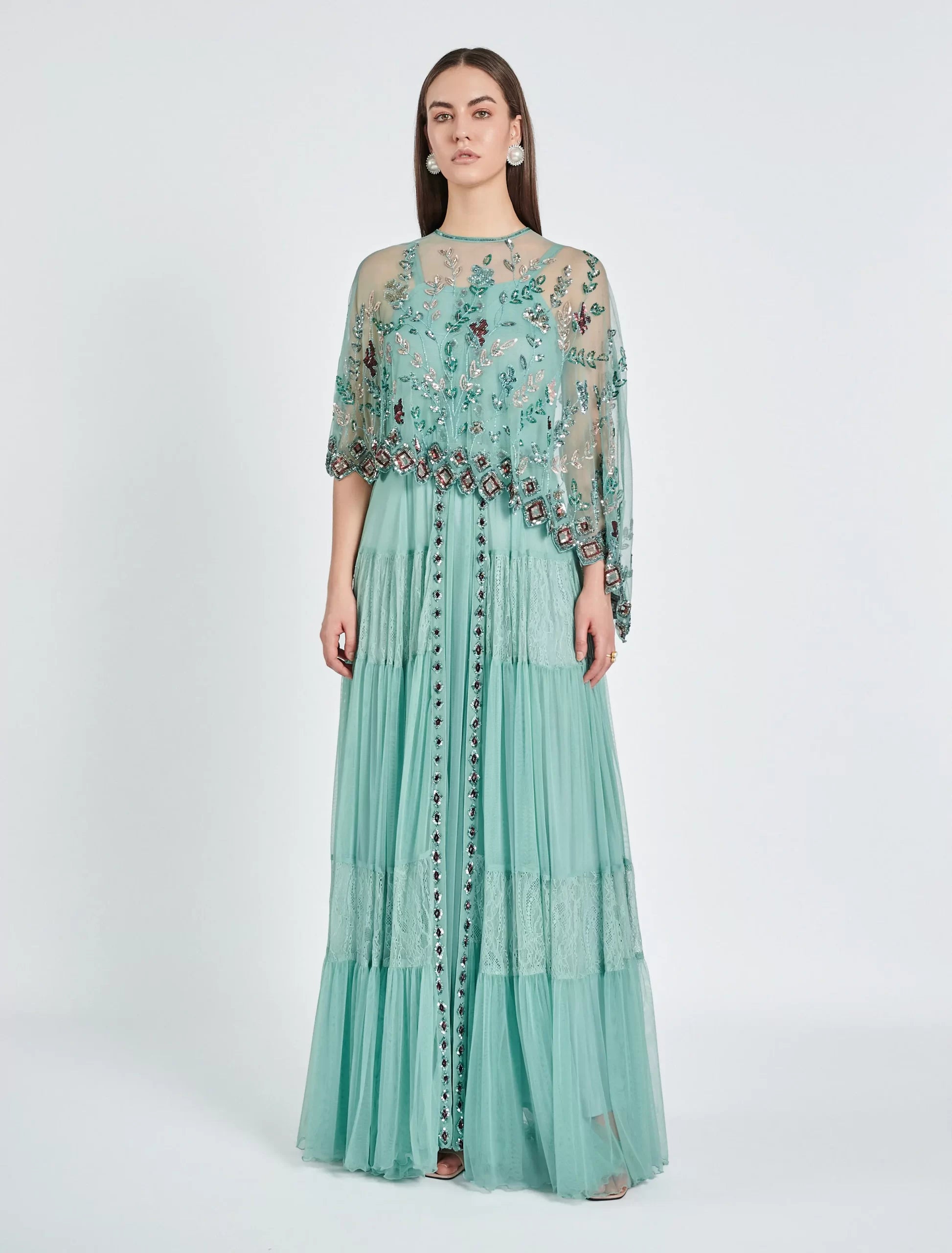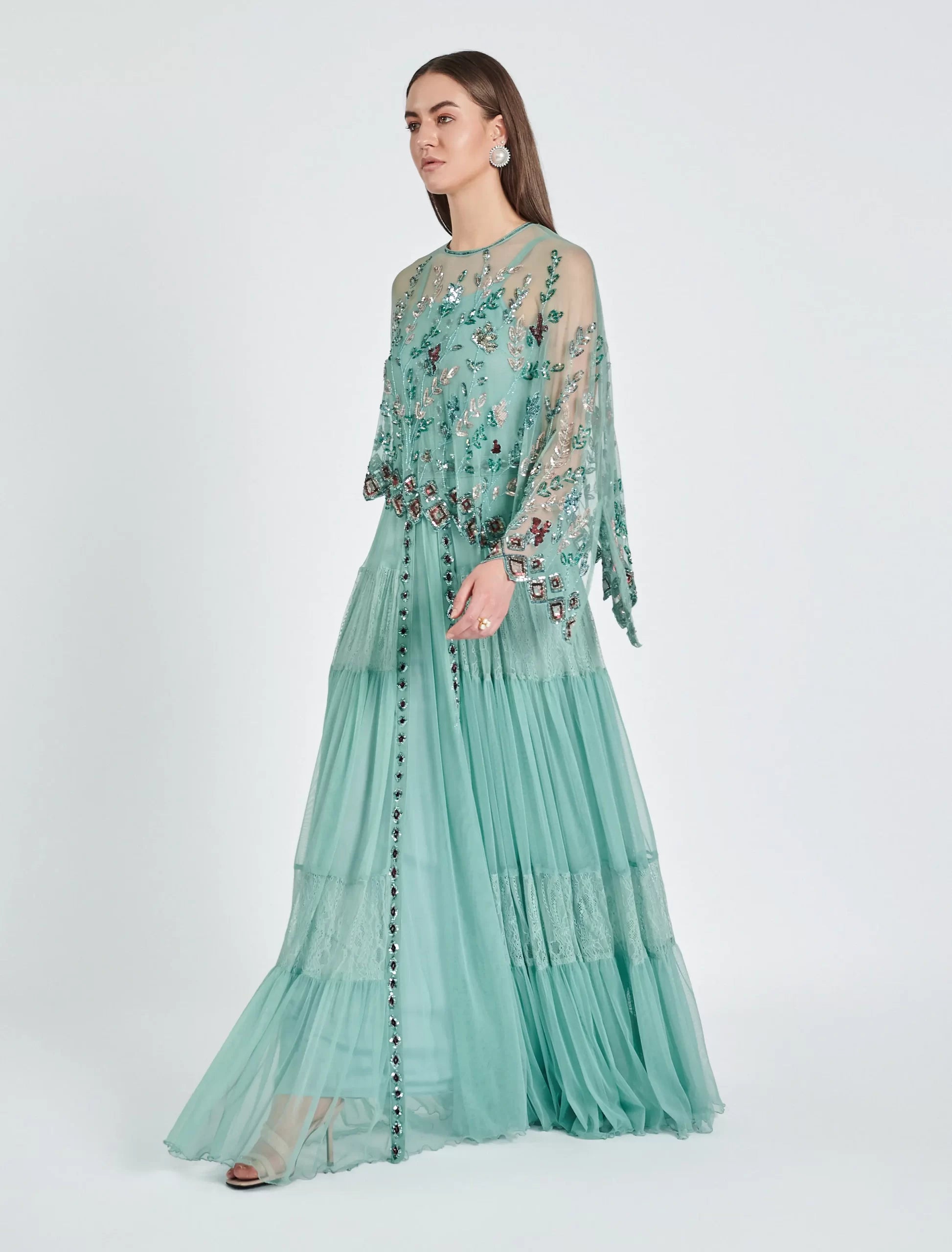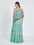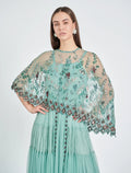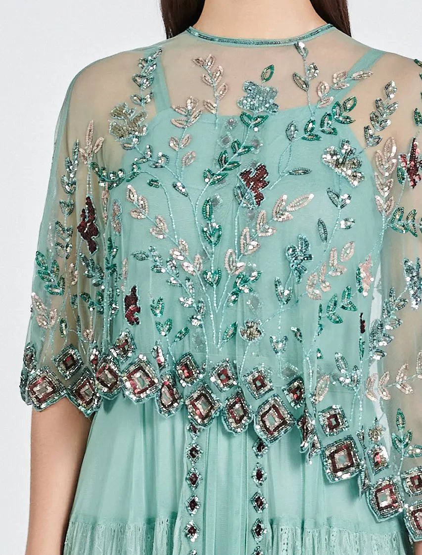 فستان سهره اسود طويل مطرز يجمع بين الفخامة والرقي بتصميم كاب ملكي فاخر. يتميز الفستان برقبة مربعة من الشيفون مع أكمام كاب واسعة قصيرة مصنوعة من الشيفون الراقي. فستان تطريز يدوي بتطريزات ملونة بأشكال نباتية وهندسية تزين الكاب. أما التصميم فهو يتكون من قطعتين الفستان الداخلي مع الكاب القصير المطرز أما من الأِسفل فهو منفوش بستايل طبقات شيفون ناعمة مما يضفي لمسة ملكية. فستان سهرة مع كاب خيار مثالي من أرقى فساتين الحفلات لتظهري بإطلالة مميزة ونادرة في حفلاتك ومناسباتك الخاصة.