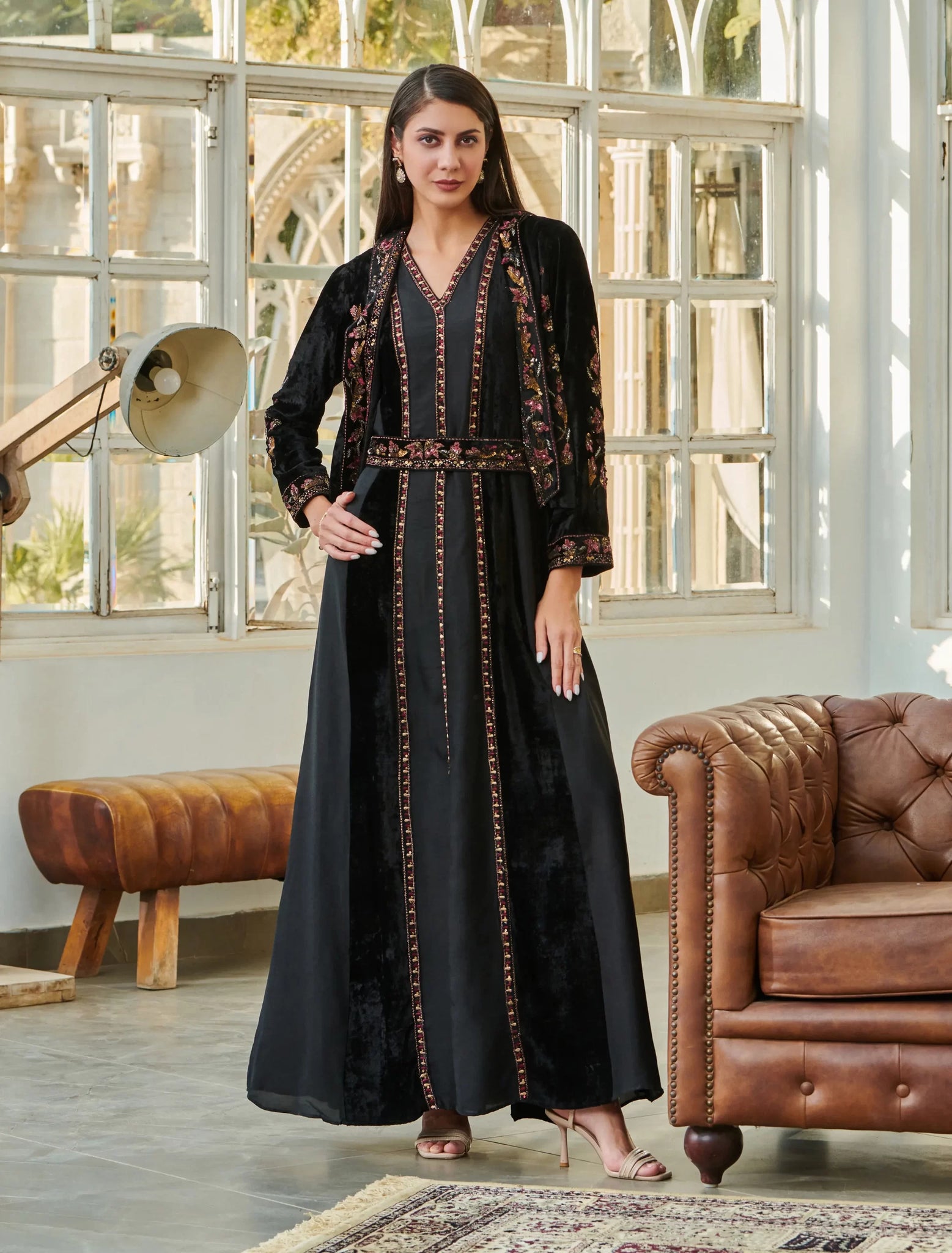 هذا فستان اسود باكمام طويله على شكل تصميم كاب فخم يجمع بين المخمل الناعم مما يجعله مثالي لمناسبات الشتاء والسهرات بأنواعها. يحتوي على تطريز يدوي أنيق بألوان فضية وزهرية. فيما يأتي الفستان برقبة دائرية مغلق وكاب واسع قصير على شكل جاكيت. طول فستان اسود سهرة 60 إنش ينساب بشكل متدرج من الأمام والخلف ليعطيك إطلالة ملكية.