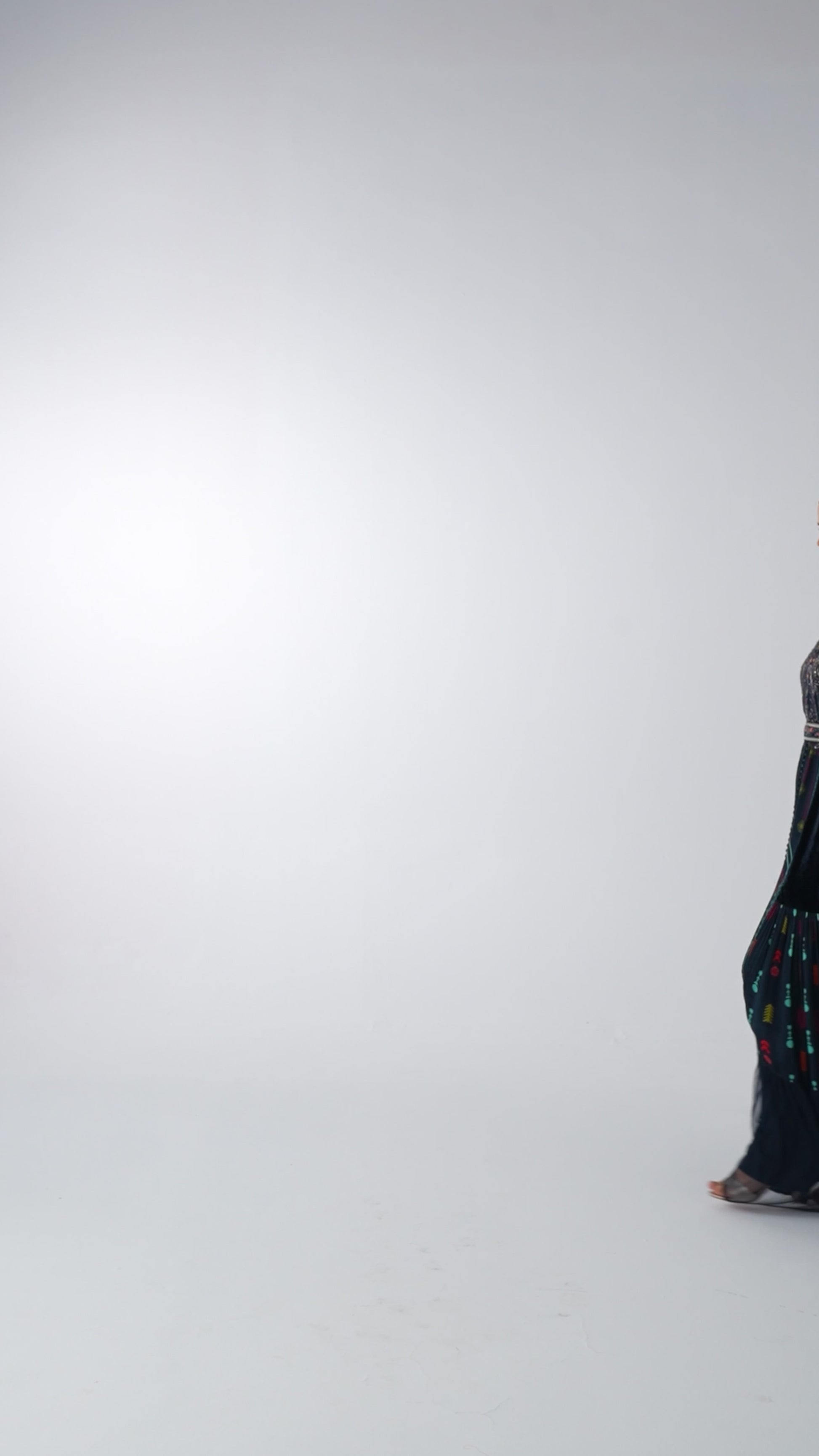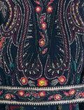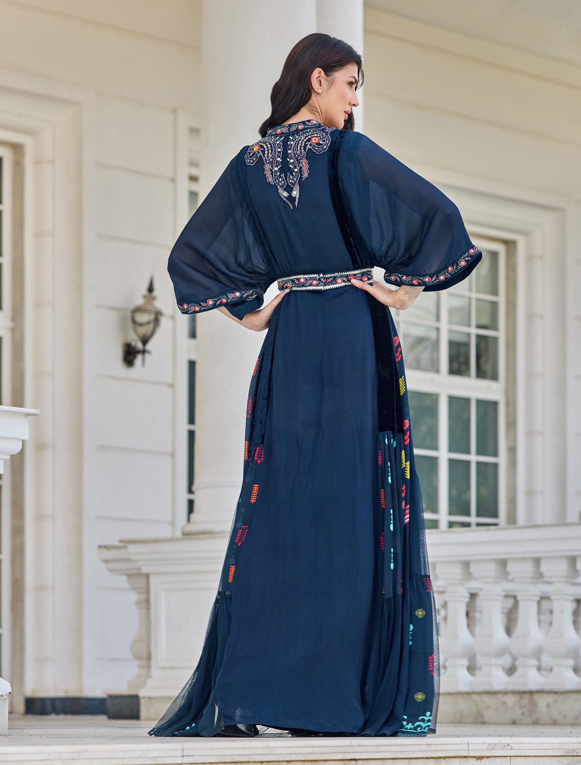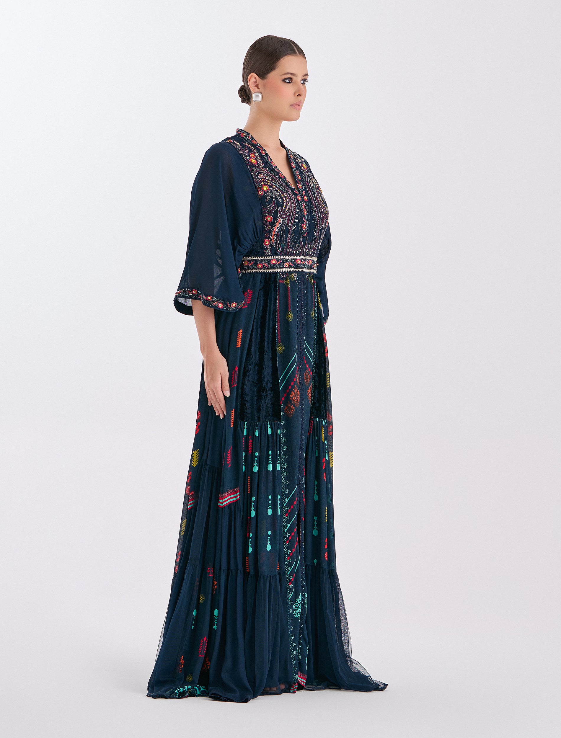 فستان سهرة بلون كحلي يجمع بين اللمسة الفنية والأنوثة الهادئة بتفاصيل متقنة على الصدر والخصر. فستان باكمام واسعه متوسطة الطول (كيمونو) بتطريز يدوي على الأطراف مما يضيف لمسة كلاسيكية.