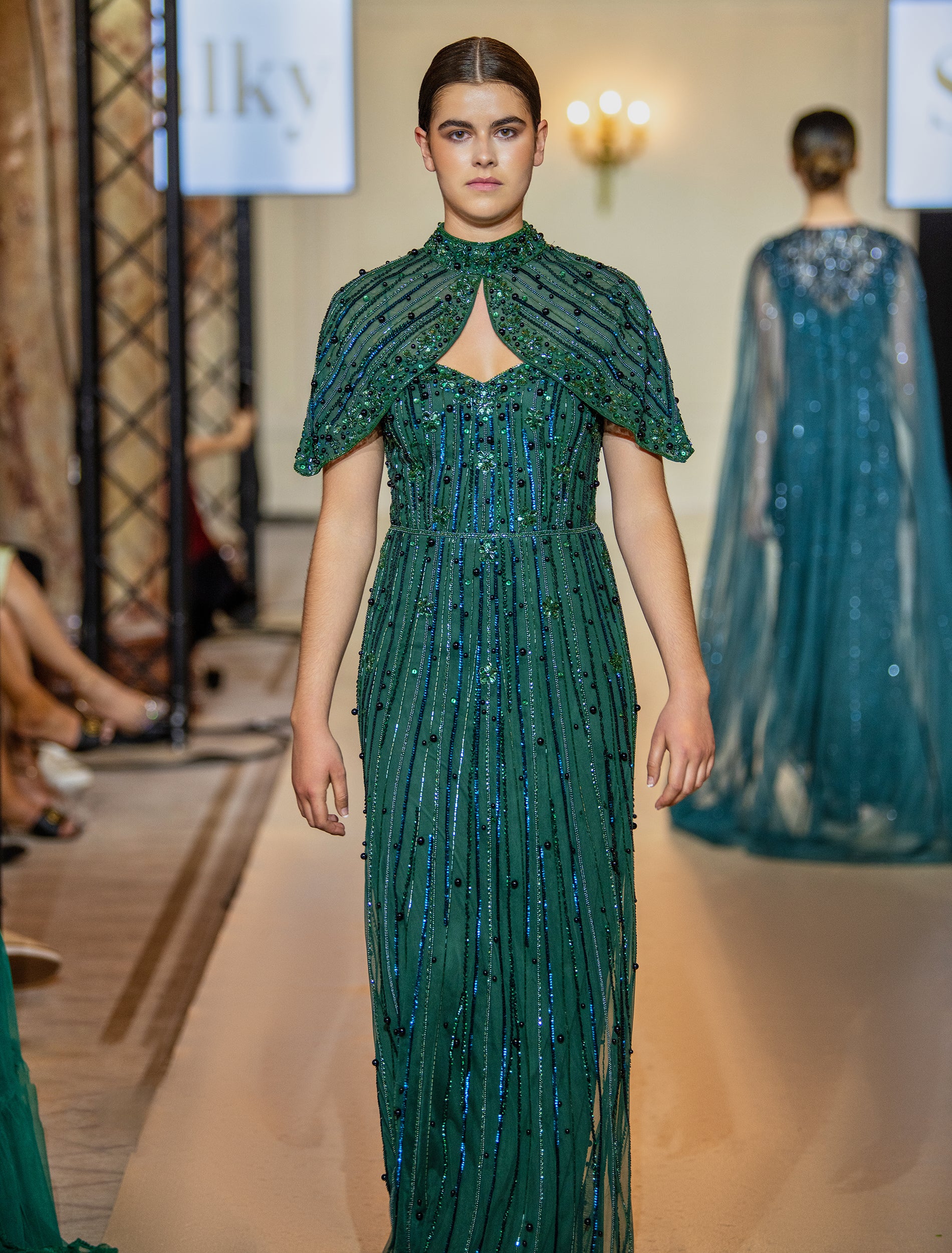 تألقي بفستان سهرة اخضر ملكي بتطريز يدوي لامع من أرقى فساتين حفلات فخمة لدى شالكي وأبهري الكل بطلتك.