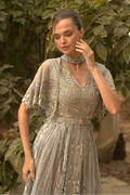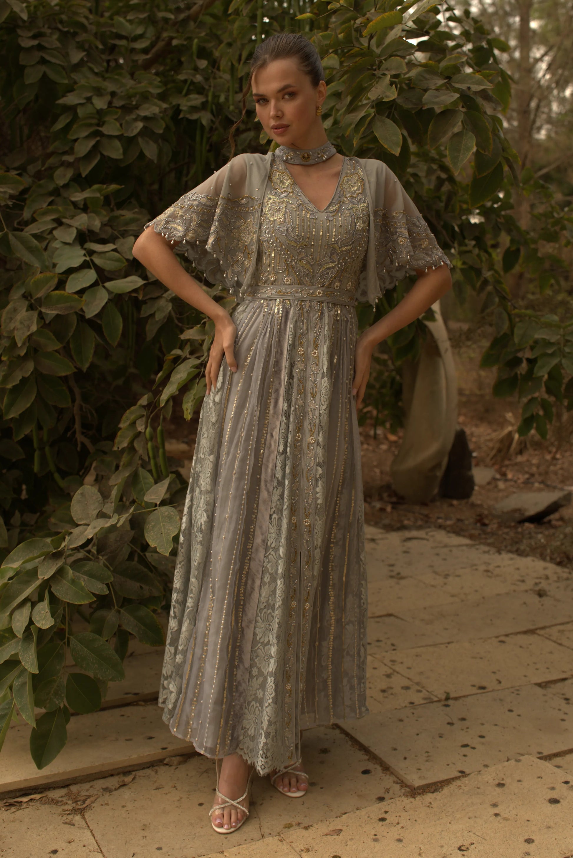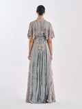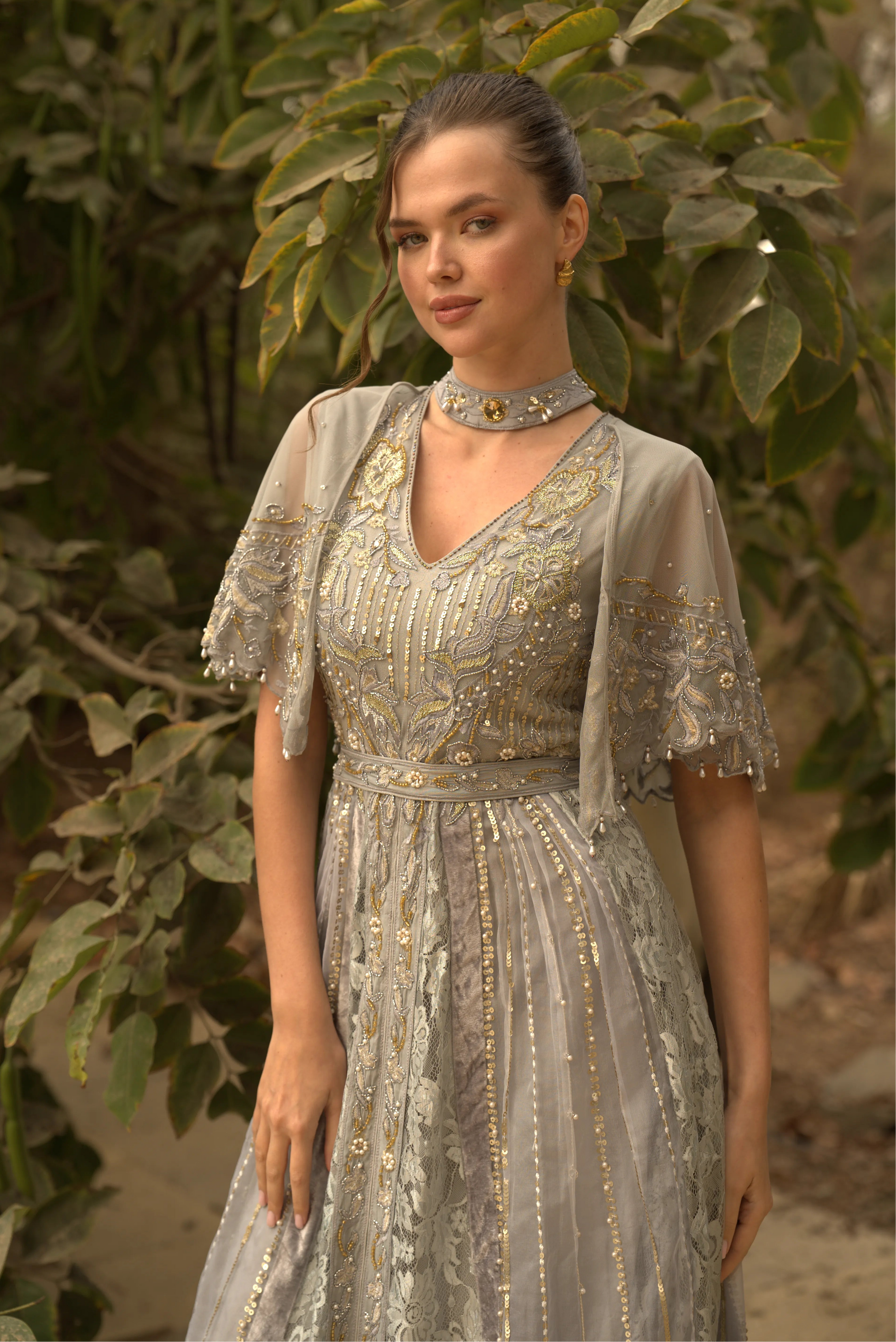 تميزي بفستان بقصة امبير بتصميم راقٍ يعكس الفخامة الكلاسيكية. يأتي بقصة انسيابية طويلة مع تطريز يدوي يبرز جمال التفاصيل بدقة. خاماته الناعمة من التٌل، الدانتيل الرمادي، والمخمل تمنحك حضورًا أنيقًا ومريحًا في المناسبات الخاصة والسهرات الرسمية. فستان سهرة رمادي بستايل سهرات مع طوق مطرّز يبرز جمال الرقبة بأسلوب محتشم مع اكمام قصيرة ليمنحك إطلالة متوازنة وراقية.