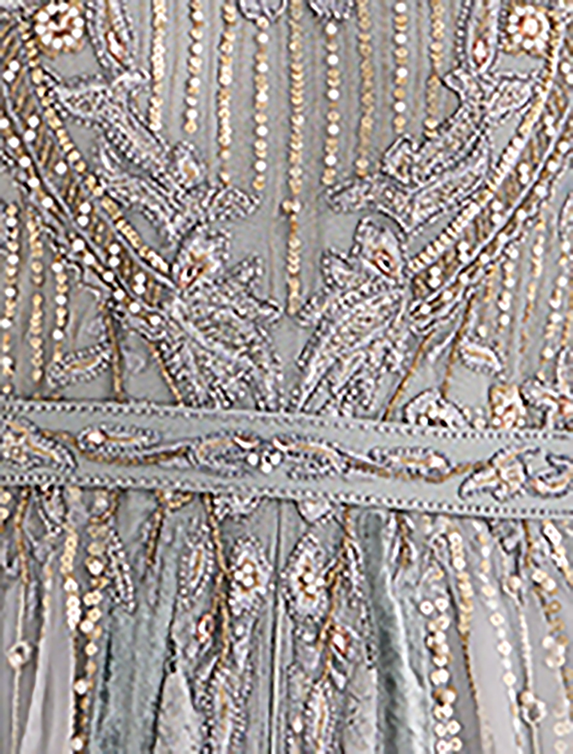 - القصة من الأمام: فستان بقصة امبير انسيابية طويلة مع خطوط تطريز عمودية مع طبقات سفلية من الدانتيل والتُل