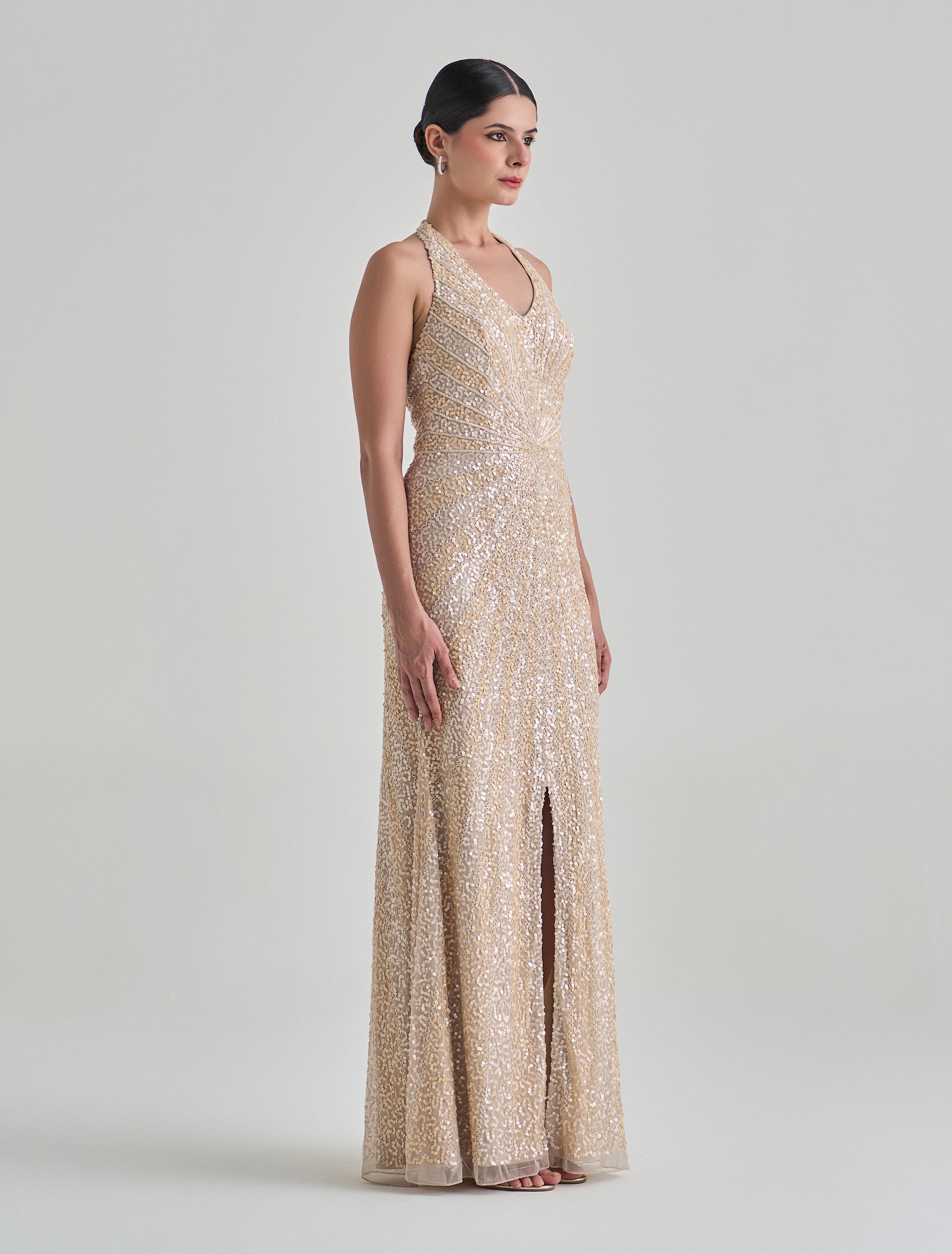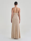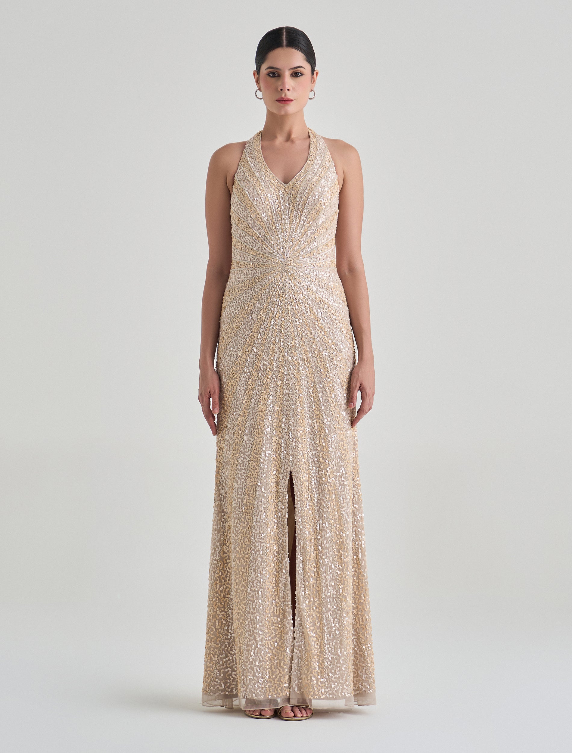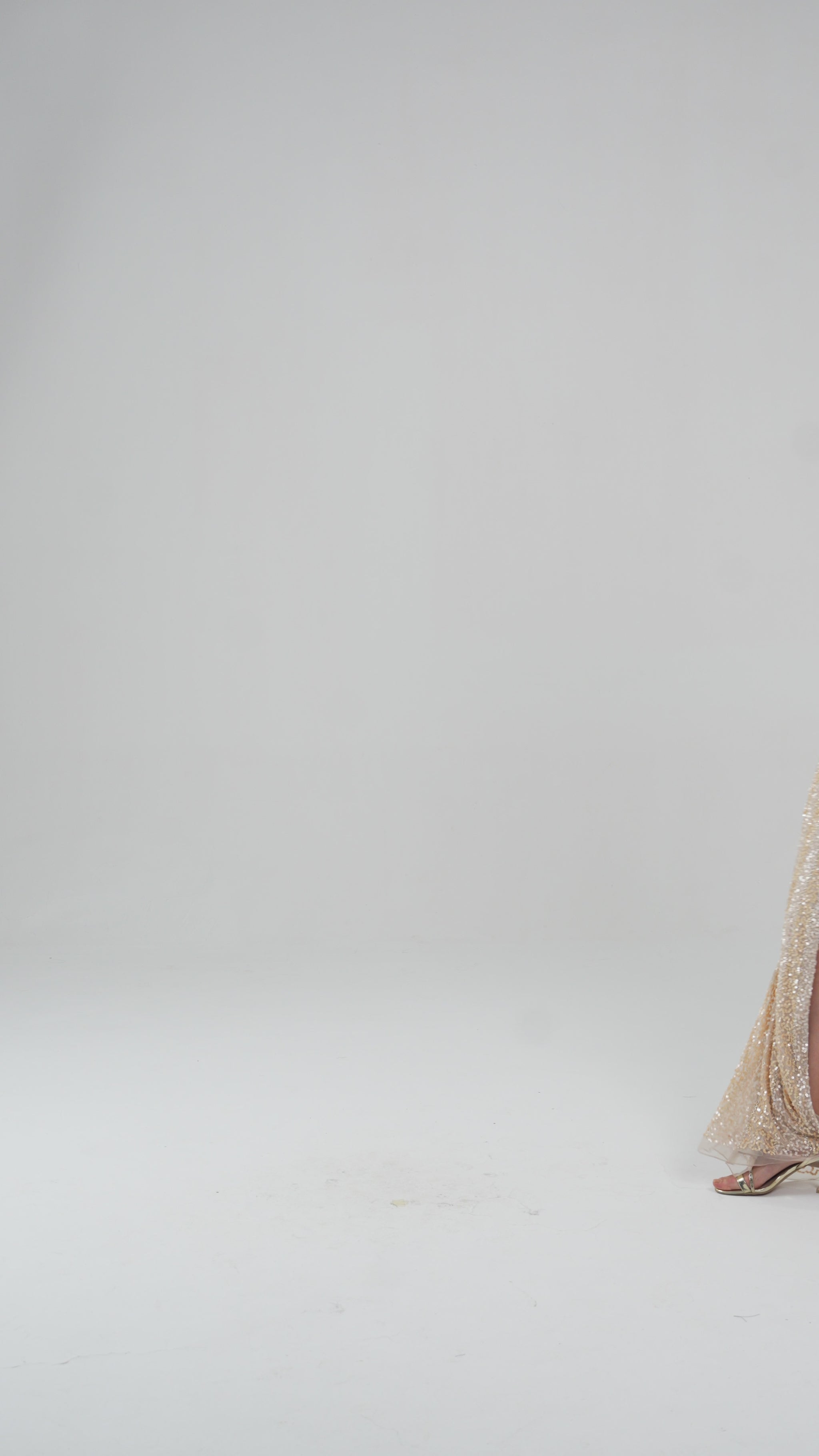 قصة الفستان الأمامية: ضيقة محددة للخصر من الأعلى، واسعة بانسيابية ملكية مع فتحة من الأسفل.