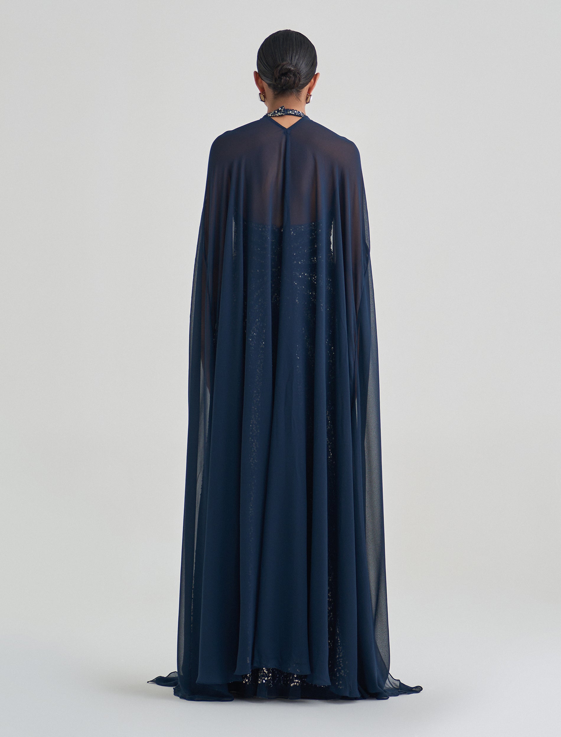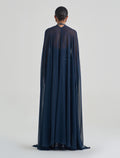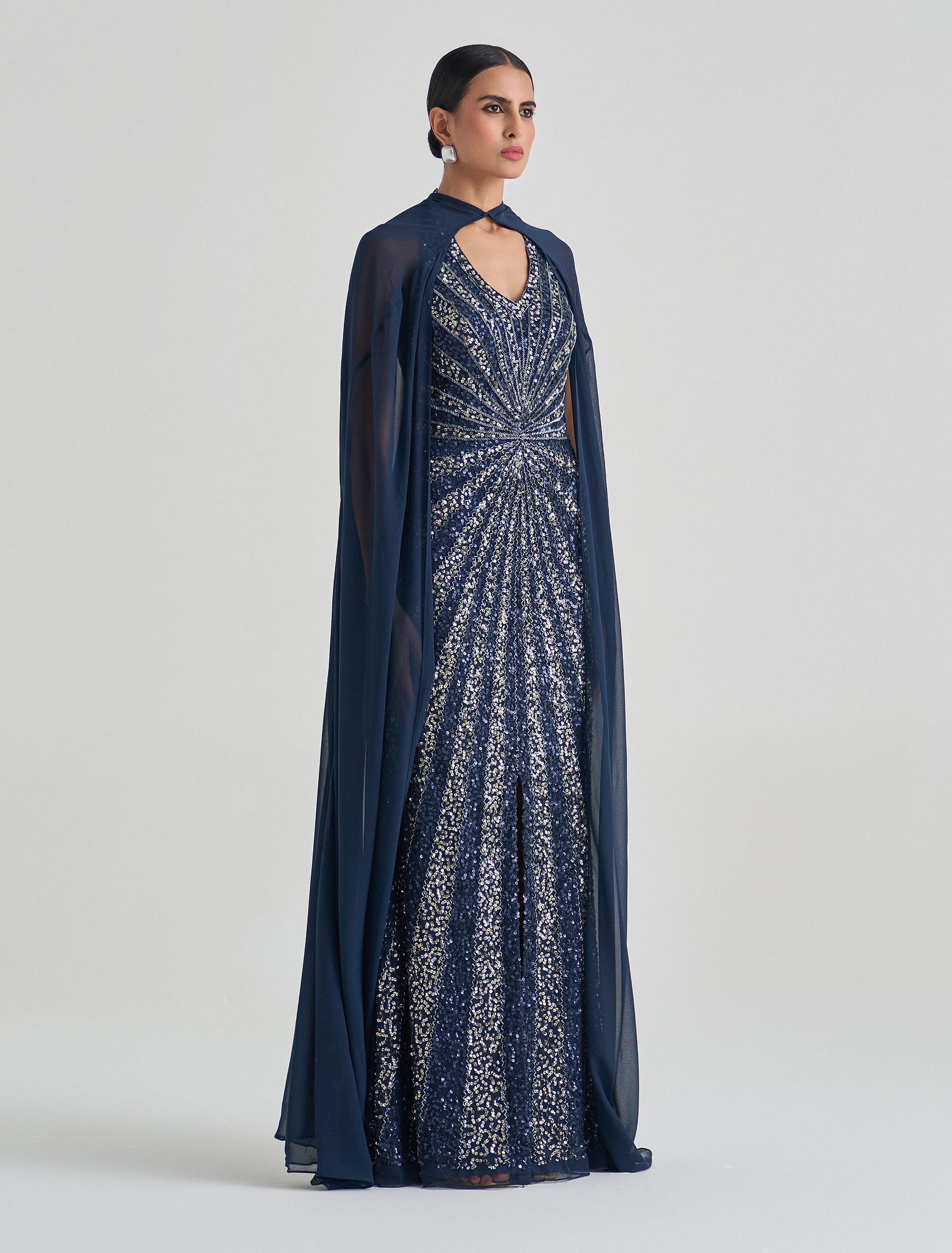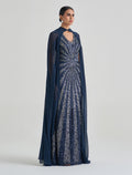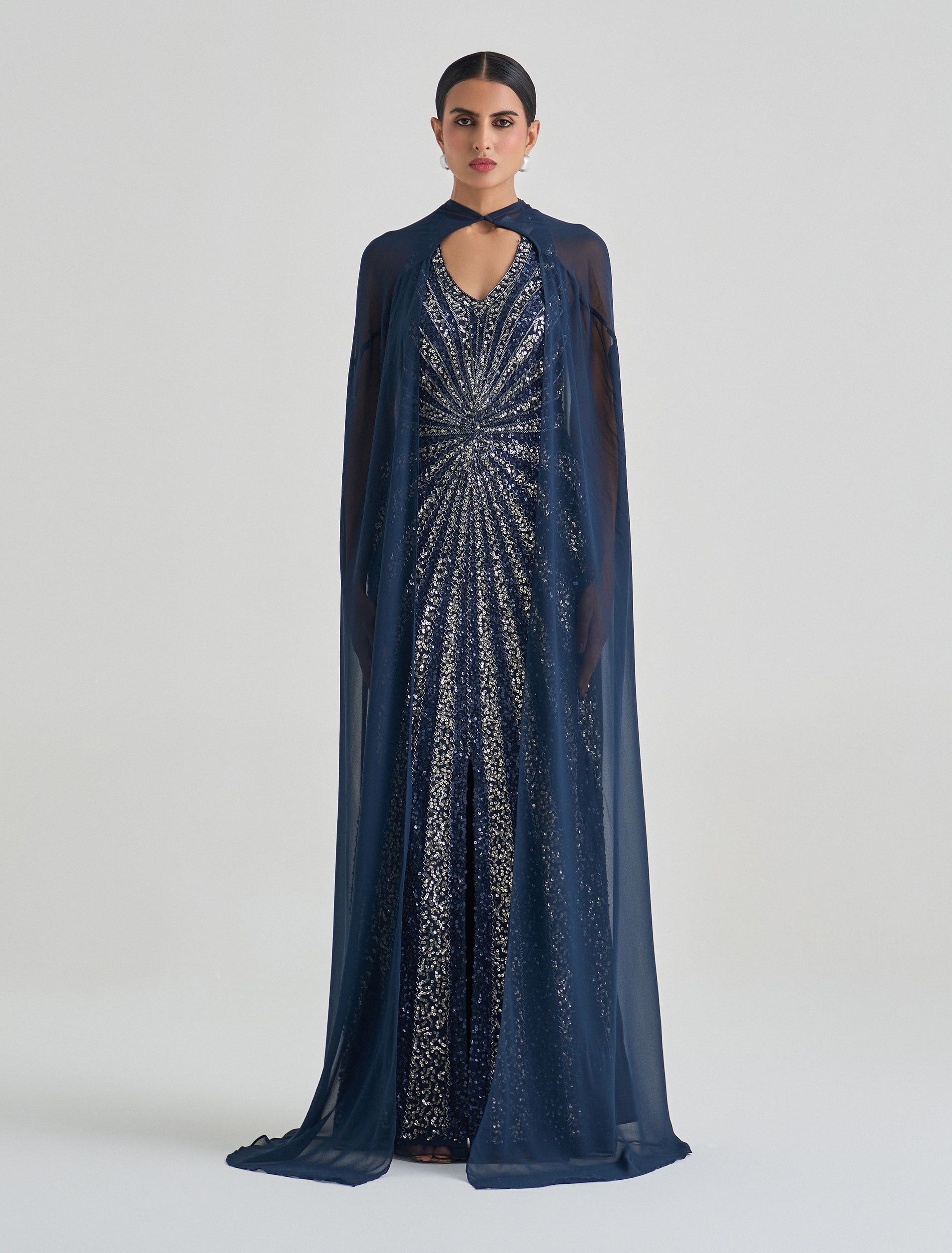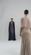 تميزي مع فستان كحلي بلونه العميق والتطريز اليدوي اللامع الذي يتناثر على طول الفستان بستايل شعاعي أنيق. تصميم فستان كحلي طويل مع كاب سواريه تٌل طويل سادة قابل للفصل، ما يمنحك خيارين من الإطلالة. يأتي الفستان برقبة على شكل V عميقة مطرزة مع حلقة مستديرة ناعمة. يناسب شراء فستان سهرة بلون كحلي جميع المناسبات الراقية والسهرات. مزيج مثالي بين الفخامة والبساطة، ويضمن لكِ حضوراً ساحراً أينما كنتِ.
