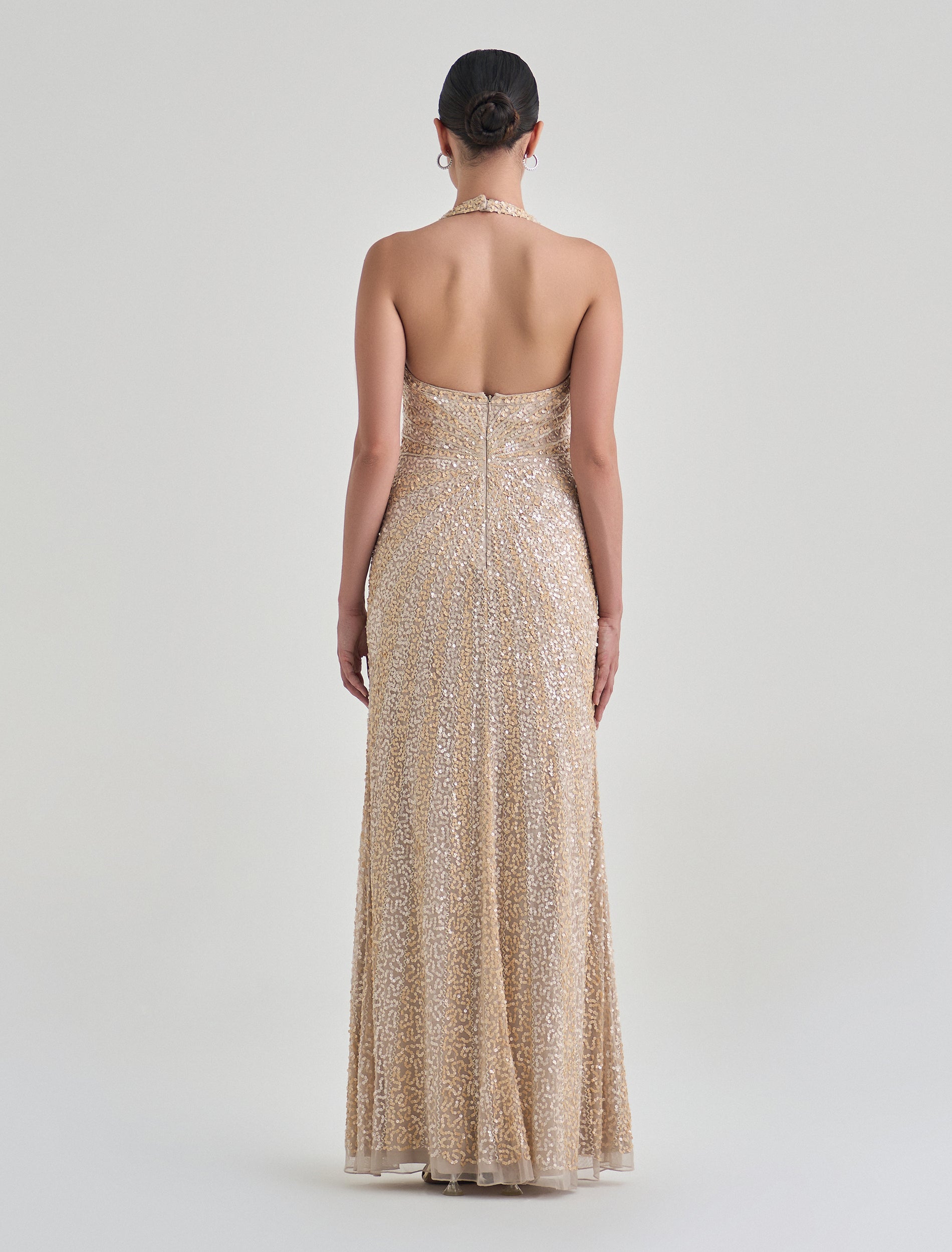 قصة الفستان من الخلف: مفتوحة بشكل أنيق مع الرداء المنسدل.