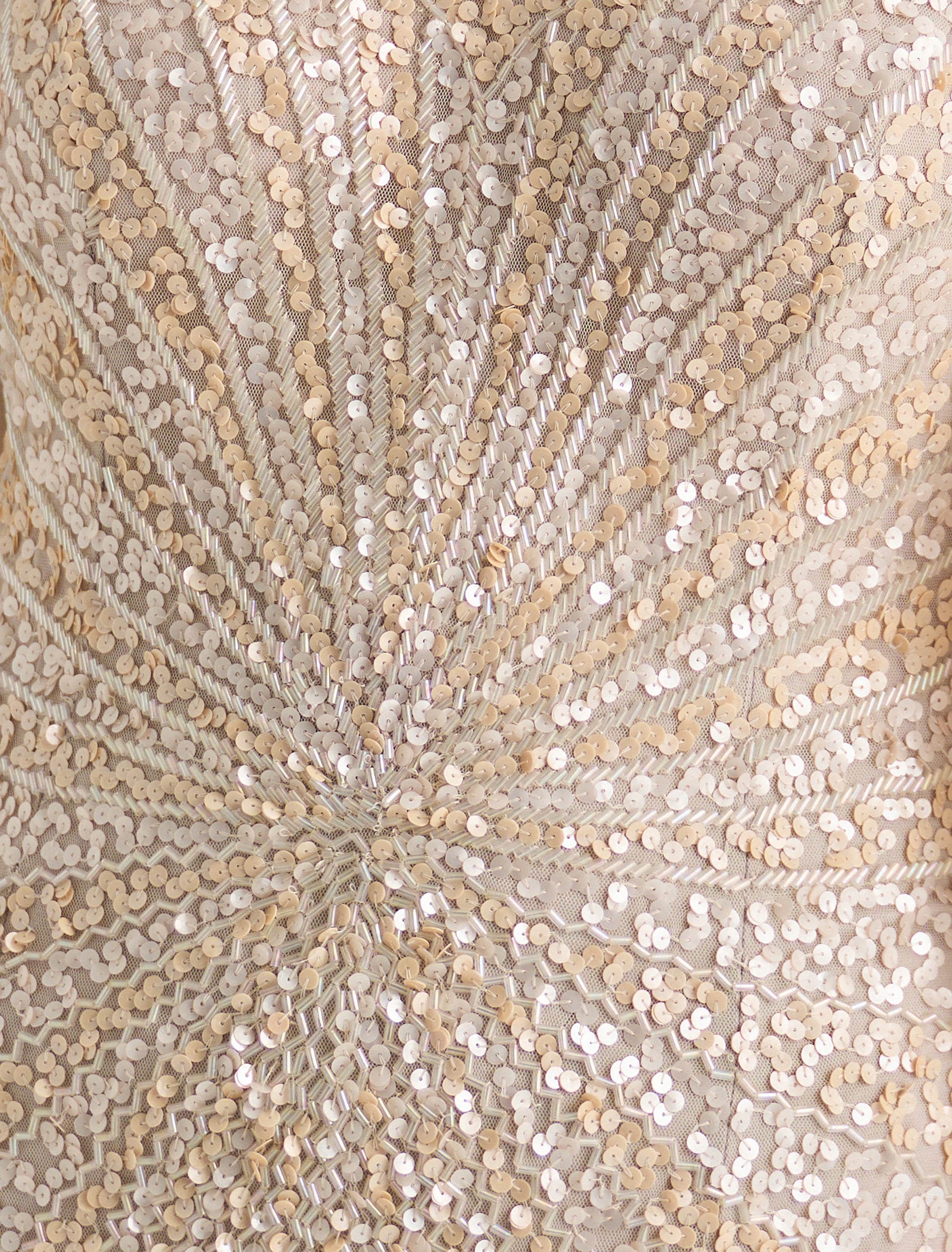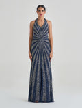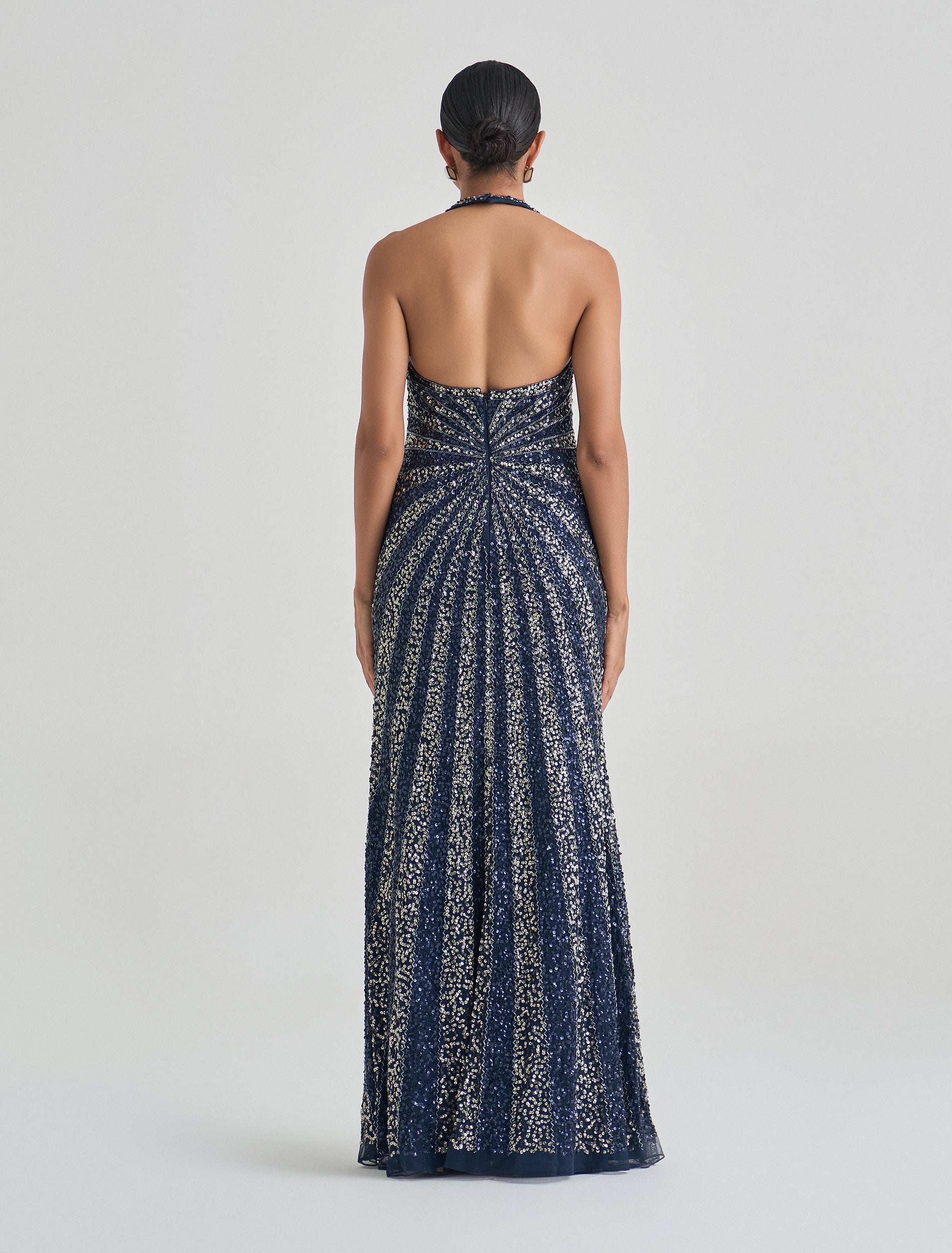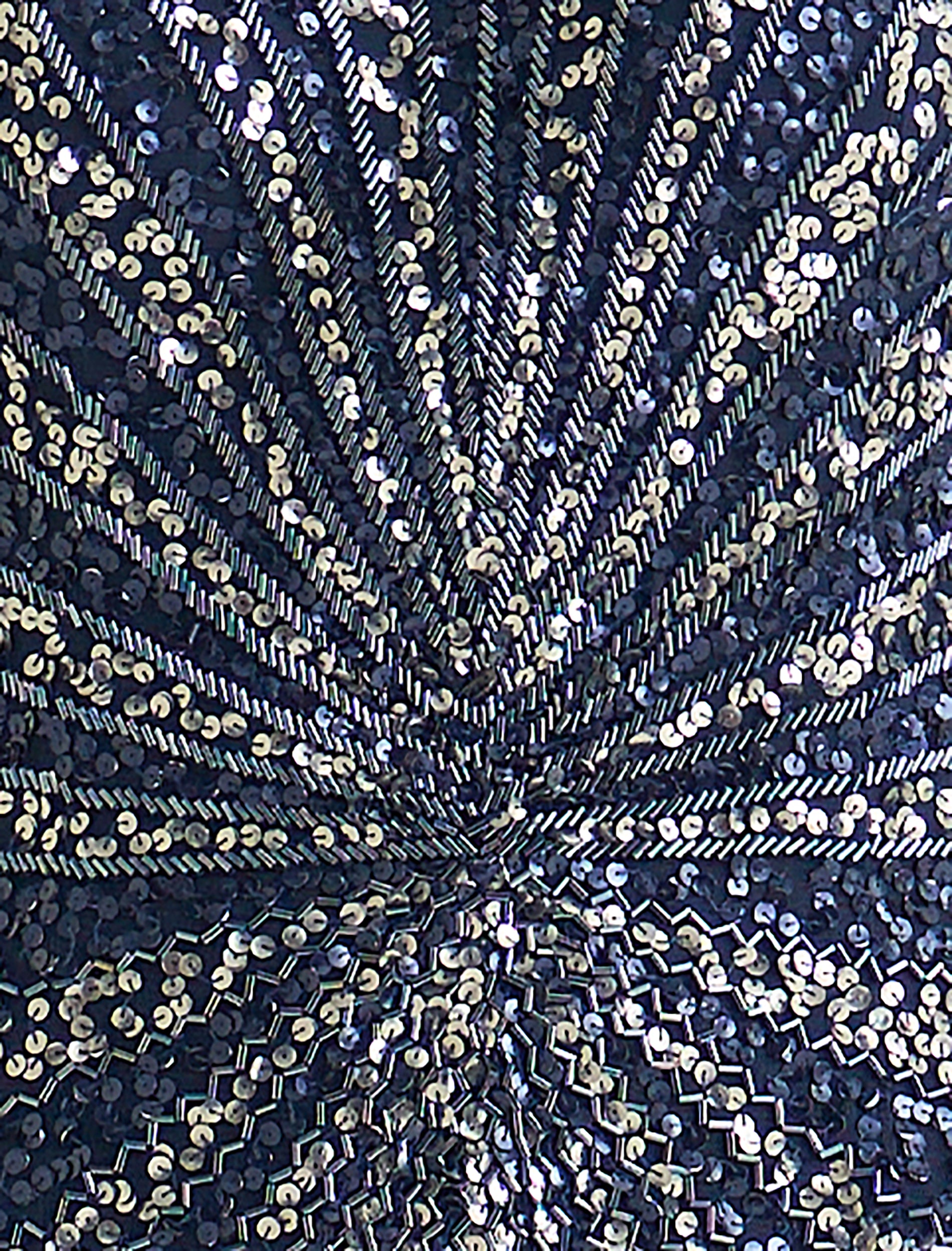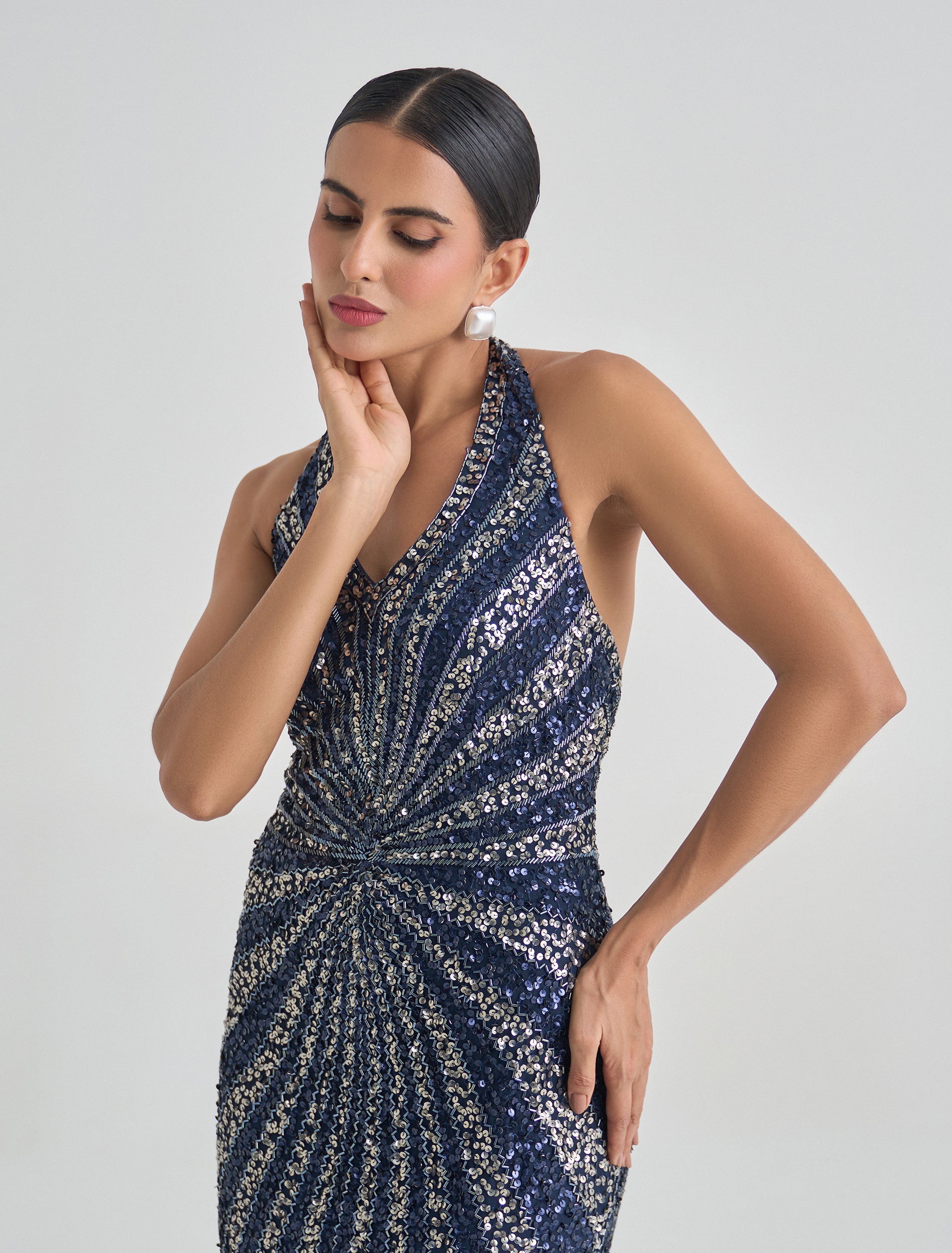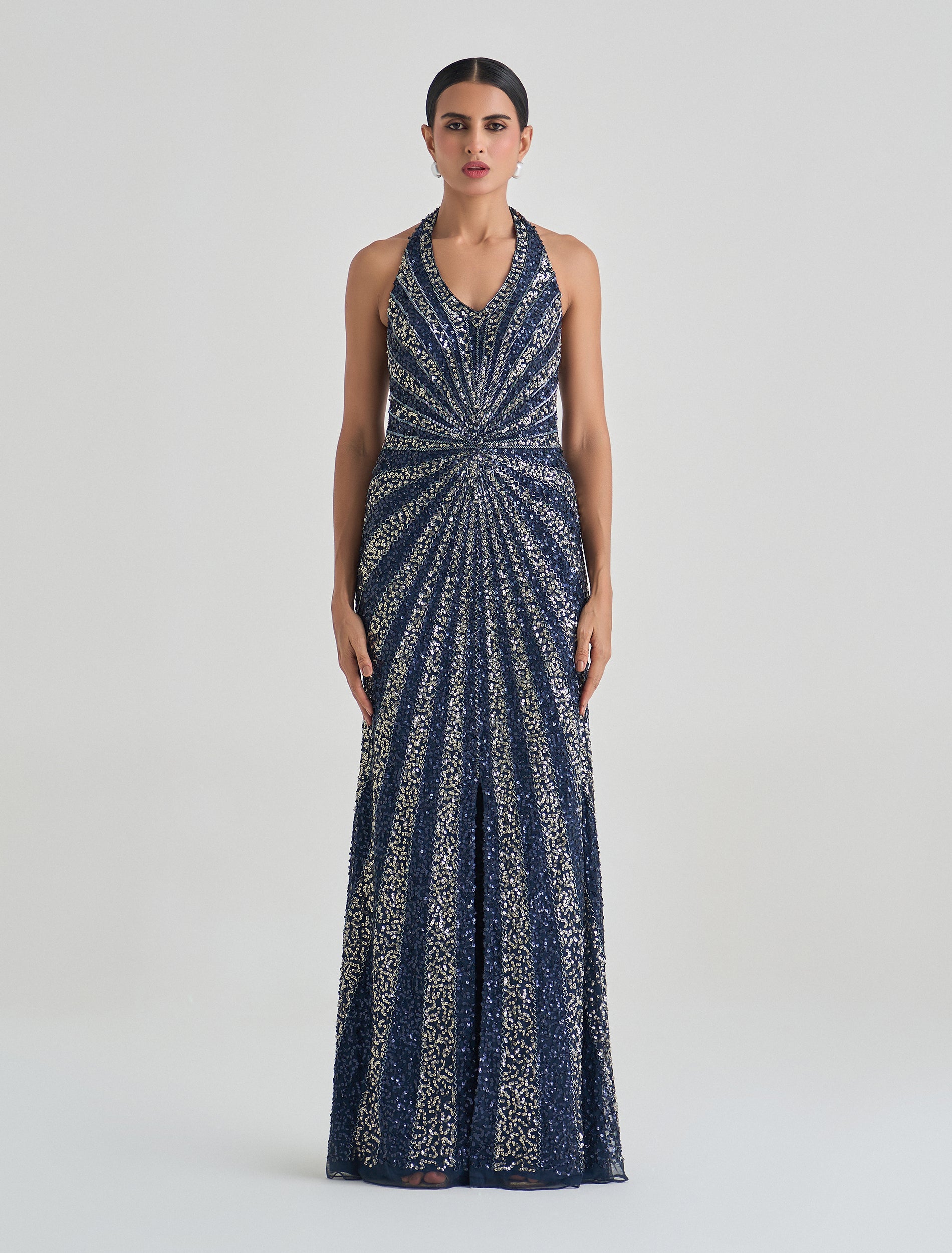 نوع التطريز: استخدم في فستان كحلي تطريز يدوي أزرق وفضي بخيوط طولية بتوزيع شعاعي.