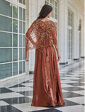فستان بني مخمل طويل مع كاب قصير بتصميم عصري وأنيق، يتميز بتفاصيل دقيقة في التطريز وإضفاء لمسة من الفخامة. ستايل سهرات بتصميم فستان ماكسي طويل بطول 60 إنش ويبرز في تصميمه الخطوط الأنثوية برقي ما يجعله مناسبًا لأي اطلالة مسائية أو إطلالة صباحية راقية.