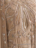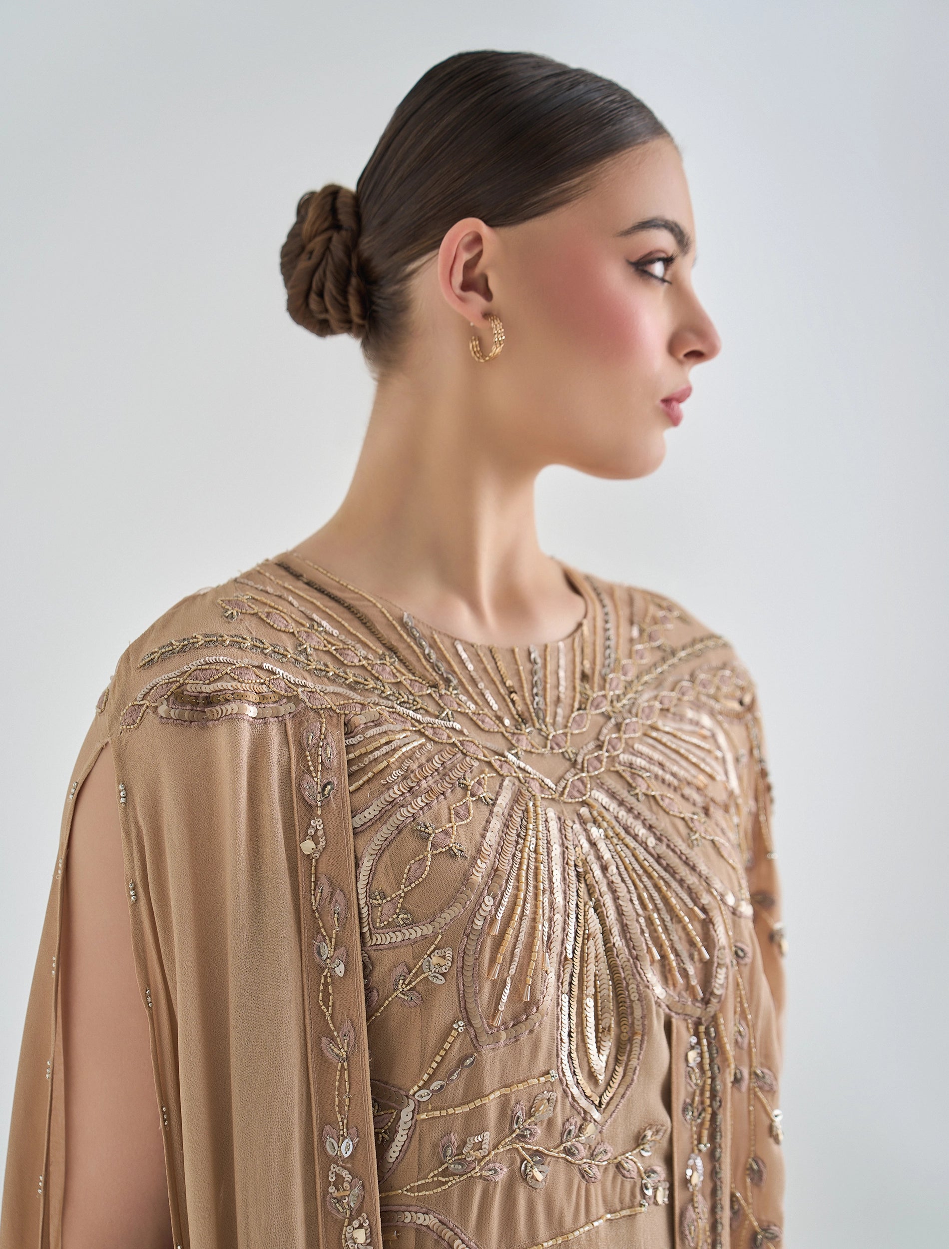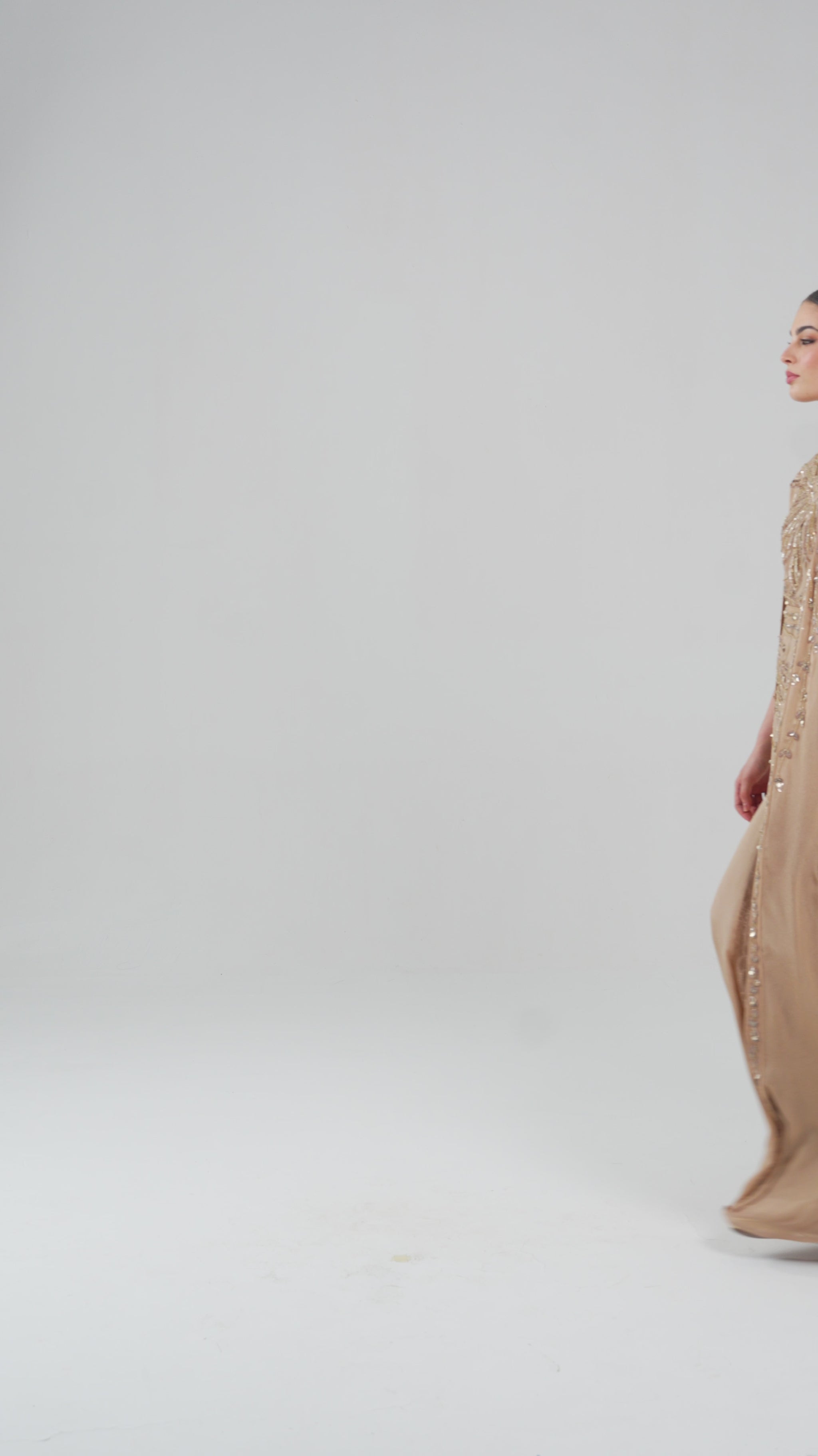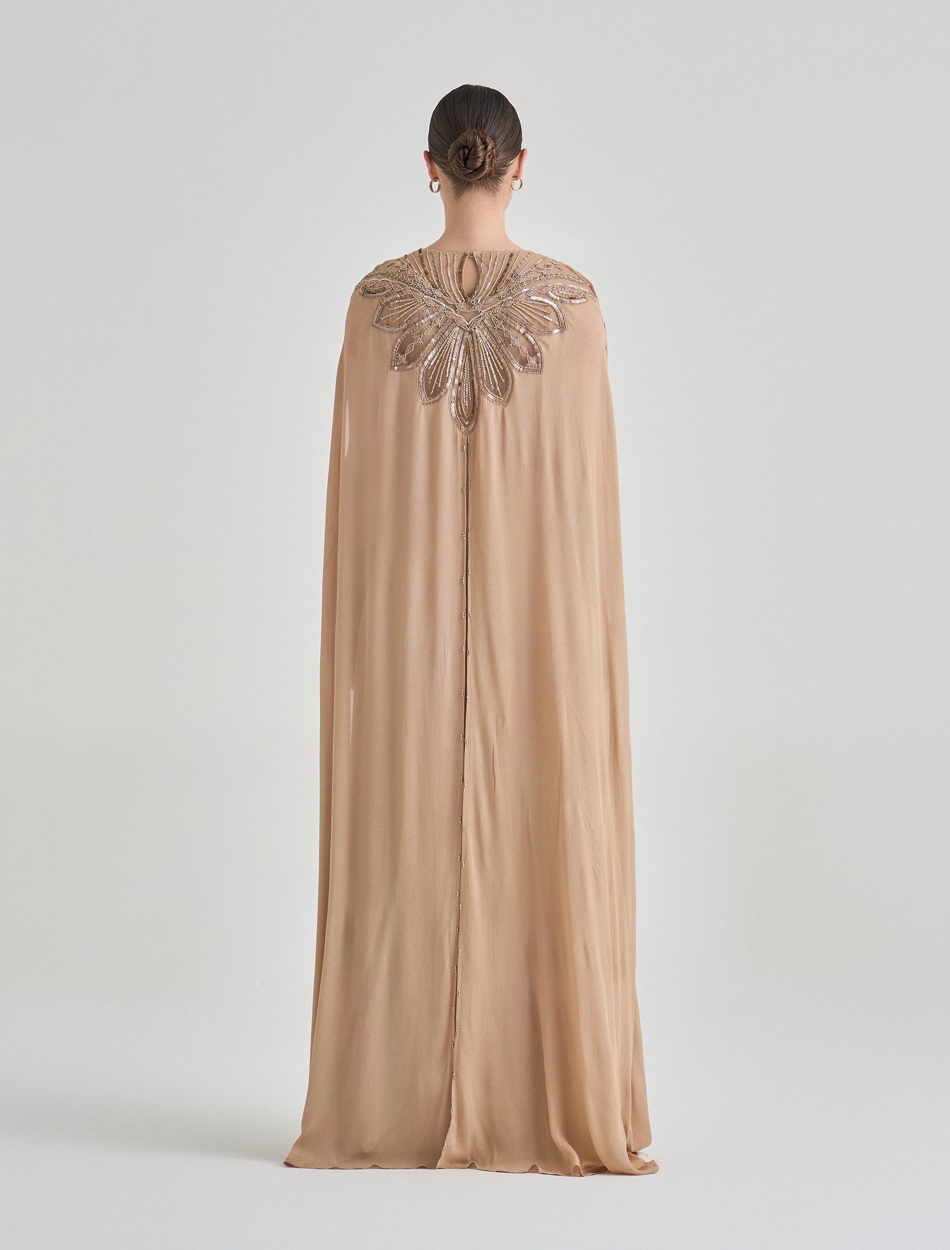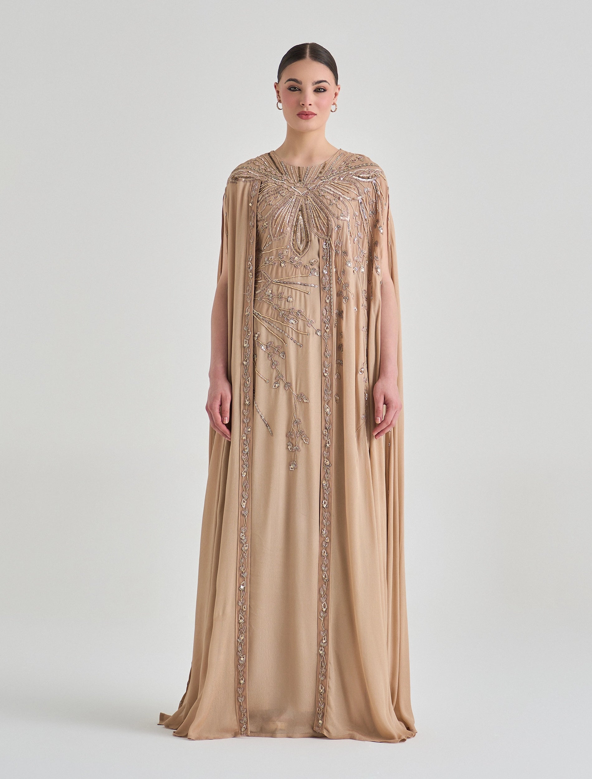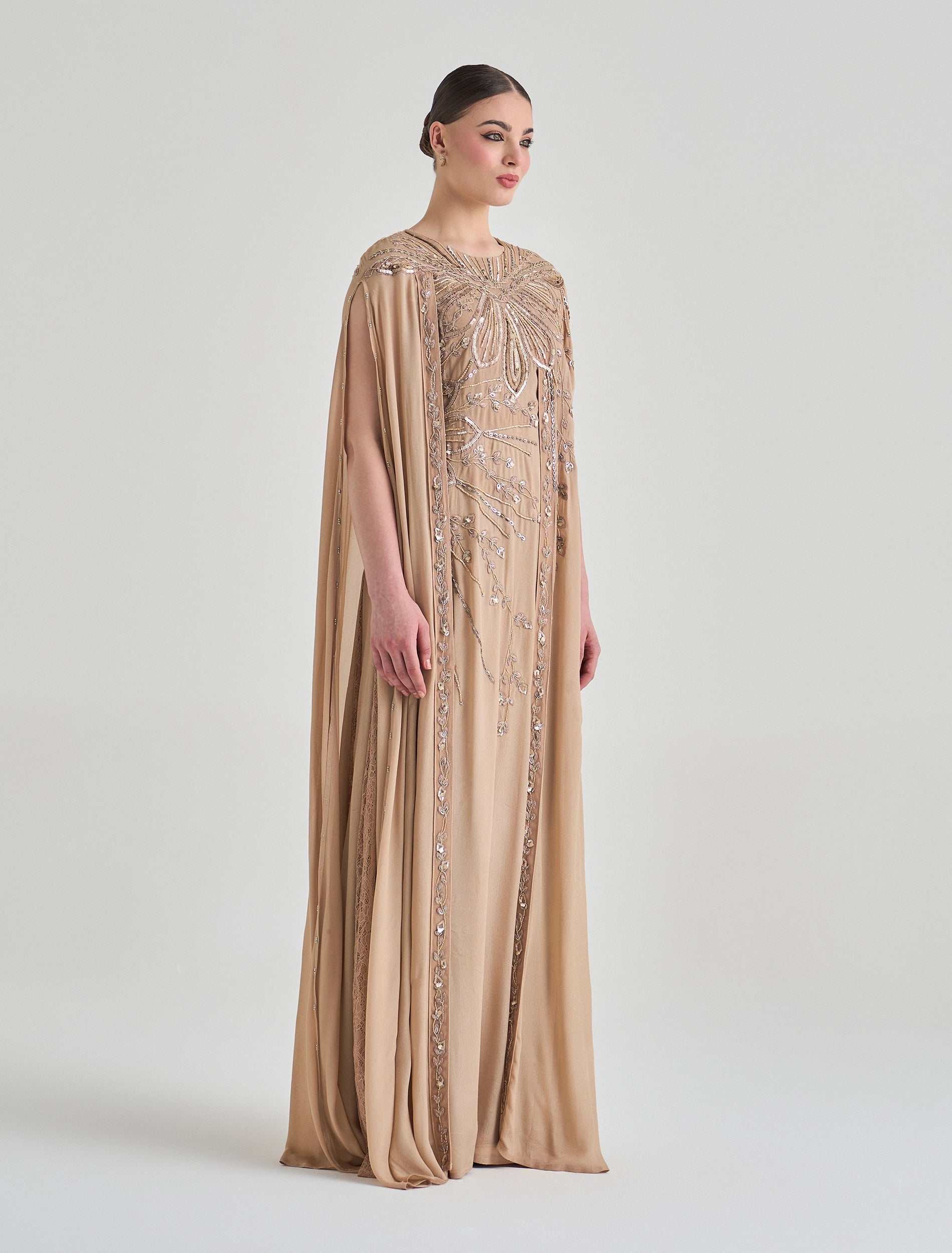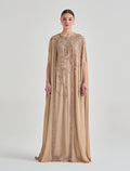 فستان سهرة ذهبي مطرز بقصة كاب انسيابية