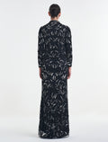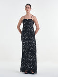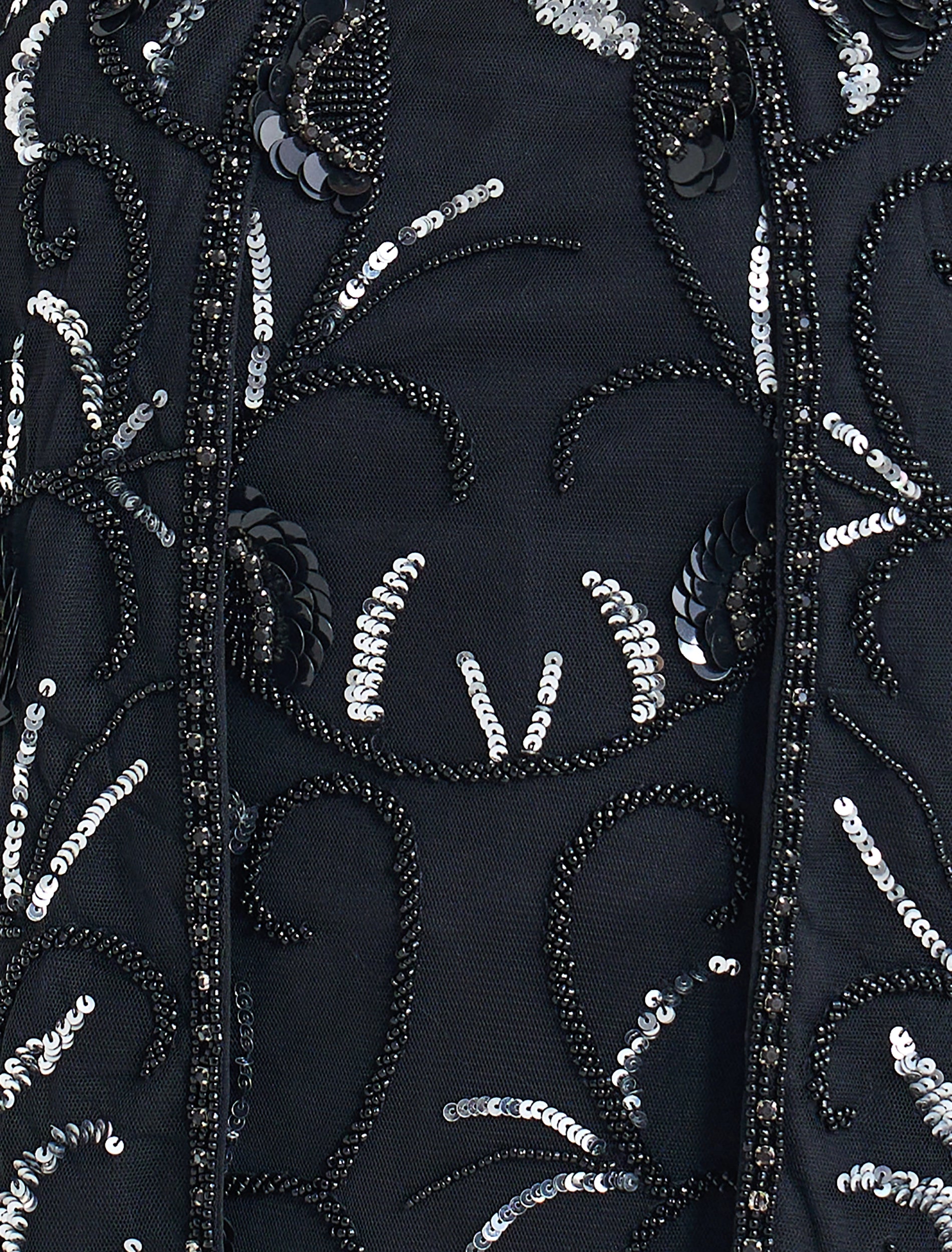 - التطريز: فستان مطرز بالخرز باللون الفضي والأسود الناعم.