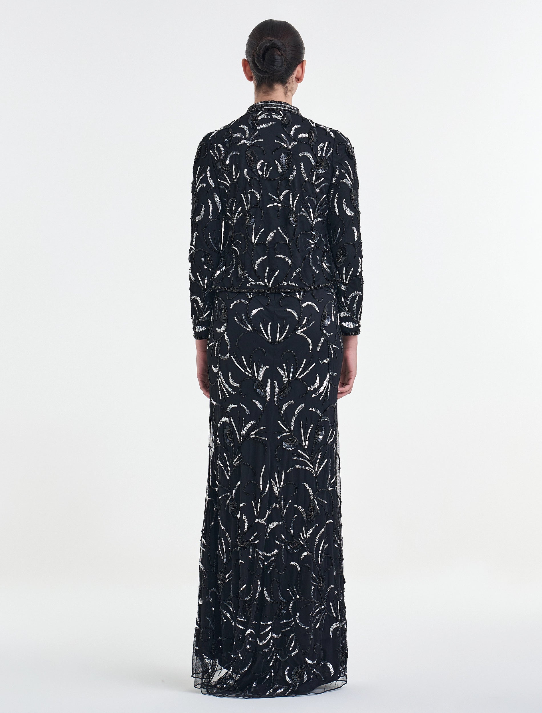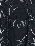 فستان مع جاكيت قصير سهرة فاخر يمكن ارتداؤه أو الاستغناء عنه مطرز بالخرز الأسود والفضي مما يجعله مثاليًا للمناسبات الفاخرة مثل الحفلات أو المناسبات الرسمية. فستان اسود ضيق يمتاز بقصة مستقيمة وطويلة بطول 60 إنش.