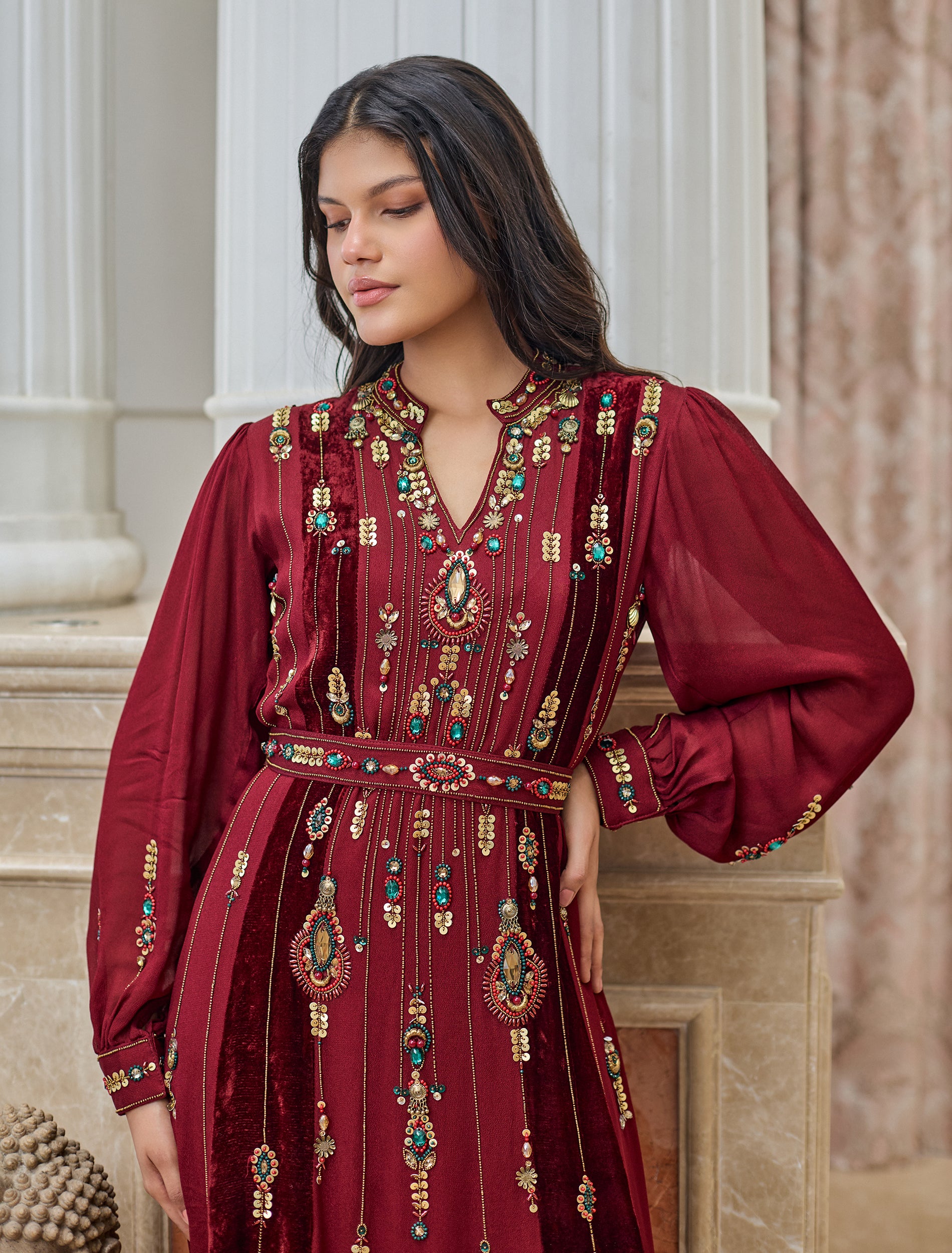تأنقي بفستان سهره بأكمام طويلة بلونه العنابي الراقي من شالكي، من أرقى وأحدث فساتين شتاء 2025، اختاريه الآن لتتألقي في مناسباتك.