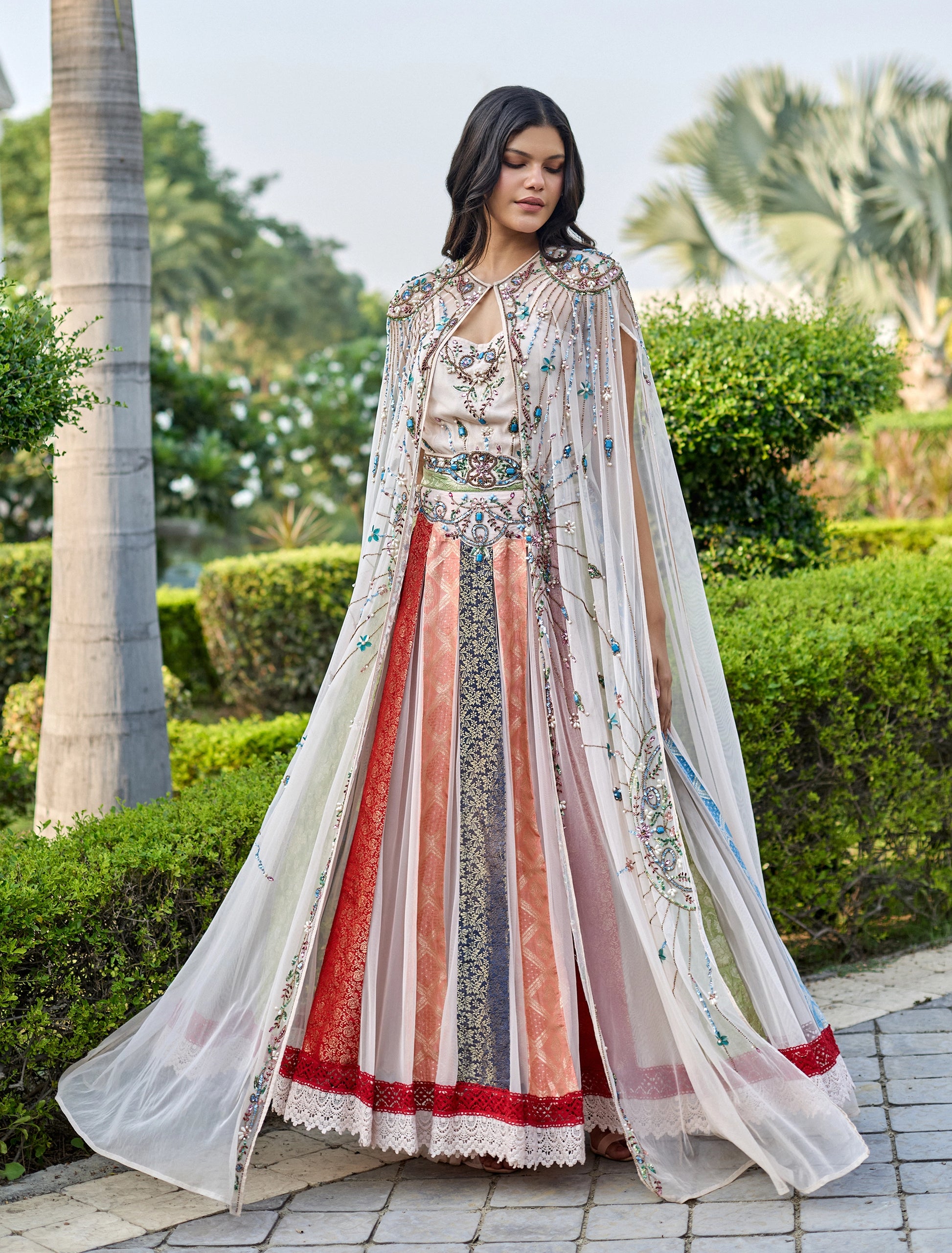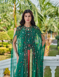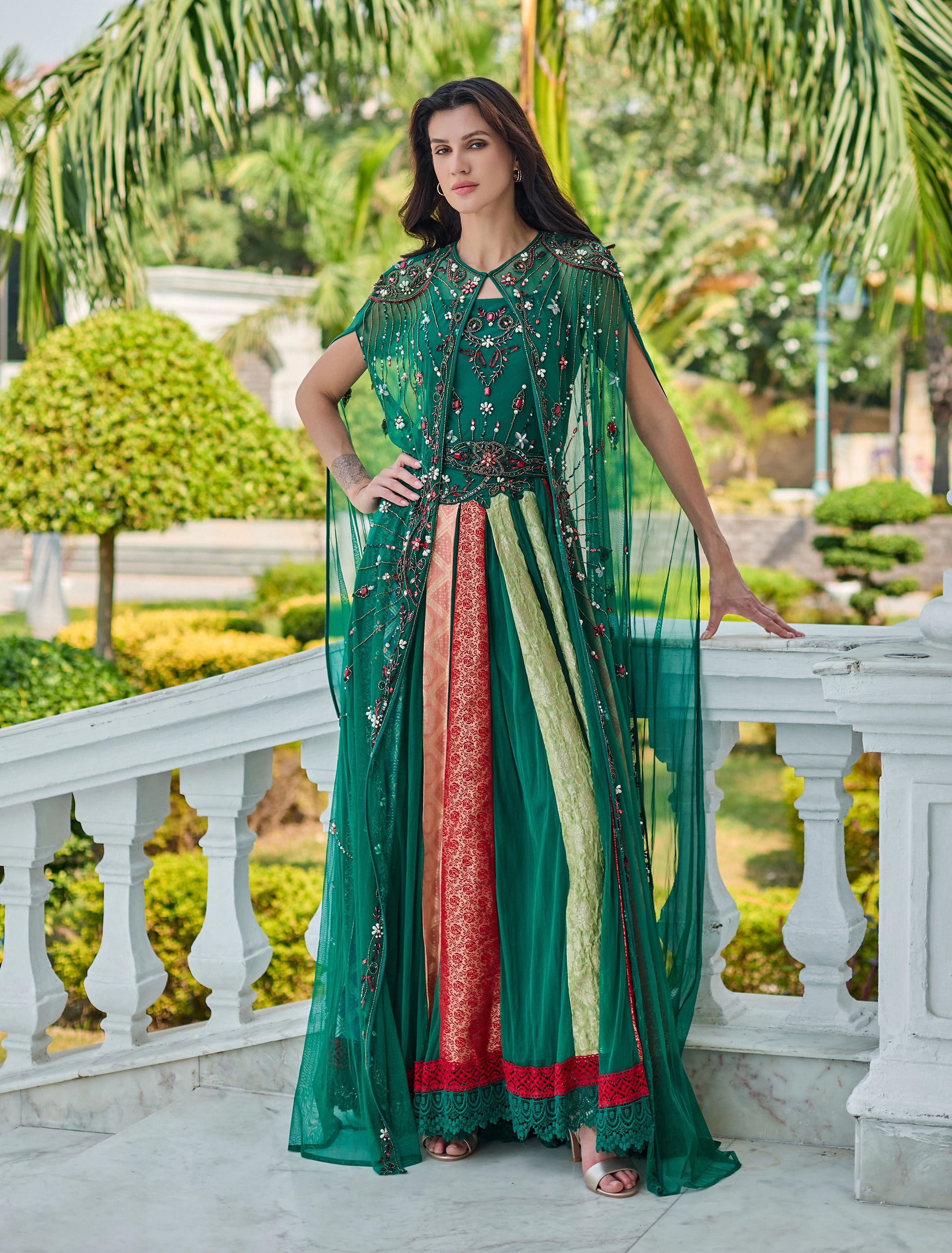 - القصة: قصة ستايل سهرات من 3 قطع، تنورة طويلة ملونة متعددة الطبقات مع تطريزات ذهبية فاخرة.