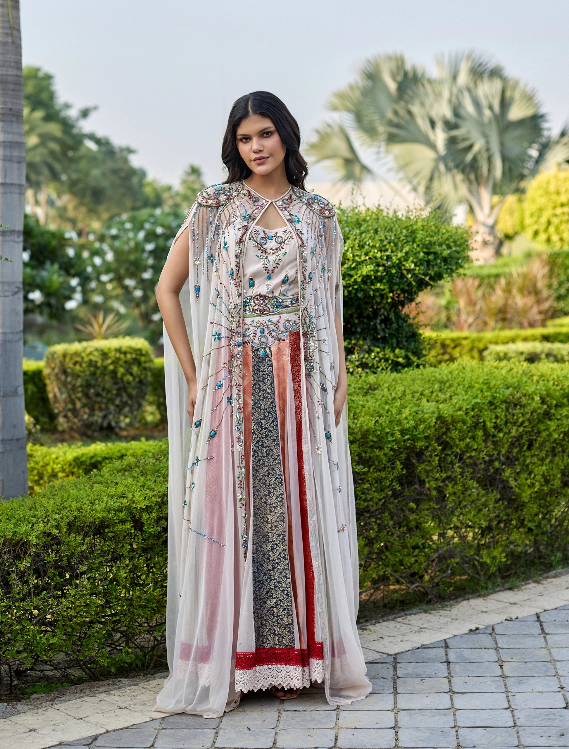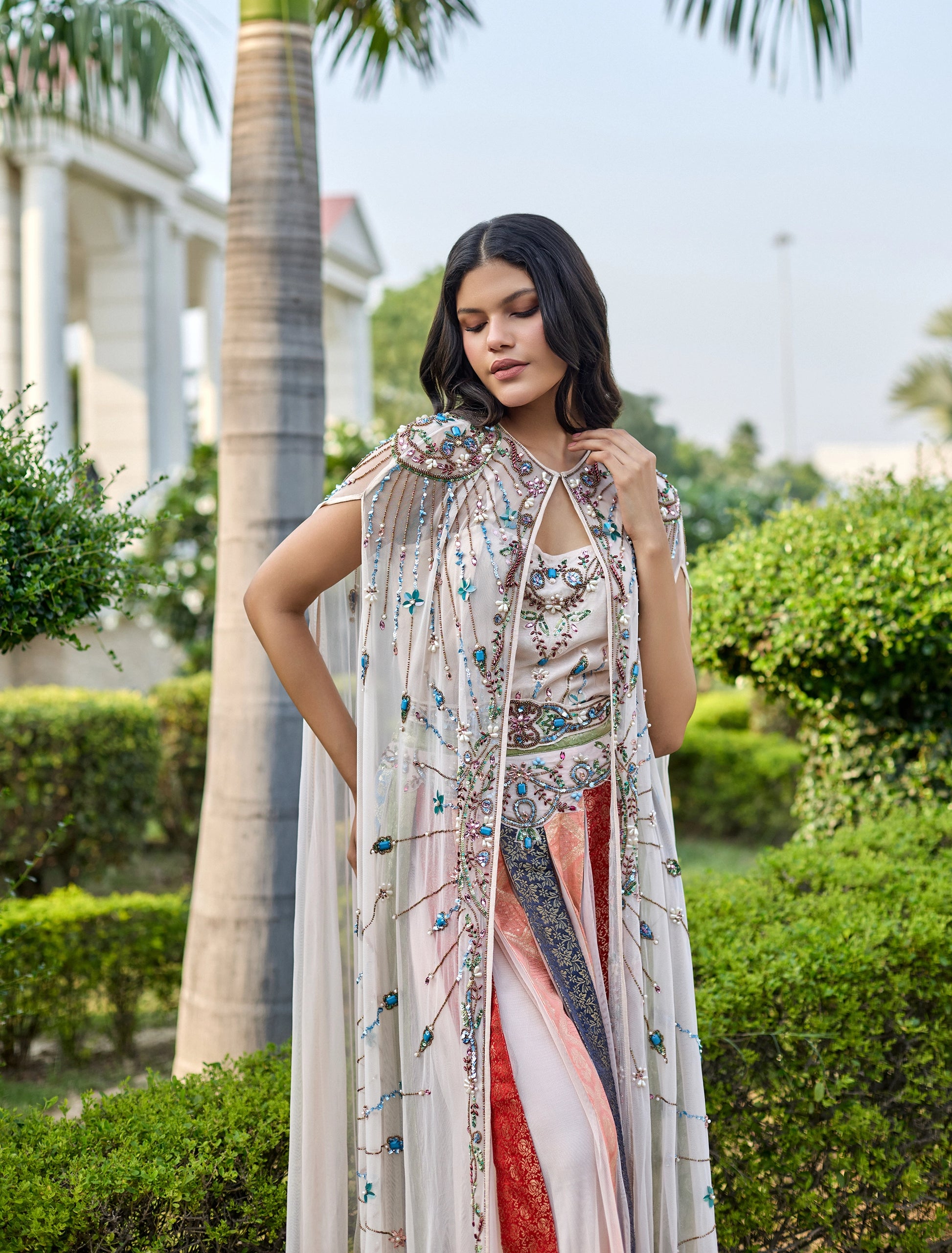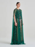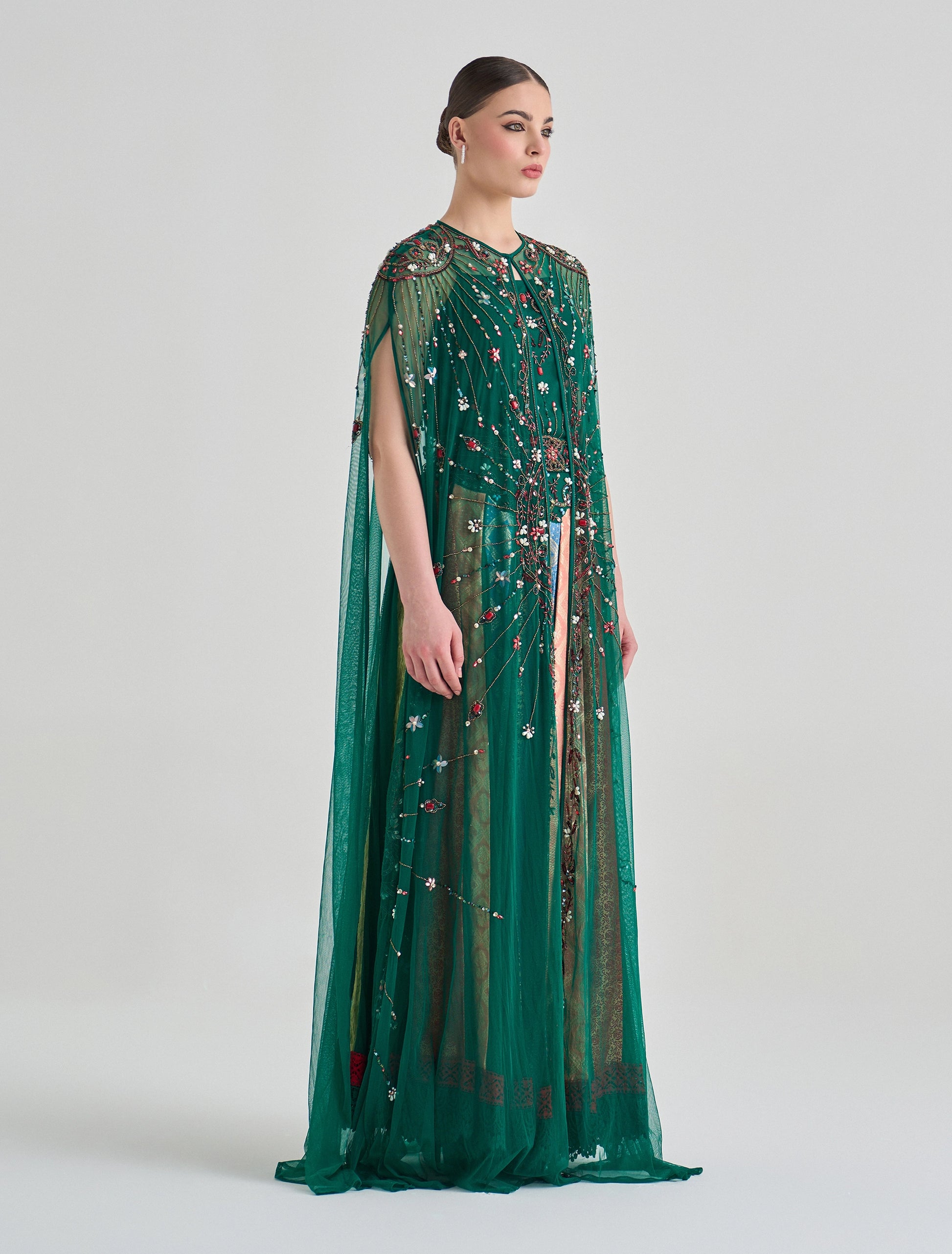 - نوع التطريز: تطريز يدوي فني متقن مع خرز وكريستالات بألوان أزرق، أخضر، ذهبي، وأبيض مع لمسات نباتية لامعة.