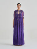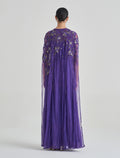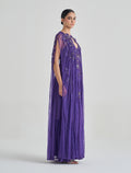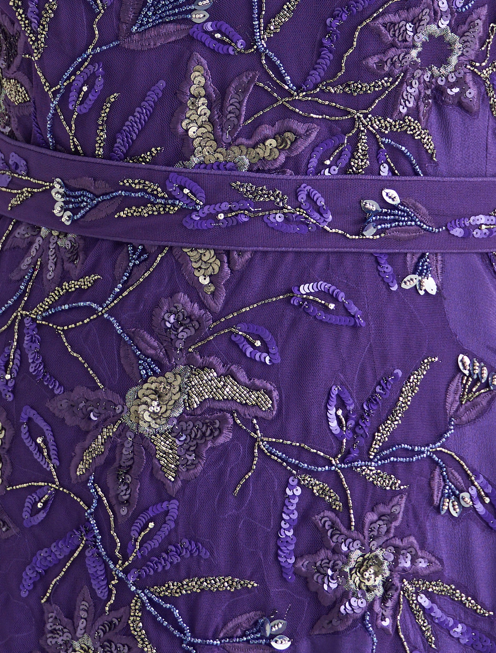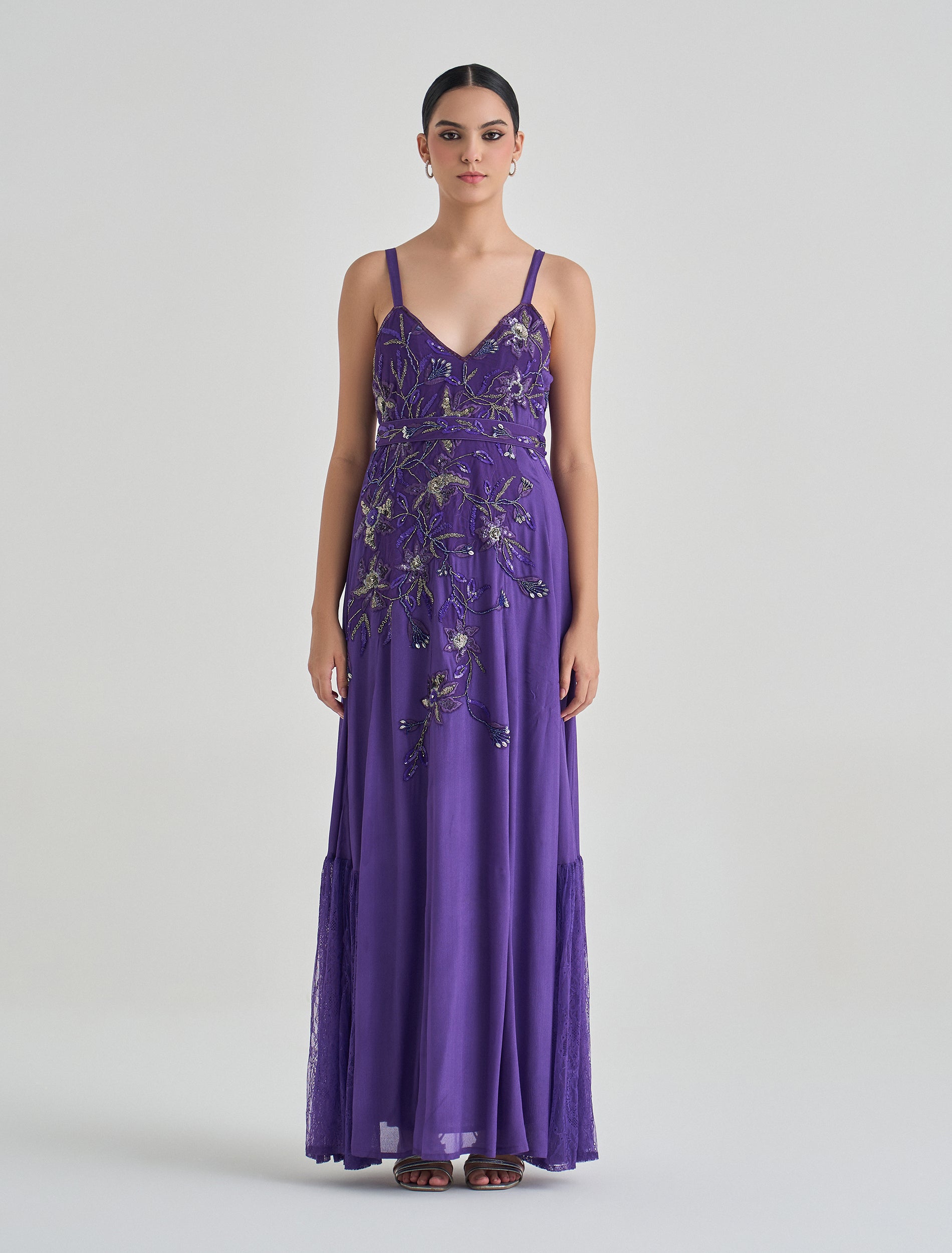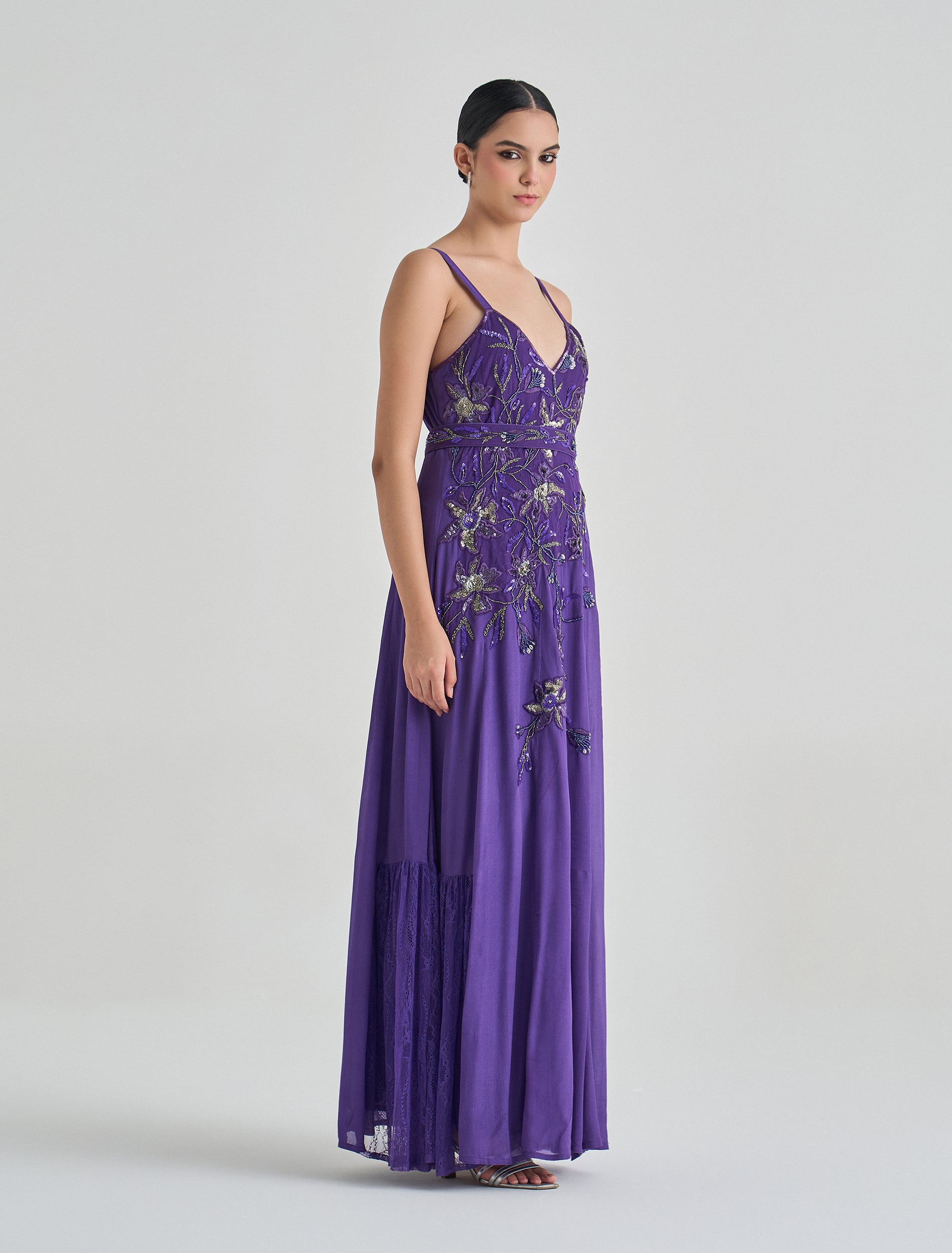 فستان طويل بلون بنفسجي مطرّز بنقوش زهرية