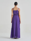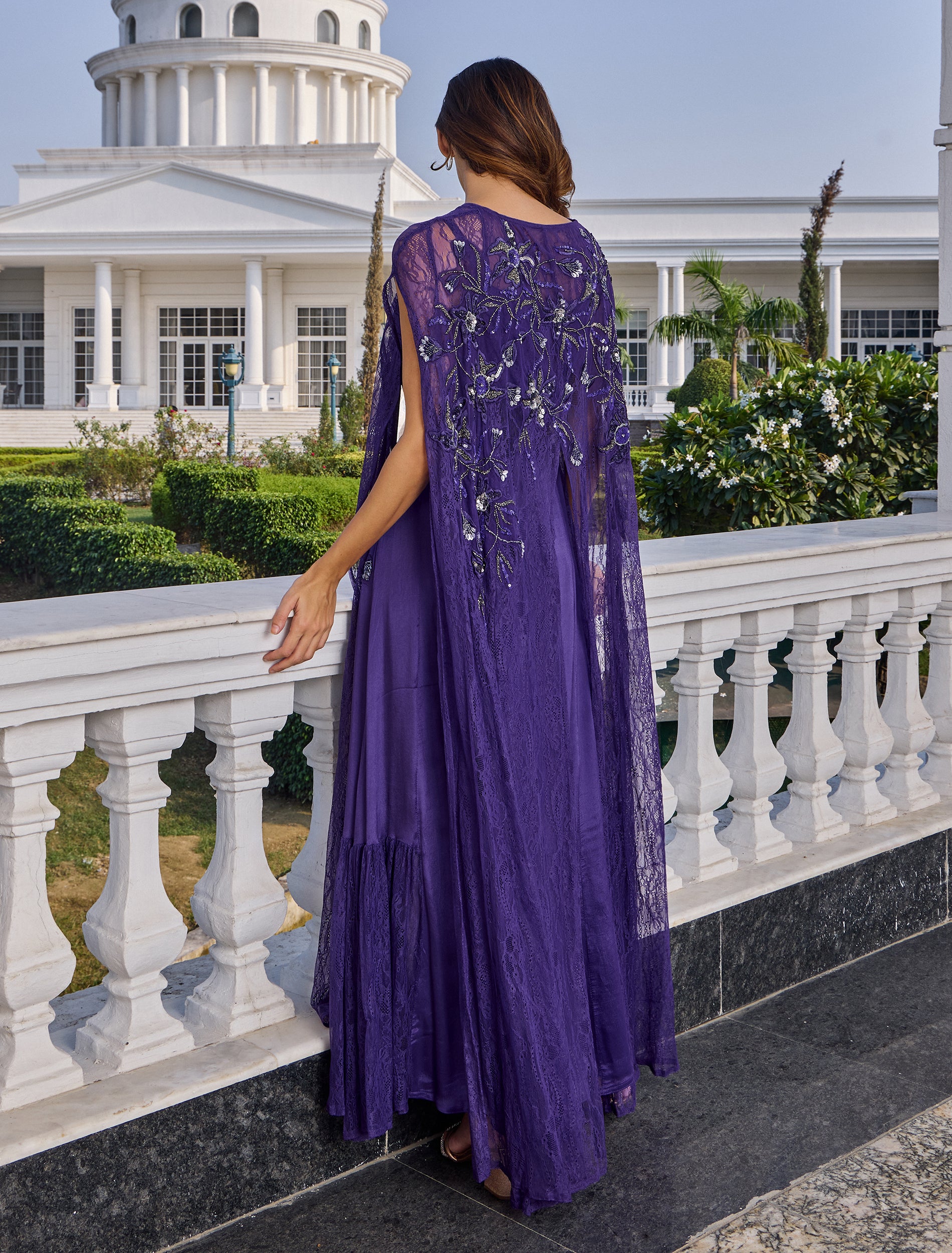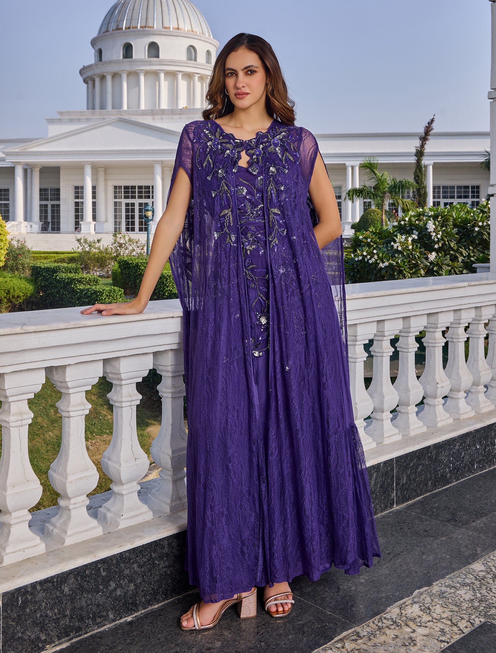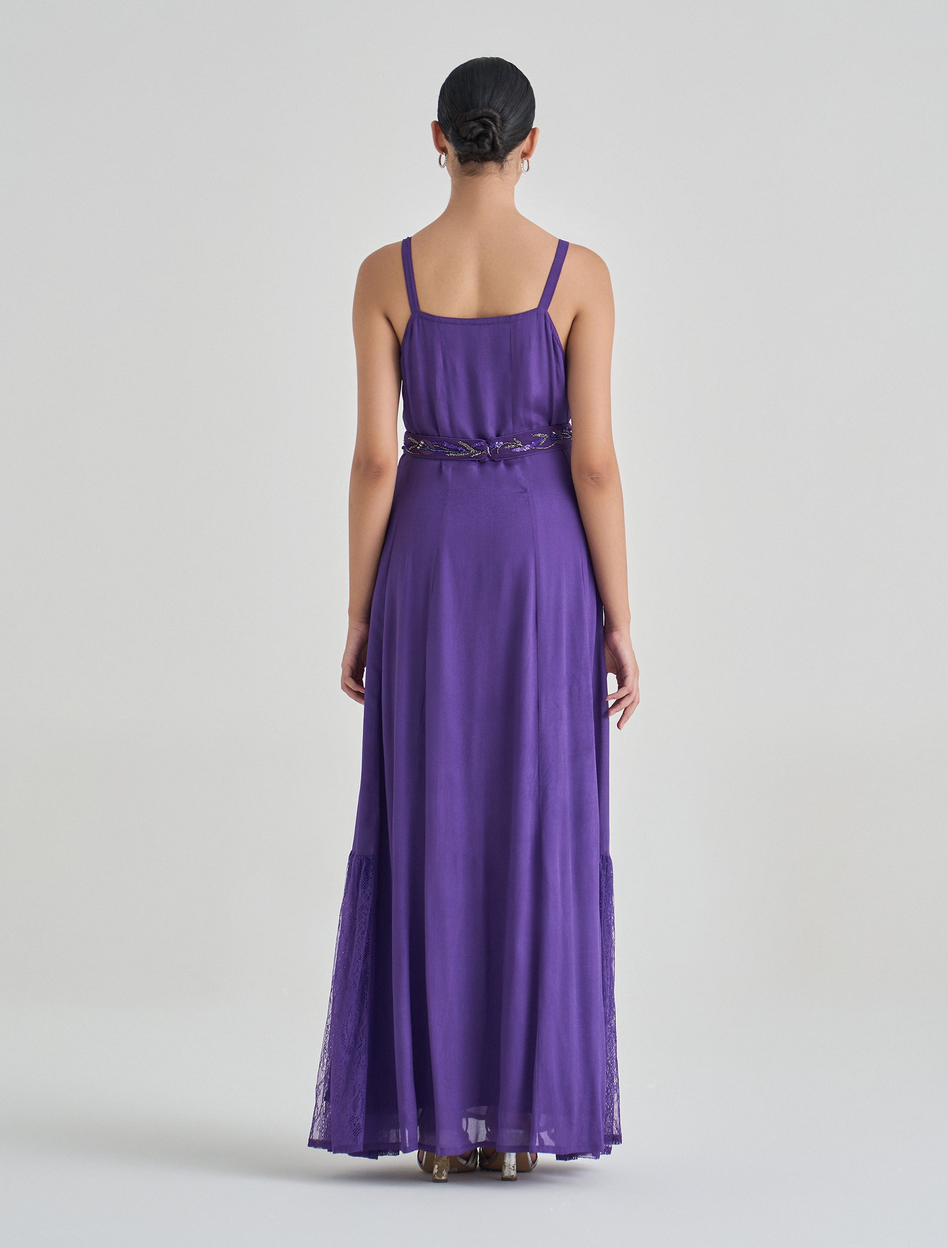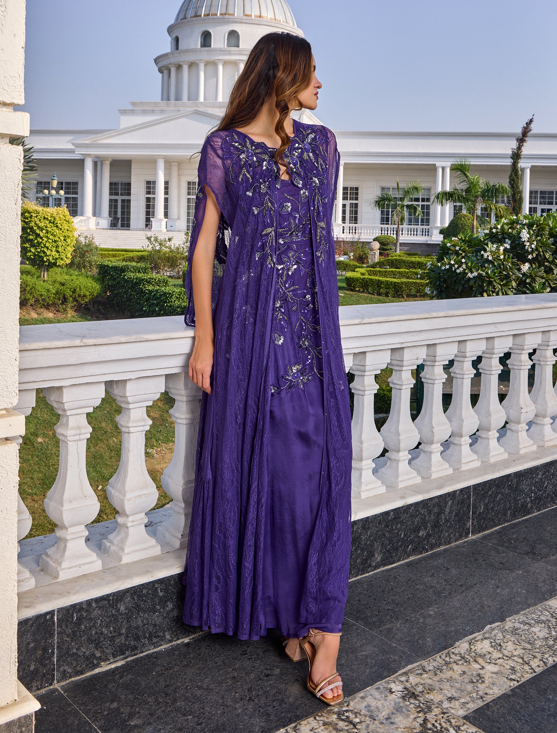 فستان طويل بلون بنفسجي مطرّز بنقوش زهرية