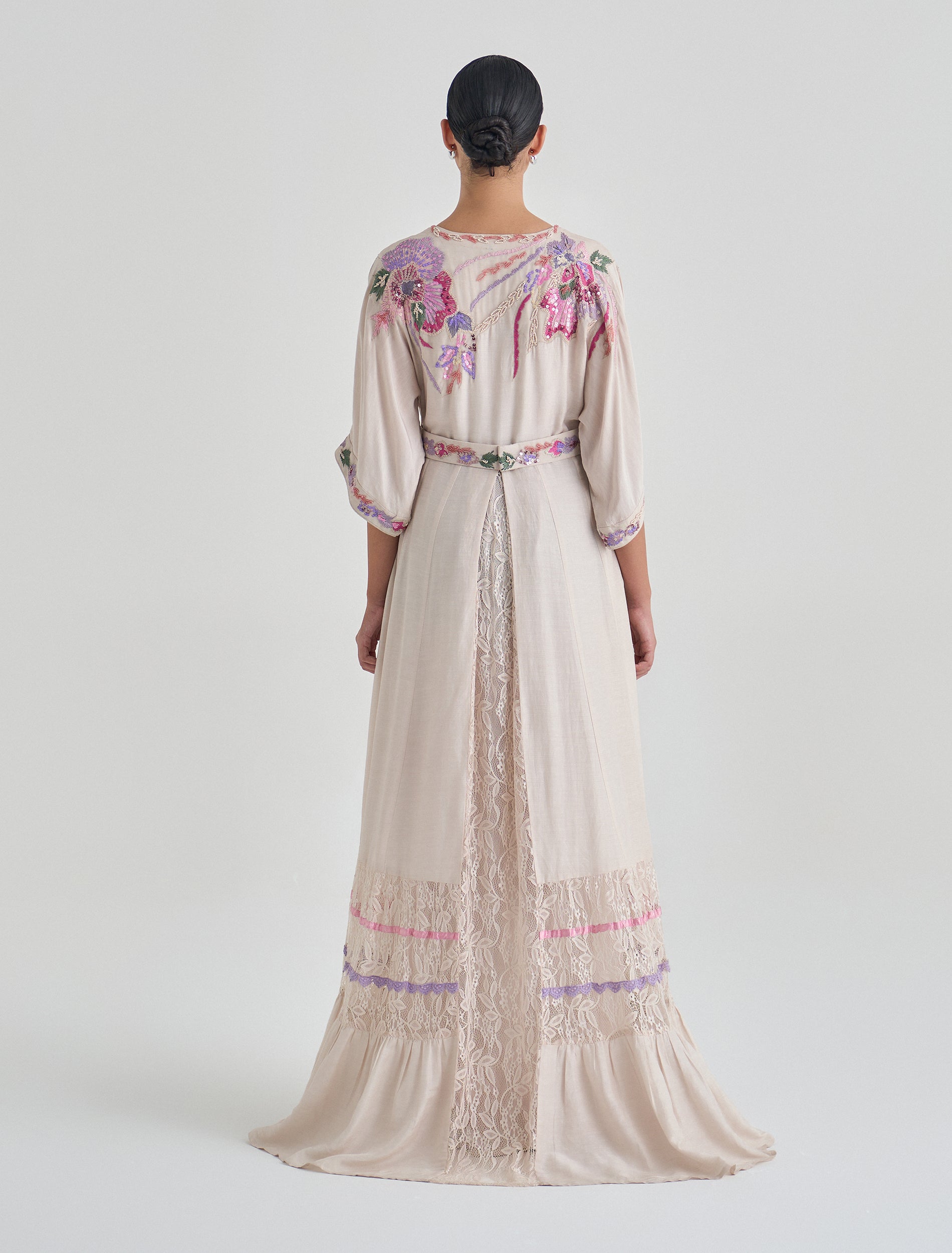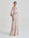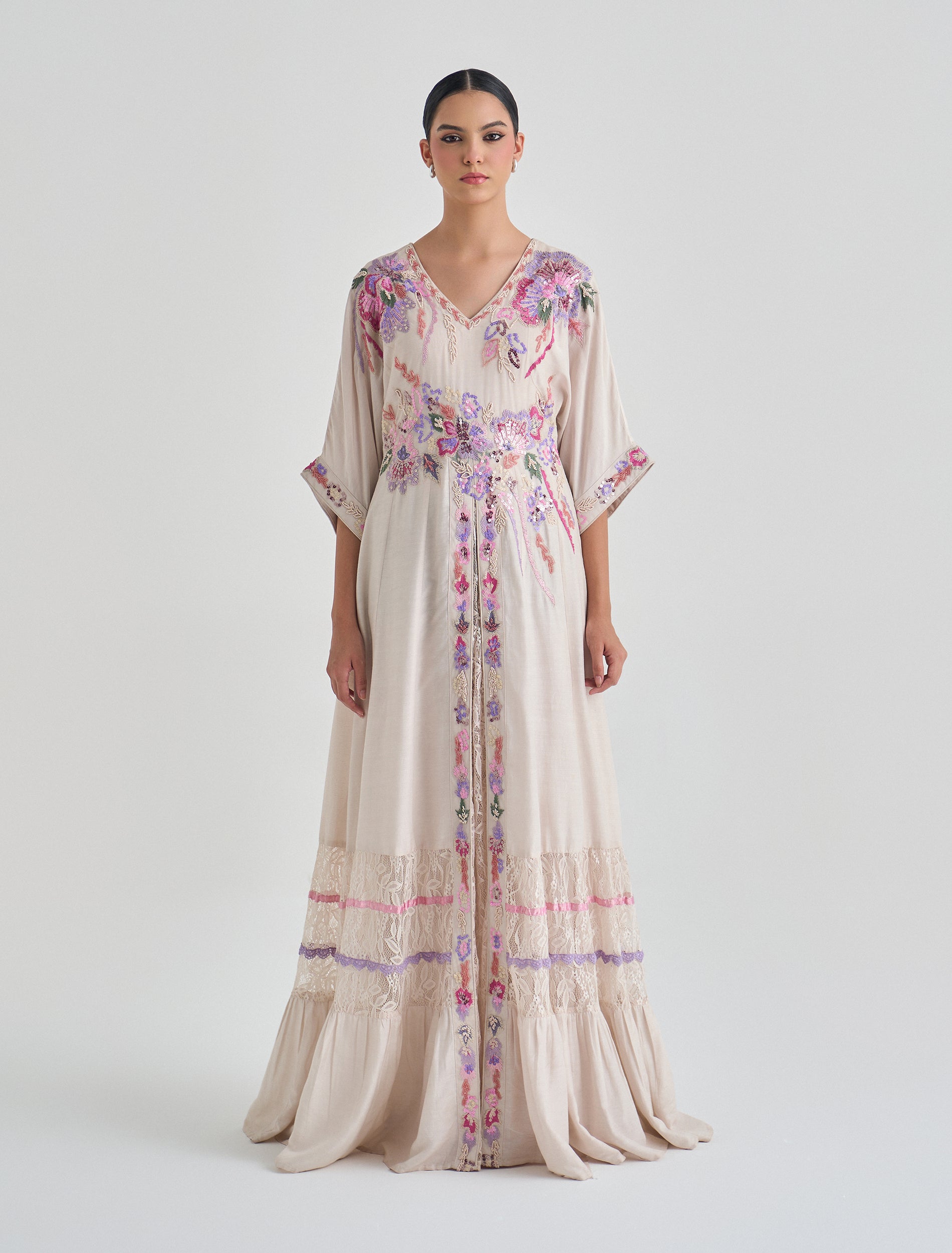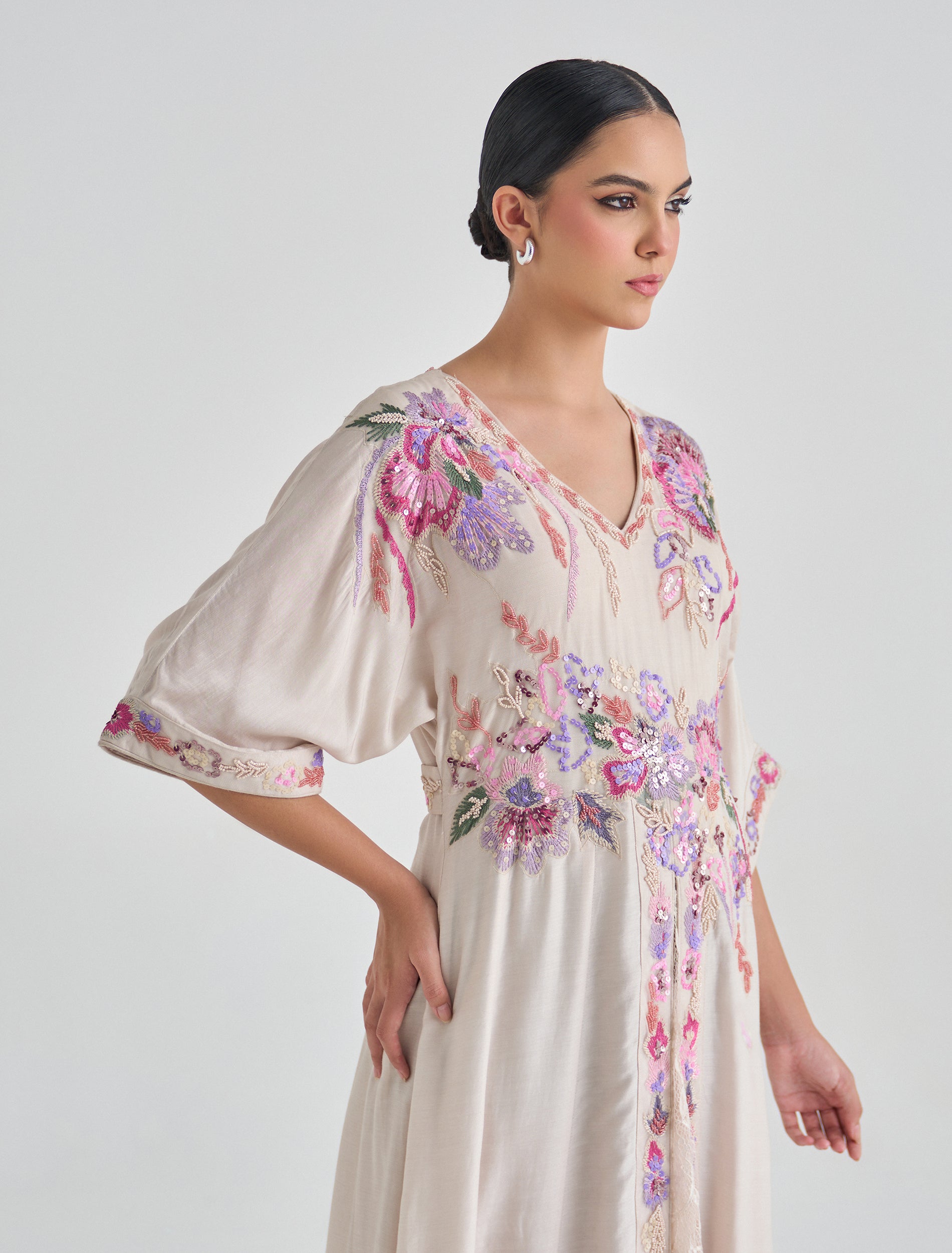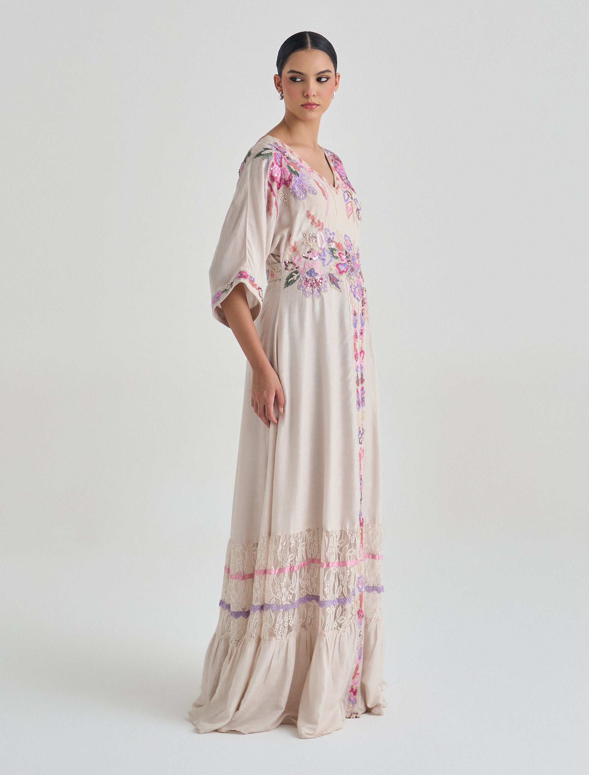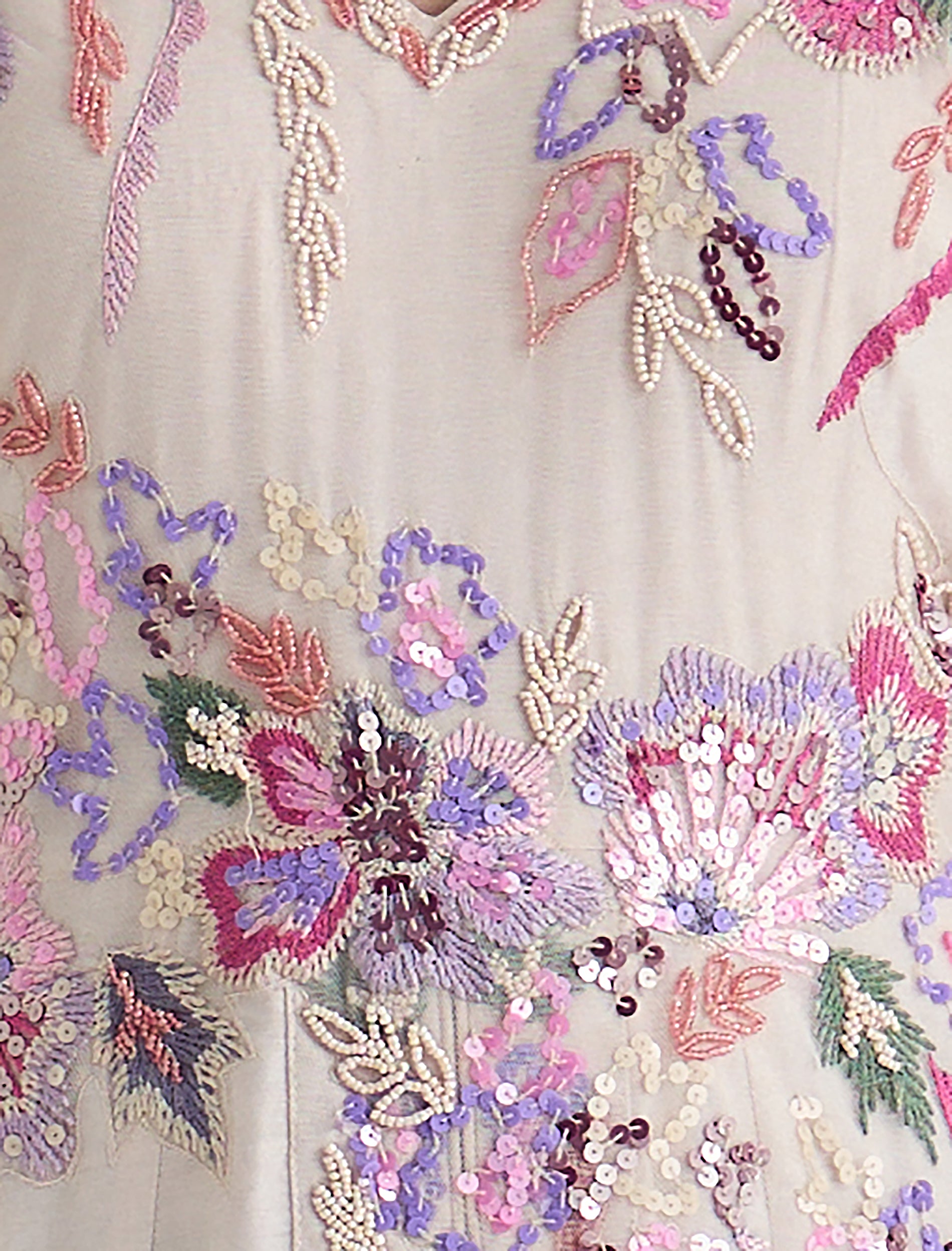 فستان سهرة بيج مطرّز بنقوش زهرية