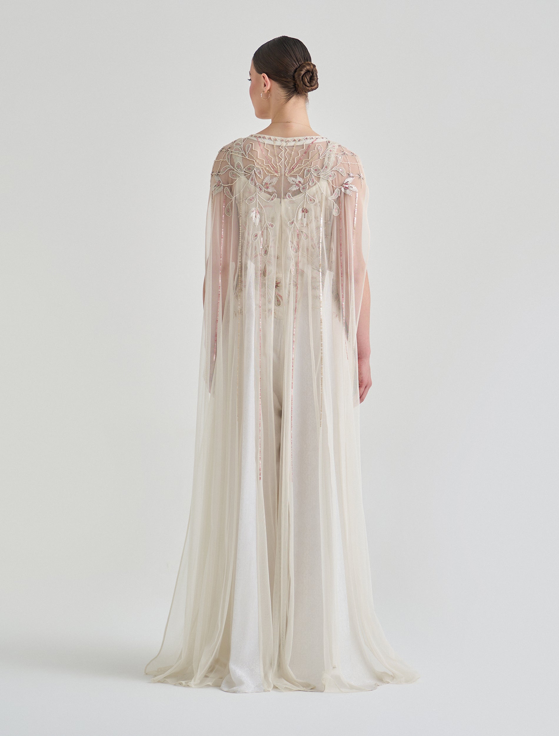 جمبسوت نسائي ابيض طويل للسهرة مع كاب أنيق من التول لمزيدًا من الفخامة. يتميز الجمبسوت بستايل ملكي برقبة مستديرة مع الكاب الذي يمكن ارتداؤه أو إزالته والمطرز بتطريز يدوي ملون مما يمنحه شكلًا انسيابيًا وأنيقًا. خيار مثالي لمن تحتاج جمبسوت افرول نسائي سهرة لمناسباتك الخاصة وحفلاتك حيث يمنحك إطلالة ساحرة وجذابة.