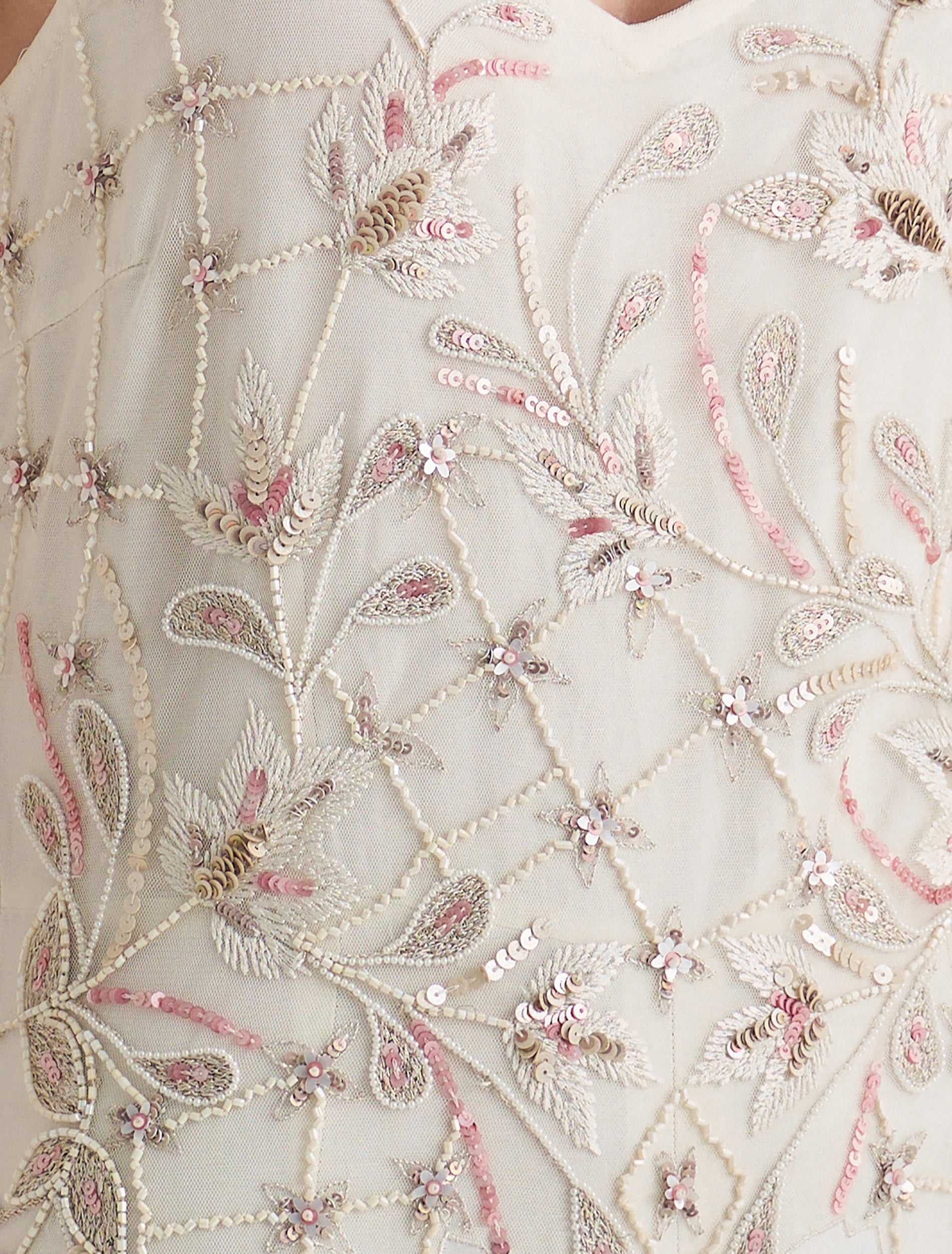 - التطريز: تطريز يدوي بالخرز والترتر باللون الذهبي والبيج والأبيض.