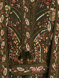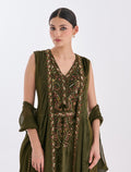 أظهري أناقتكِ بفستان سهرة زيتي طويل من قطعتين من شالكي، والذي يجمع بين الفخامة والأنوثة. تصميم فستان سهرة قطعتين؛ القطعة الأولى هي الفستان الداخلي، والذي يأتي بمزيج من المخمل مع الكريب الناعم، أما القطعة الثانية فهي كاب قصير من التول الشفاف بأكمام مفتوحة أنيقة. فيما يأتي تطريز الفستان بتطريز يدوي على شكل زخارف نباتية بخرز وترتر لامع بلون ذهبي ووردي مما يضيف لمسات لافتة. فستان مخمل زيتي مثالي لمناسبات المساء وحفلات 2025 لإطلالة أنثوية مبهرة.