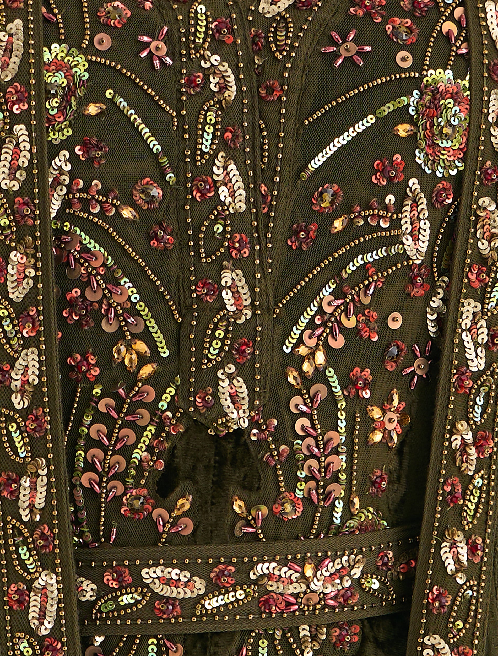 نوع التطريز: تطريز يدوي بخرز وترتر بألوان متعددة من الذهبي والوردي اللامع