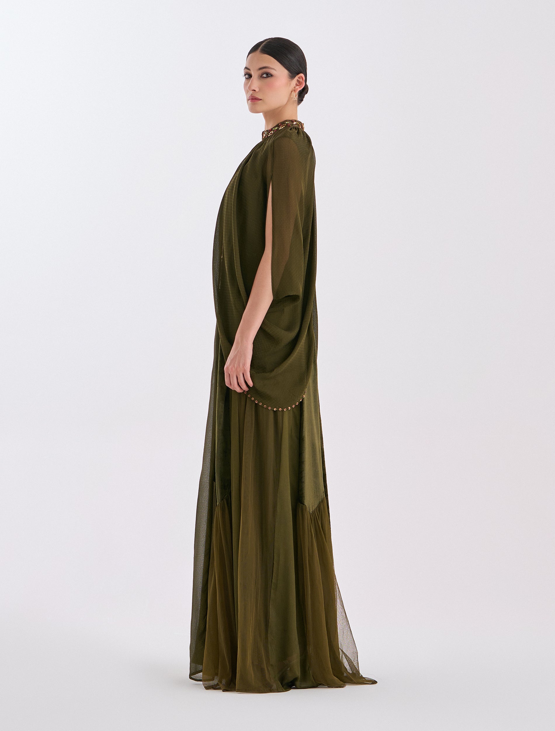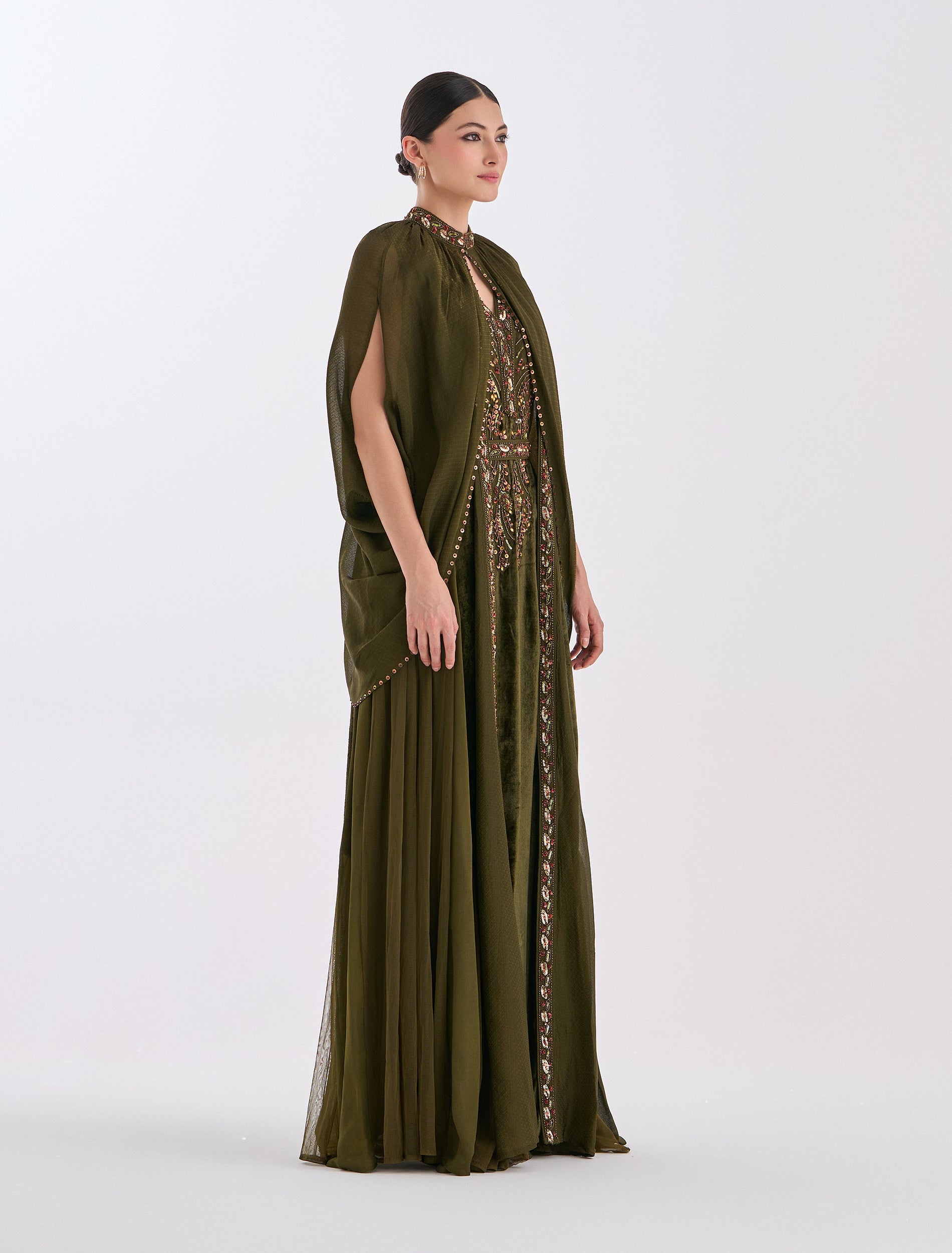 فستان سهرة زيتي طويل بتفاصيل مخمل مع كاب فاخر