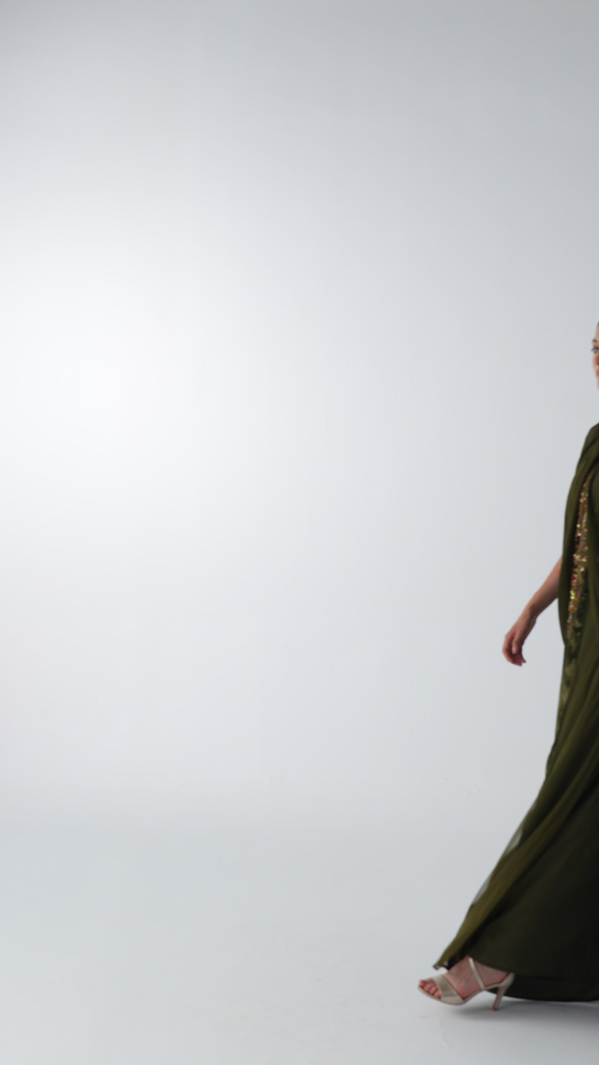 اطلبي أرقى فساتين شتاء 2025، فستان سهرة زيتي طويل مع كاب قصير من التول بتصميم أنيق وناعم من شالكي.