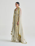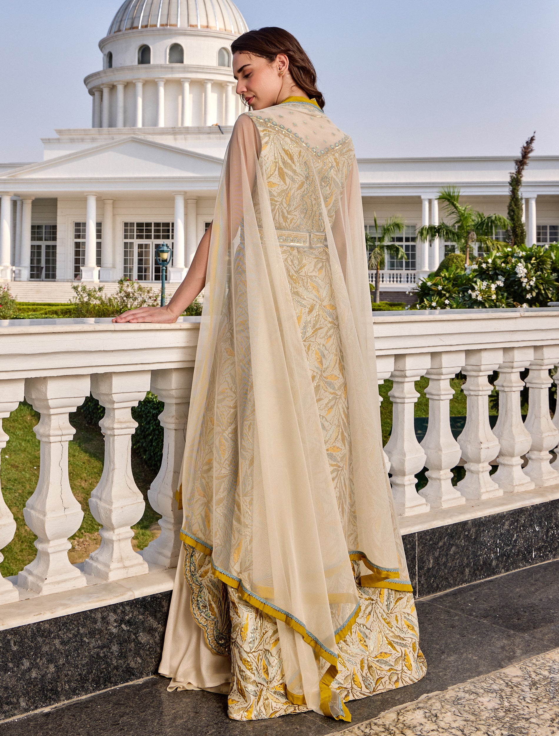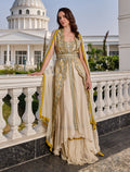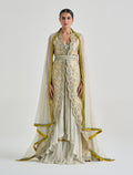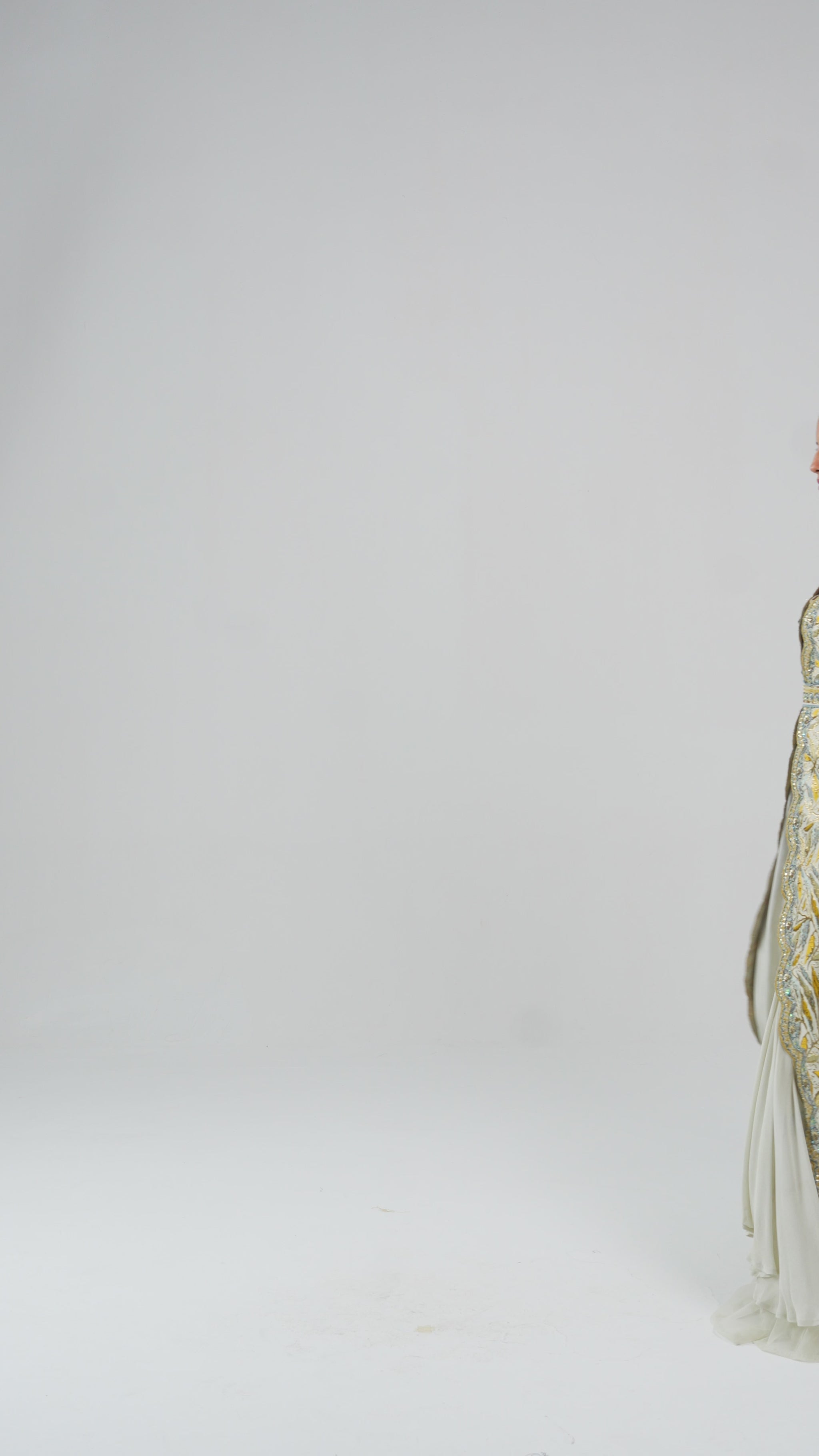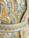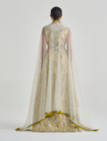 فستان هوت كوتور سهرة المطعم بتطريز يدوي متقن بألوان ذهبية وزرقاء تمنح حضورًا ملكيًا. تصميم فستان سهرة مع كاب يمنح الفستان حركة جذابة مع قصة أمامية مفتوحة تظهر التفاصيل الراقية. خيار مثالي لحفلات المساء والمناسبات الراقية لمن تبحث عن فستان حفلات استثنائي.